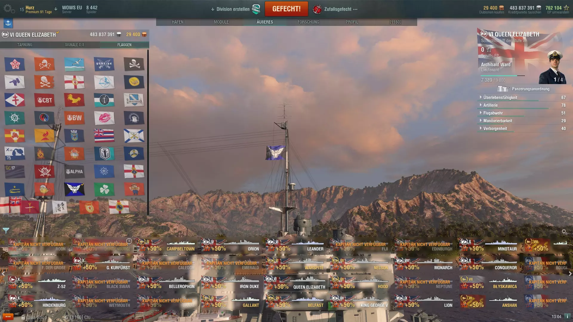 信号旗:存在多种信号旗,每艘战舰在战斗中最多可携带8个(航空母舰仅可携带4个)。这些信号旗具有多种效果,例如可以提供额外的银币和经验值加成、略微提升战舰航速,或增加对敌舰造成起火的几率。信号旗在每场战斗后会消耗,需要进行补充(可设置为自动补充)。
