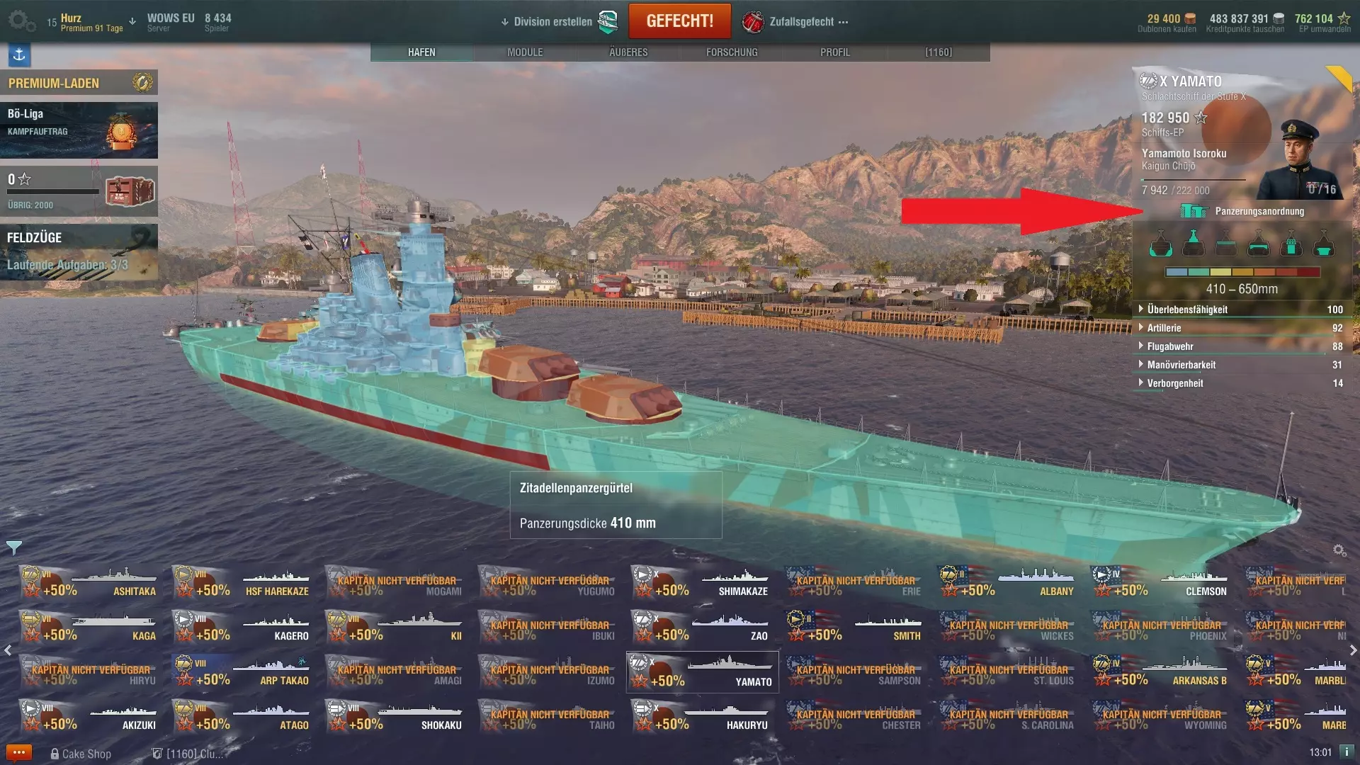 并非所有类别都能在所有舰艇上看到,因为有些舰艇配备鱼雷,有些则没有,而航空母舰没有主炮,但舰上搭载有战斗机和轰炸机。 生存能力:舰艇的生命值(也称为结构值) 装甲:舰艇承受伤害的能力 鱼雷防护 飞机:中队数量 机库容量 战斗机、轰炸机和鱼雷轰炸机概况:航空母舰的战斗力如何 火炮:主炮的数量和类型 副炮的数量和类型 射程:舰艇火炮的伤害潜力有多高鱼雷 鱼雷发射管数量 鱼雷射程 鱼雷速度 舰船鱼雷的潜在伤害值有多高。 防空 防空炮数量及类型(按口径排序) 舰船对空防御能力如何。 机动性 航速 转向半径 舵机换挡时间 舰船的速度和灵活性如何。 隐蔽性 被舰船发现距离 被飞机发现距离 被锁定距离 烟幕中开火时的可见度 舰船被发现的难易程度。 舰船的评分范围为0到100,但这并非绝对值,而应相对其他舰船来看待。一艘防空值为10的舰船几乎无法击落敌方飞行器,而防空值为80的舰船则会像苍蝇拍一样高效。不过,之后值得仔细研究一下,因为真正的优缺点都隐藏在细节中,两艘数值相同的舰船实际表现可能截然不同。例如,高生命值低装甲的舰船可能与低生命值高装甲的舰船拥有相近的数值评分,但这在游戏中需要配合相应的玩法才能体现出来。此外,100并非上限,因为还可以通过强化等方式提升。即使船只在相关领域已达到满分,其效果依然良好——只是不再显示。因此,该评分更多是作为参考而非精确的战斗力评估,但至少能指出优势和劣势。 4.4 船只装甲 游戏中的每艘船都有装甲保护,自然地,低级和小型船只的装甲通常比科技树末端的大型战列舰要薄弱。要确定一艘船的防护情况,在港口的装甲布局界面中,有一个覆盖在船只上的彩色图示,可以提供清晰的概览。
