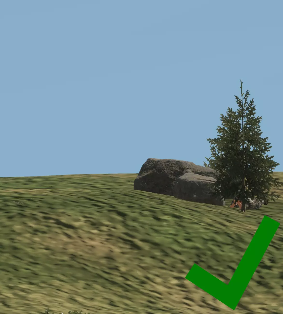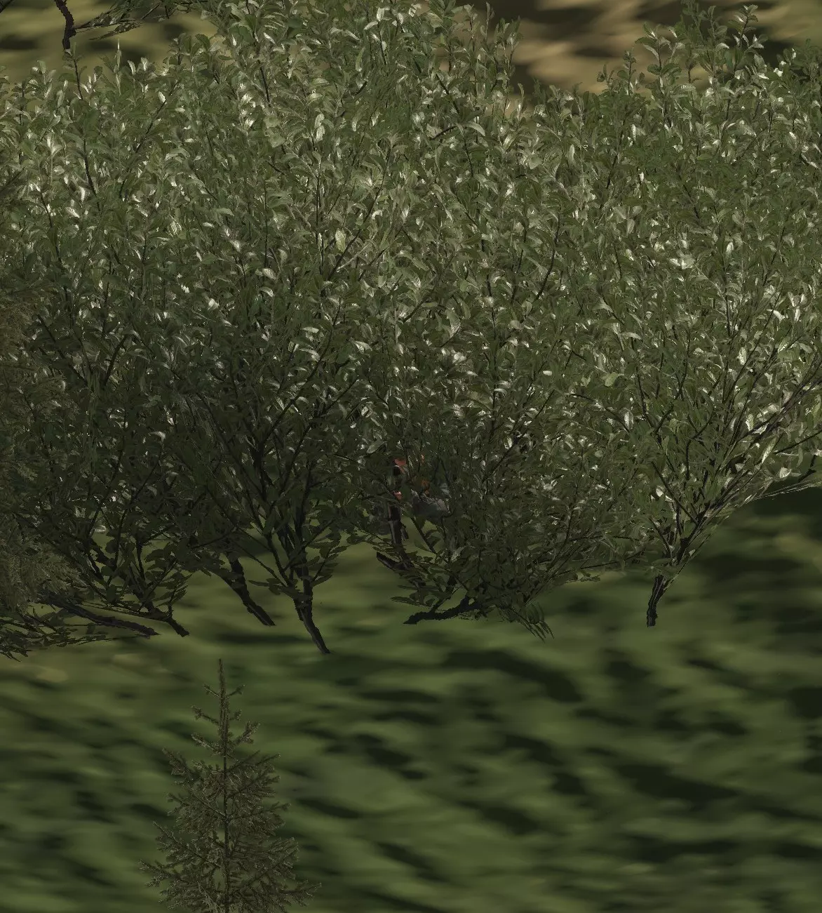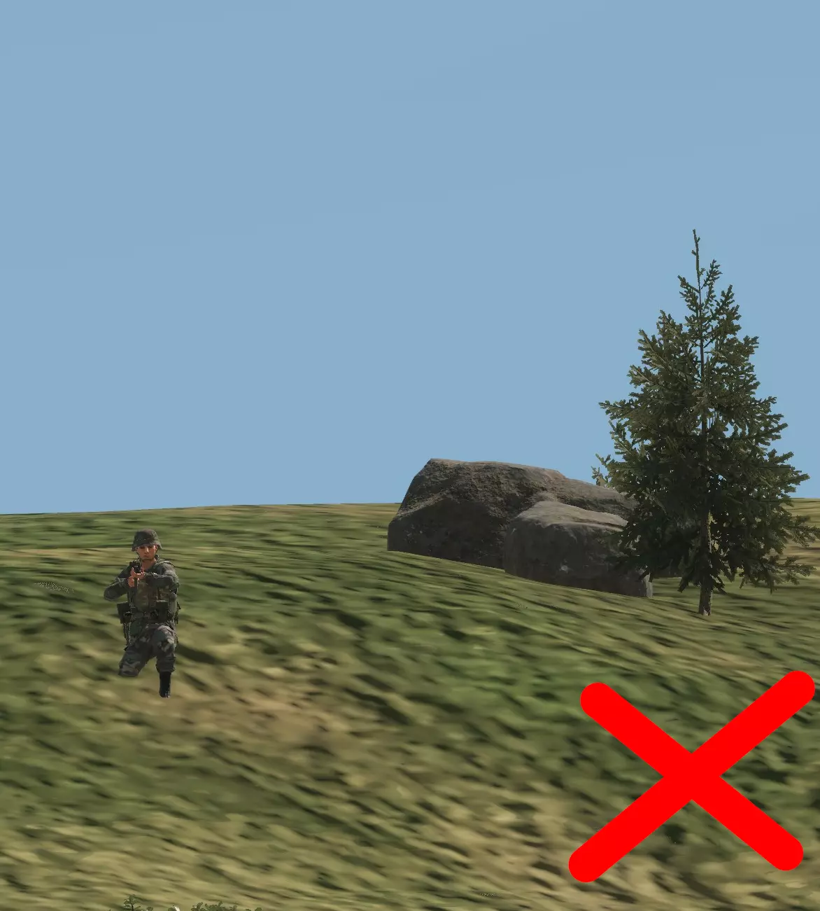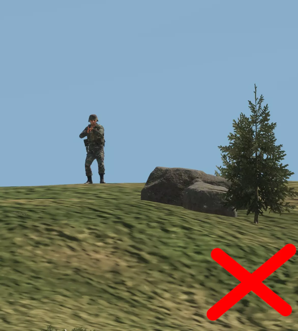 如图所示,每一名【老鼠】都必须注意,不要让自己的轮廓与所处的任何背景形成鲜明对比。以天空为背景形成的天际轮廓是最糟糕的剪影情况,但与地形形成对比也仍然存在问题,应尽可能避免。 成为剪影的【老鼠】就是死路一条。 注意:你可能会问,影子在哪里?草在哪里?为什么画面看起来这么糟糕?我这里是用最高设置运行游戏的;这就是《武装突袭》系列游戏对远距离物体的渲染方式。请记住,这款游戏也在Xbox和PS5平台上运行,对这些平台来说,画面看起来甚至更糟! 游戏只会渲染一定距离内的影子,因此你只能在该范围内依赖影子。考虑到主机玩家和调整设置的玩家,通常最好完全不要依赖阴影。在你的屏幕上看似隐蔽的东西,在设置或视距不同的敌人眼中可能完全暴露。 那么,我们如何解决这些轮廓暴露和天际线暴露问题呢? 隐蔽。 — 隐蔽 隐蔽能保护你避免轮廓暴露,因为它会利用树篱、树木等遮挡人体的形状。我们来看一下: