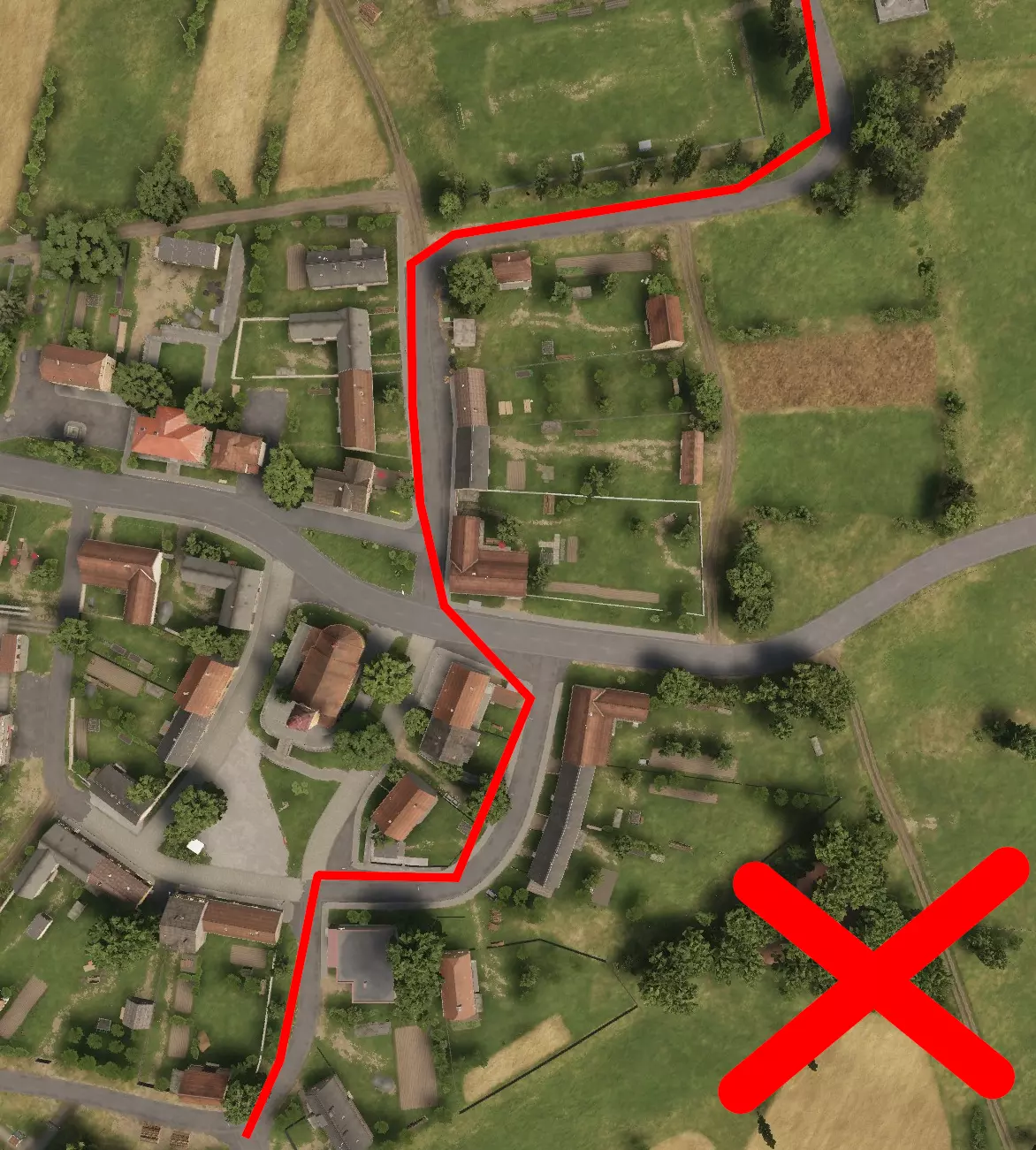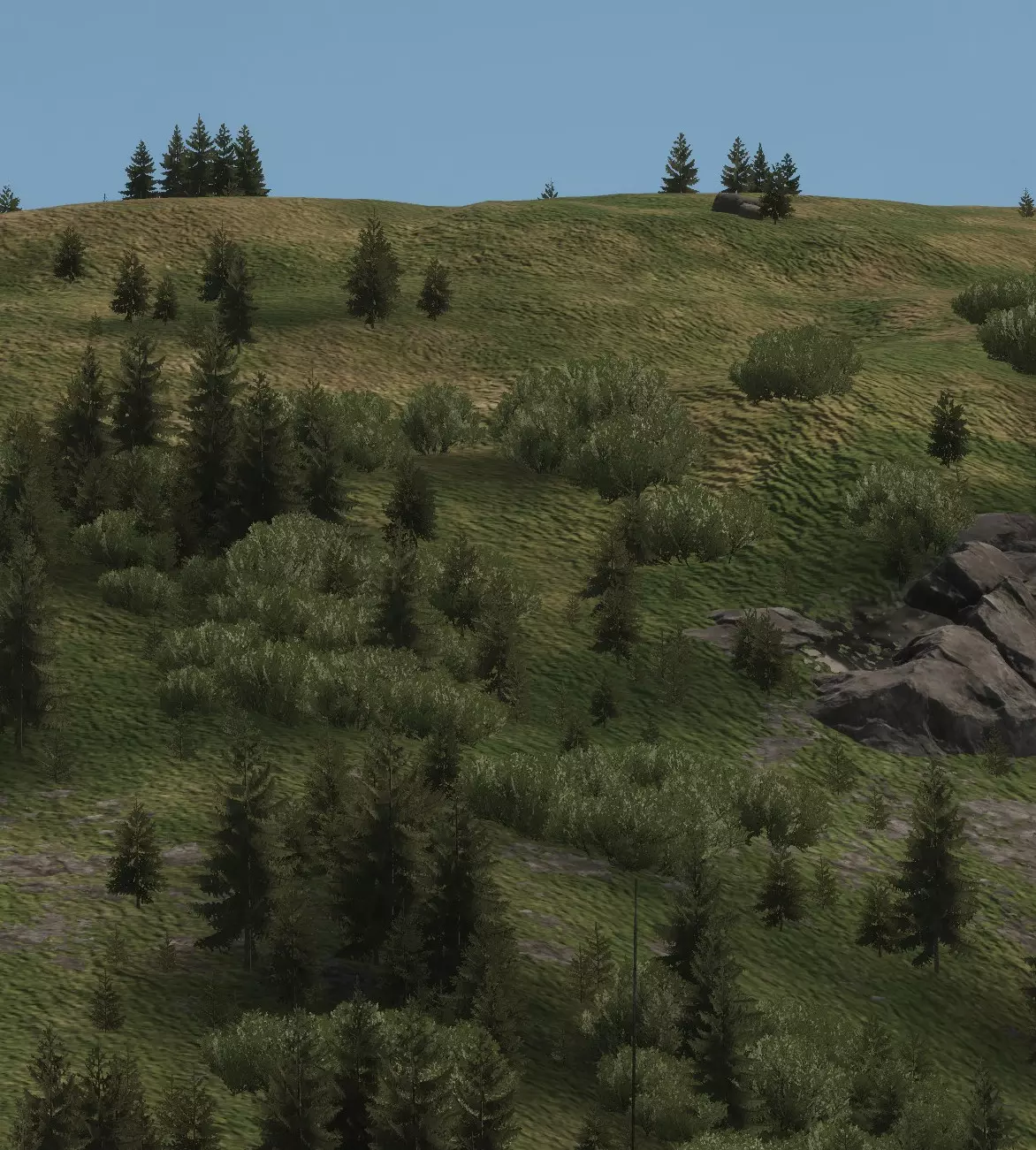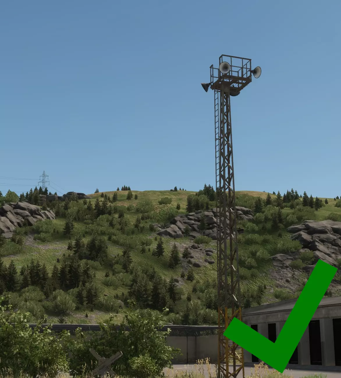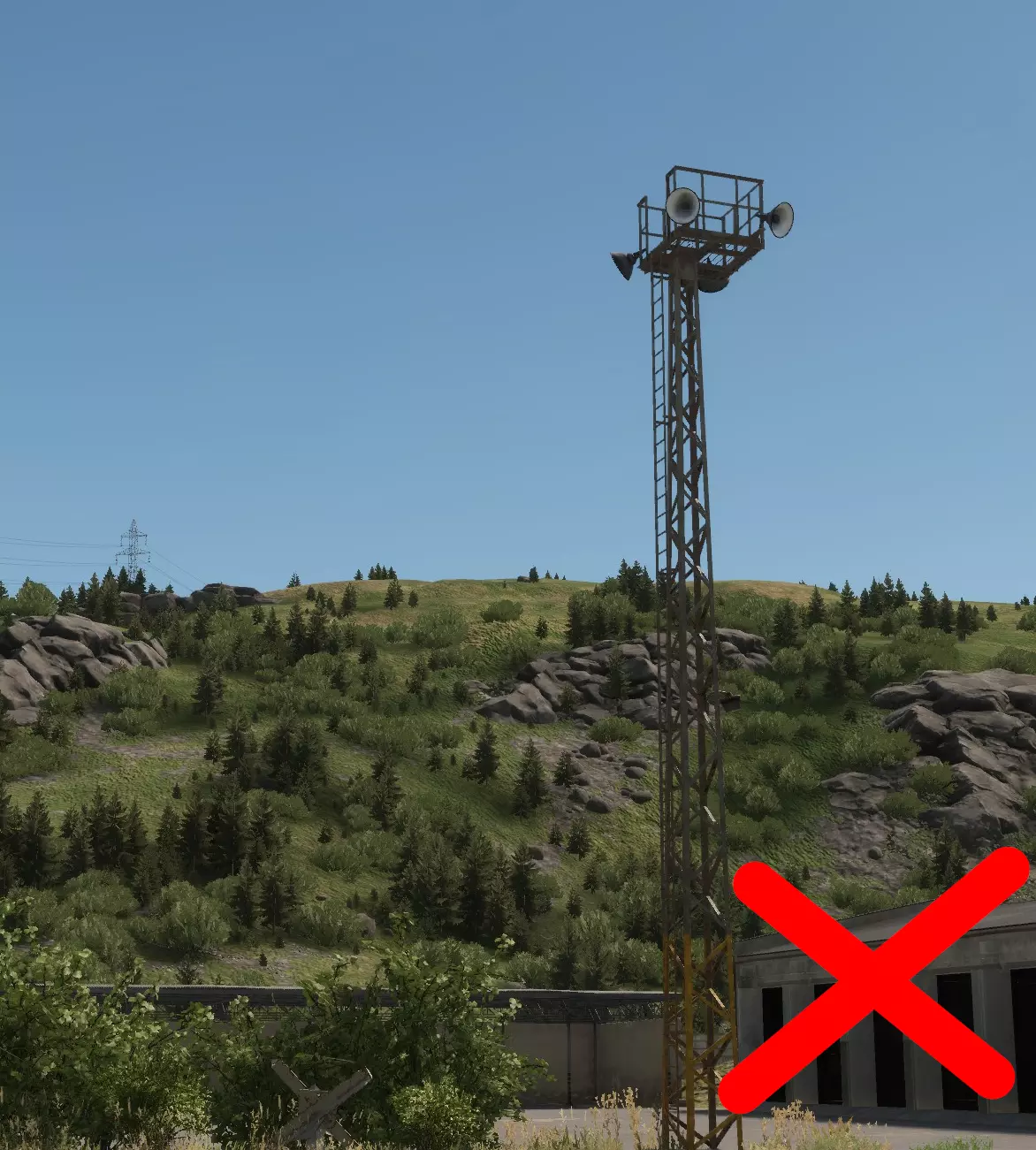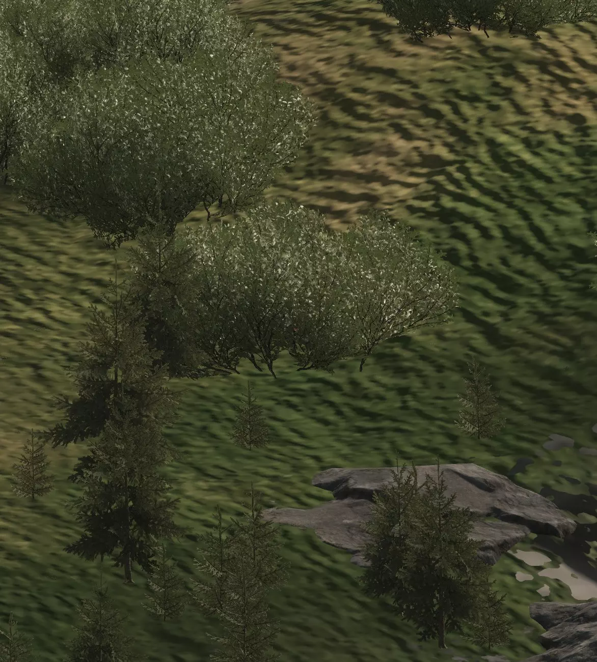 如图所示,每一名【老鼠】都必须注意,不要让自己的轮廓与所处的任何背景形成鲜明对比。以天空为背景形成的天际轮廓是最糟糕的剪影情况,但与地形形成对比也仍然存在问题,应尽可能避免。 成为剪影的【老鼠】就是死路一条。 注意:你可能会问,影子在哪里?草在哪里?为什么画面看起来这么糟糕?我这里是用最高设置运行游戏的;这就是《武装突袭》系列游戏对远距离物体的渲染方式。请记住,这款游戏也在Xbox和PS5平台上运行,对这些平台来说,画面看起来甚至更糟! 游戏只会渲染一定距离内的影子,因此你只能在该范围内依赖影子。考虑到主机玩家和调整设置的玩家,通常最好完全不要依赖阴影。在你的屏幕上看似隐蔽的东西,在设置或视距不同的敌人眼中可能完全暴露。 那么,我们如何解决这些轮廓暴露和天际线暴露问题呢? 隐蔽。 — 隐蔽 隐蔽能保护你避免轮廓暴露,因为它会利用树篱、树木等遮挡人体的形状。我们来看一下: