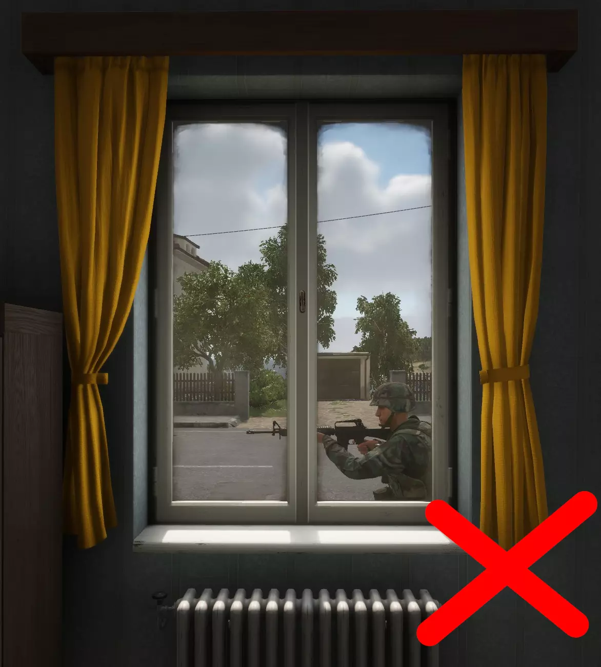 — 穿越窗户时 窗户是明显的危险区域,最常见的错误是在一楼窗户处将头部和胸部暴露给敌人。在可能的情况下,尽量靠近建筑物边缘并保持低姿可以减小你的轮廓。你可以通过蹲下轻松做到这一点,这样即使是蹲跑时,通常也能处于窗户水平线以下。