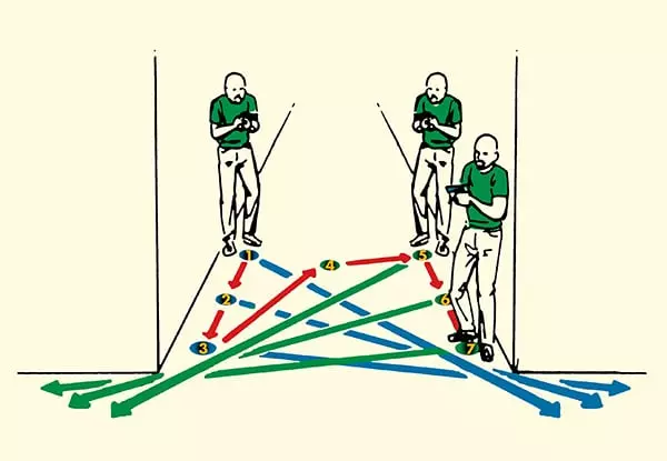 — 预瞄拐角 在本指南的下一部分,我们将讨论在近距离战斗中,主动出击如何赢得大多数交火。预瞄拐角或角度就是这种战术的典型例子。 预瞄指的是当你从掩体侧身而出时,开始向敌人所在的位置开火。当你暴露自己时,你已经在向敌人射击了。不言而喻,全自动武器非常适合这种技巧。 这是竞技射击游戏中的一项可靠技巧,预瞄结合敌人看到你到扣动扳机之间的反应延迟,再加上服务器/客户端延迟,能让你占据优势。如果操作正确,敌人在你进入其视野的瞬间就会被消灭。在他们看来,你一出现,他们就会莫名其妙地死亡。 如果你知道有敌人在等着你,那么在进入时提前开火是一个让等待的防守者陷入不利局面的好方法。 ——清理T型拐角 T型拐角是建筑物内外最危险的地形特征之一。在你暴露自己之前,你无法看到左右两边,而敌人可能已经瞄准好,在任意一侧埋伏着。 如果你知道有机会可以简单地避开这种情况,并移动到一个不会让你处于如此不利地位的位置,那么你就应该这样做。 大多数玩家会盲目地冲向一侧,并因此丧命。更聪明的玩家会逐渐观察两侧的弧线,依次只暴露每个区域的一小部分,如下所示: