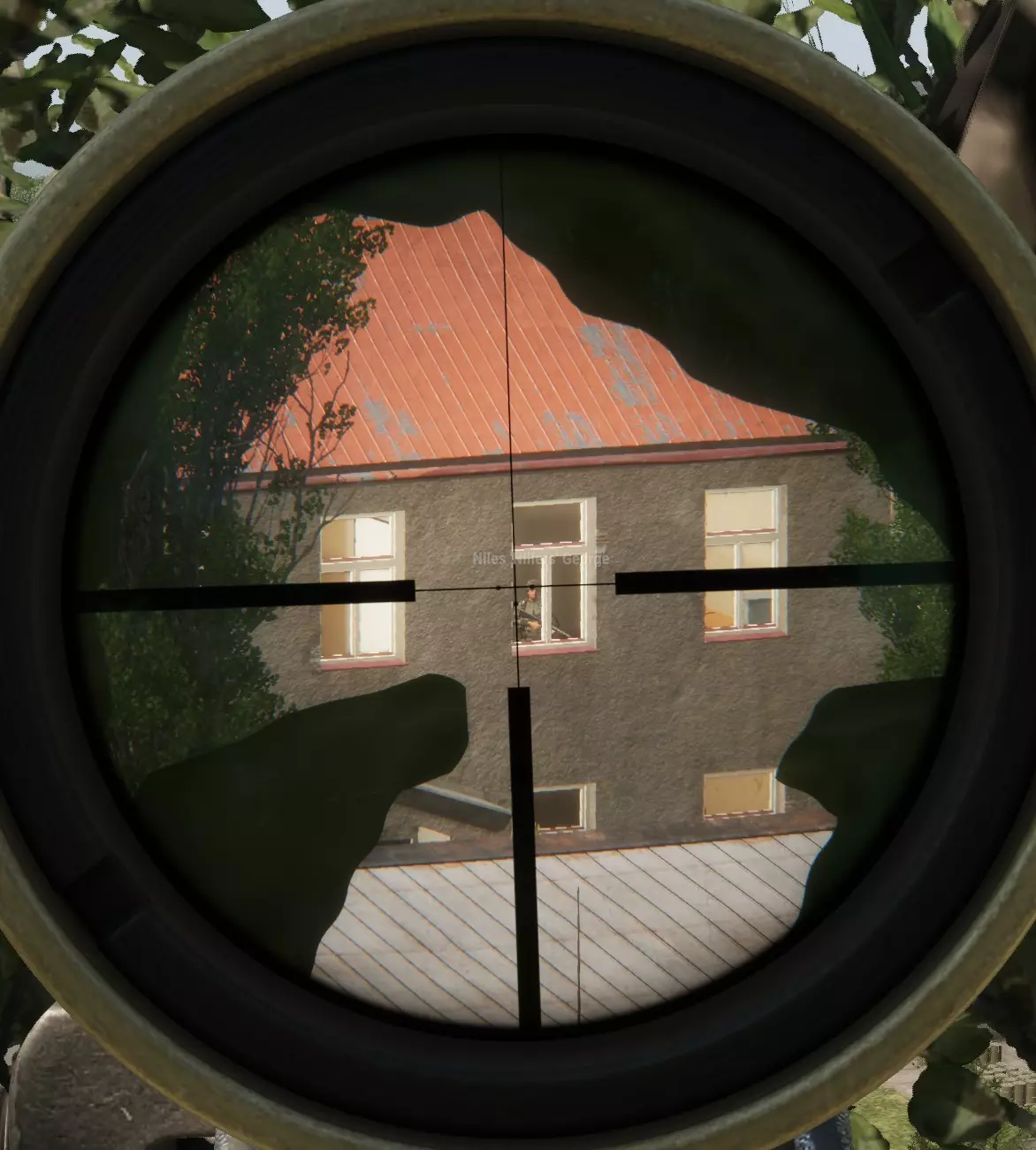 这是奈尔斯。 不幸的是,正如你所见,有一名狙击手正透过窗户瞄准他。奈尔斯显然没看过本指南,他把大半个身体都暴露在了窗户里,所以就算狙击手没打中他的头,也能击中他的身体。可怜的奈尔斯。 奈尔斯面临的问题是,狙击手的位置大概在这里: