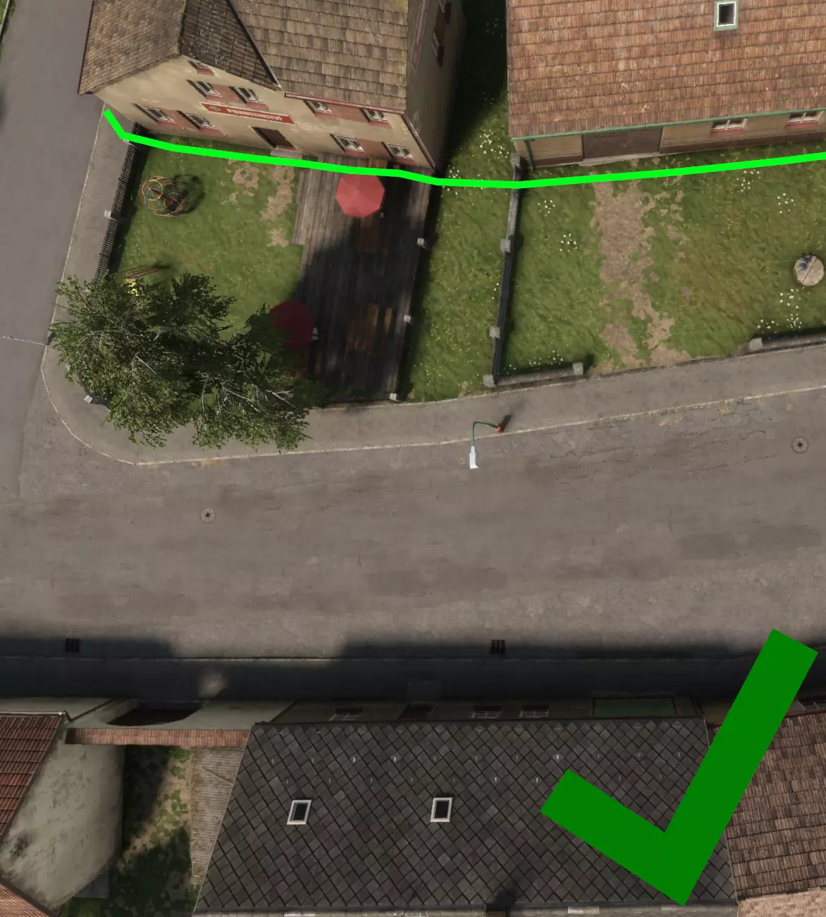 绿色路线会带你绕到房屋后方,你可以利用简易掩护,必要时还能从后门进入房屋。这里有树篱、树木、围栏和花园家具,能提供更多掩护和隐蔽。行进时要紧贴树木和隐蔽处,一旦被发现,你会有相对容易的逃生选择,而且在城镇内需要时,躲进房屋也最方便。没错,这条路线花费的时间更长,但如果你评估敌人存在的风险不为零,就应该慢慢来。 ——与建筑物平行移动 你可能无法总是将建筑物的后方或内部作为前进路线,有时可能被迫沿着街道在建筑物外侧行进。如果是这样,你应该沿着建筑物边缘平行移动。 然而,如果你明确知道敌人位于街道的某一侧,且无法通过对面建筑物后方的其他路线绕行,那么理想情况下,你根本不应该执行此机动。在有争议的城市区域进行街道层面的移动,对于单独行动的人员来说风险极高,应尽可能避免。 如果别无选择只能继续前进,你需要慎重决定使用道路的哪一侧。与直觉相反,你应该选择敌人可能所在的同一侧。这听起来似乎不对,但另一种选择是当你沿着对面的建筑物边缘潜行时,会给敌人提供一个清晰的目标。相反,直接移动到他们的窗户下方,你就能待在他们的盲区,并且(希望)不被发现。 尽可能待在阴影中,保持越低的轮廓越好,然后迅速移动到下一个位置。记住:这是最后的手段,与其他城市战斗尤其是近距离战斗一样,极有可能暴露或导致死亡。