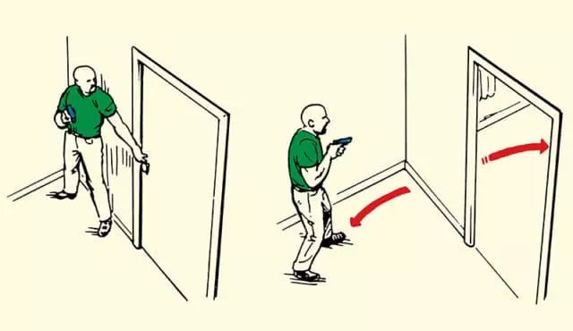 就像现实生活中一样,《武装突袭:Reforger》允许你像图片中所示那样侧着开门。根据门的类型和走廊情况,负责开门的队员(Rat)应立即退后,为后续队员进入房间进行切角观察(有系统地将房间的小部分区域纳入视野的方法)腾出空间。理想情况下,在对房间进行切角观察时,你应在保持能看到房间内部的同时,尽可能远离门口,以减少自己在防守者眼中的暴露面积。进行此操作时不要蹲下,防守者很可能瞄准你的躯干,蹲下会使你的面部直接进入对方的瞄准画面。 ——切角观察 门打开后,你需要在不进入房间的情况下,分小区域清理房间内部,完成切角观察。理想情况是,突击手能够在不进入致命漏斗区域或被迫突入房间的情况下清理房间。突击手沿着门口的外侧弧线逐步移动,如以下所示,慢慢地一点一点地观察到房间更多的区域。