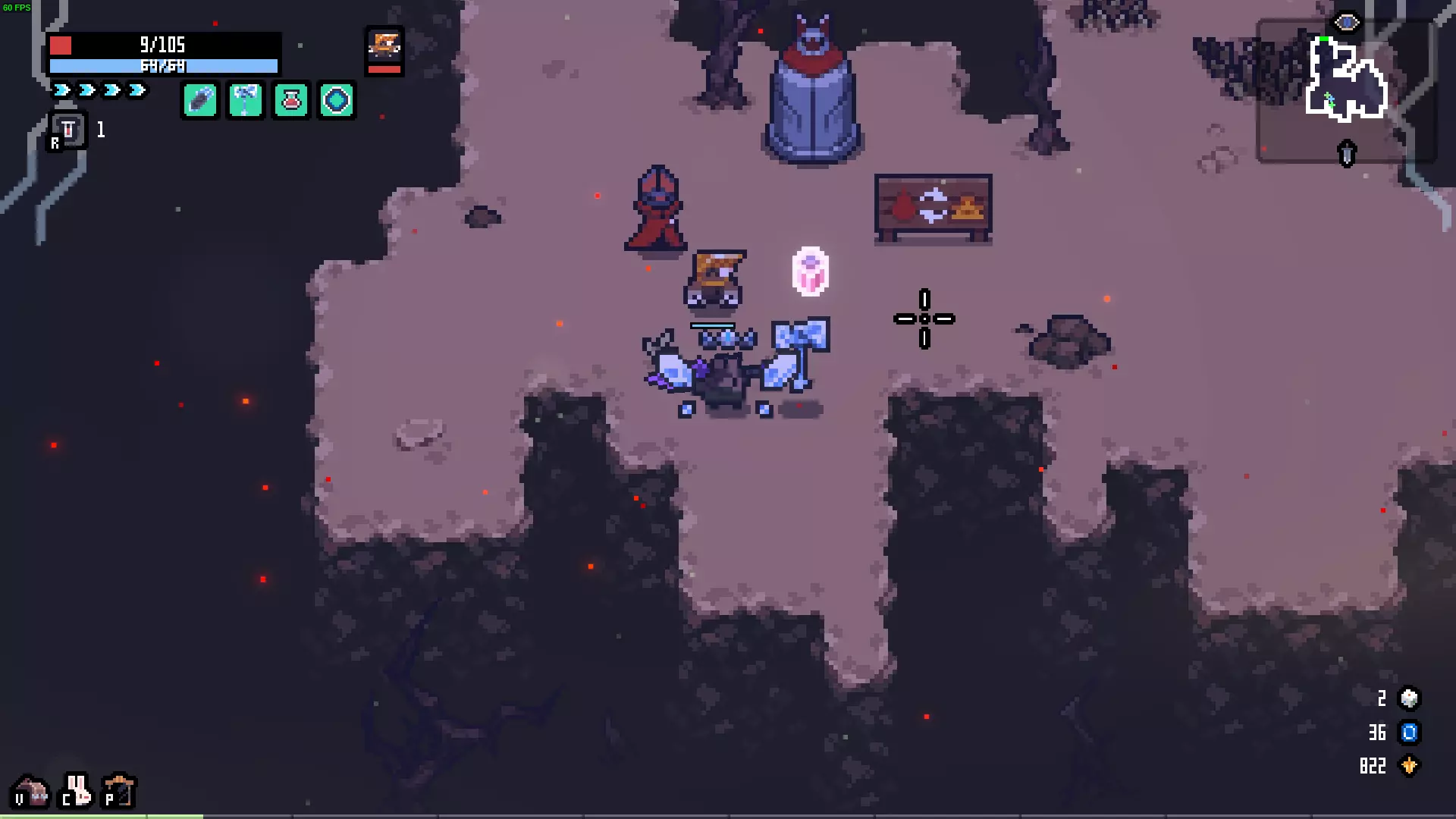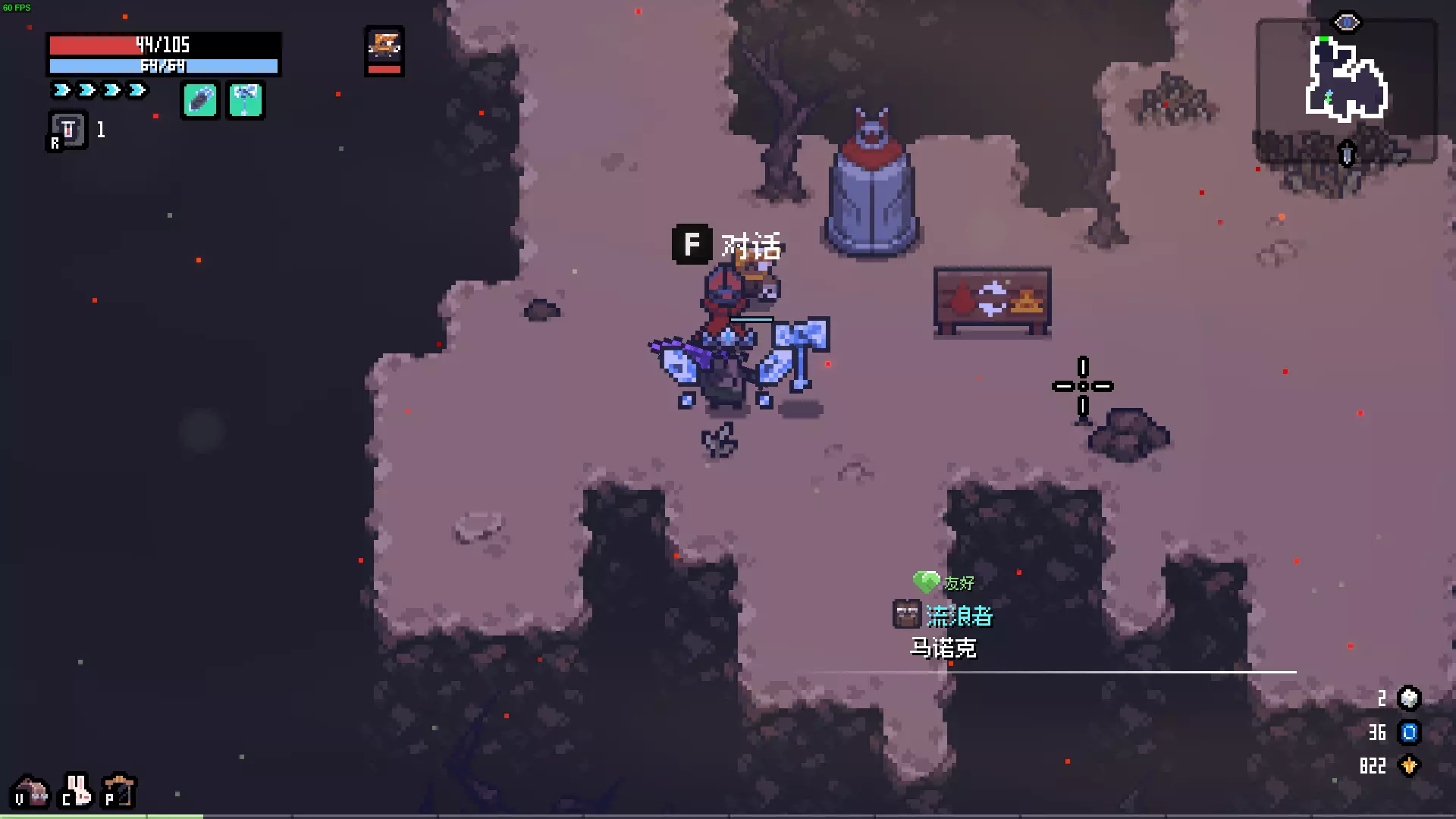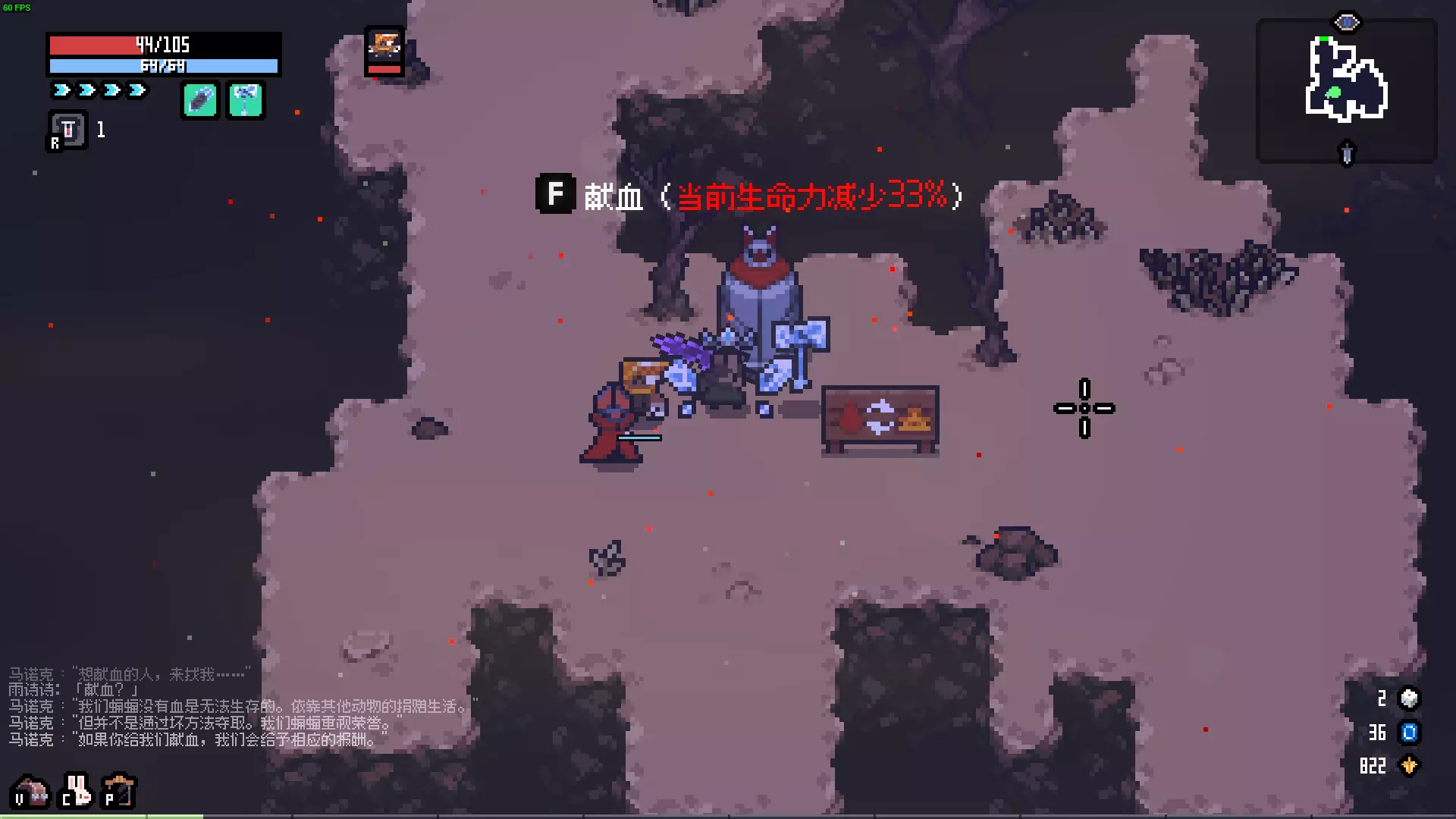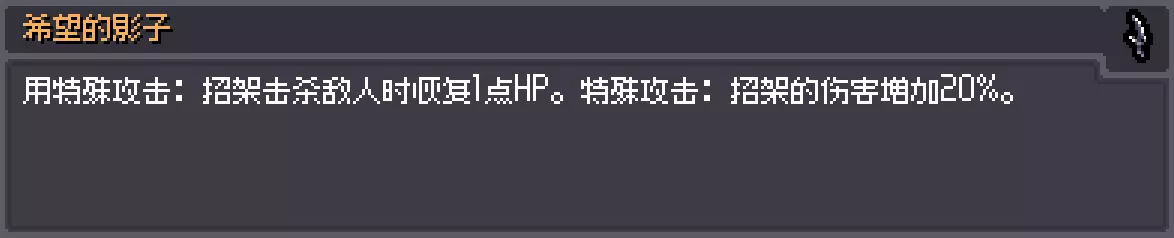 描述:会一点魔法的兔子。 效果:冰属性伤害+5,闪电属性伤害-5。 解锁:一次游戏中将冰属性伤害提升至50。 失去翅膀的蝙蝠 描述:没有获得阳光,反而失去了洞穴,正在寻找同族。 效果:HP偷取+4,冲刺次数固定为1次。 解锁:累计完成蝙蝠献血事件5次。 骷髅