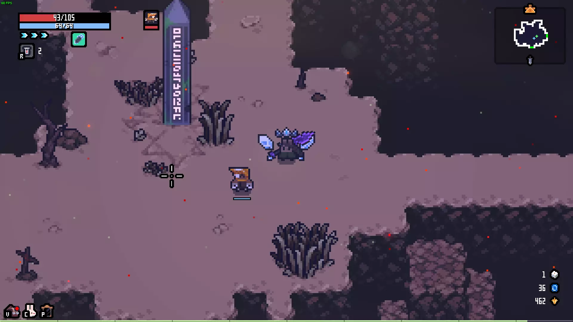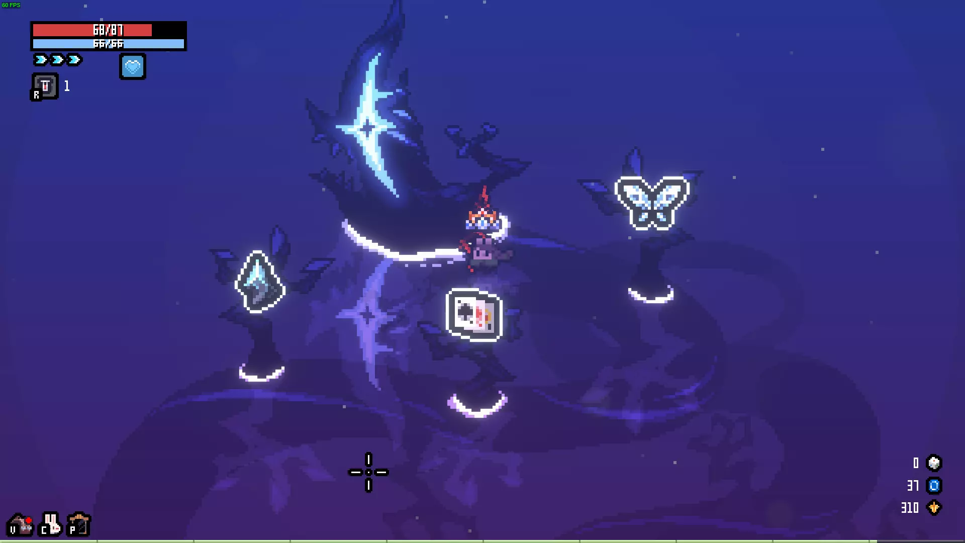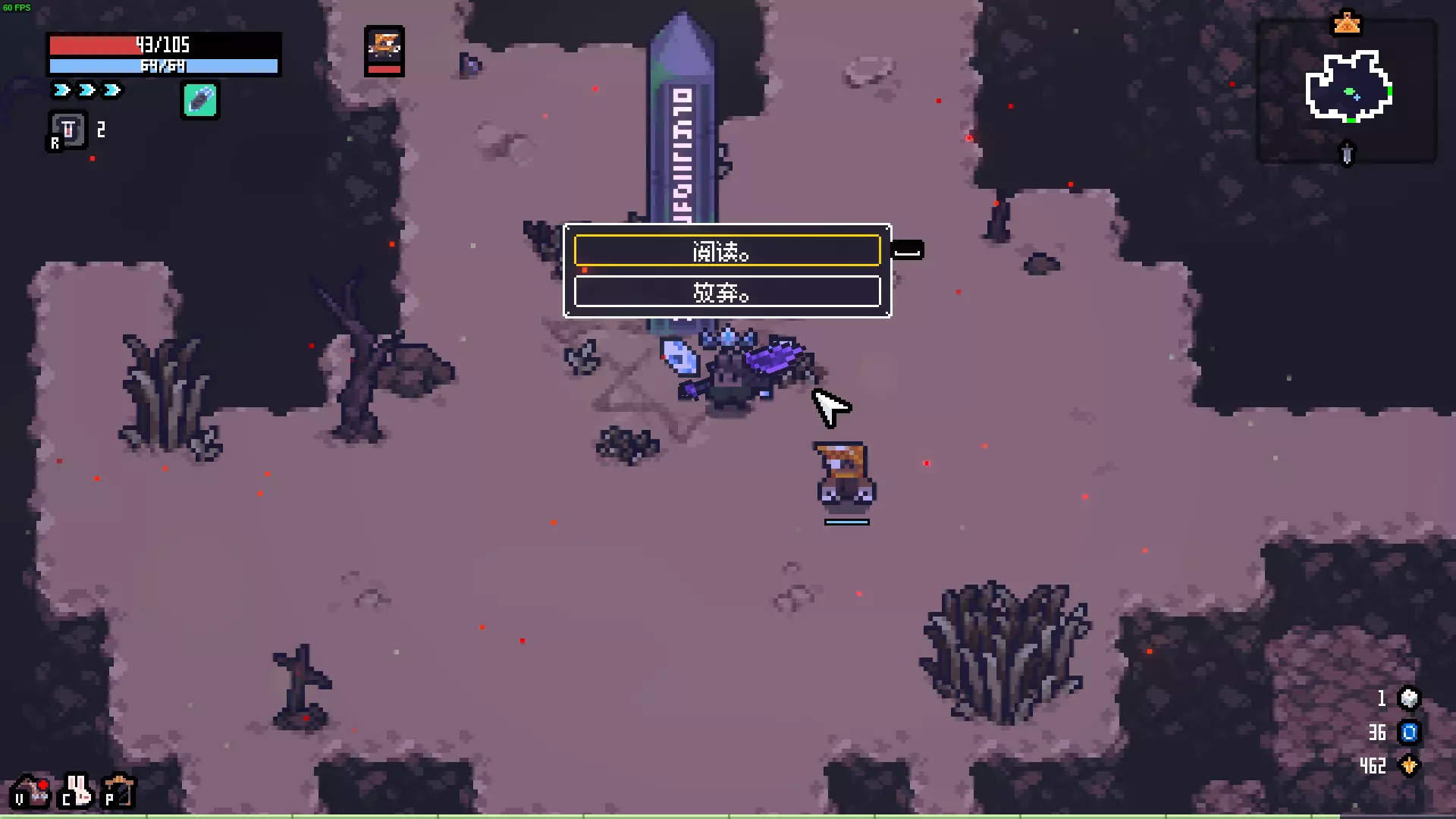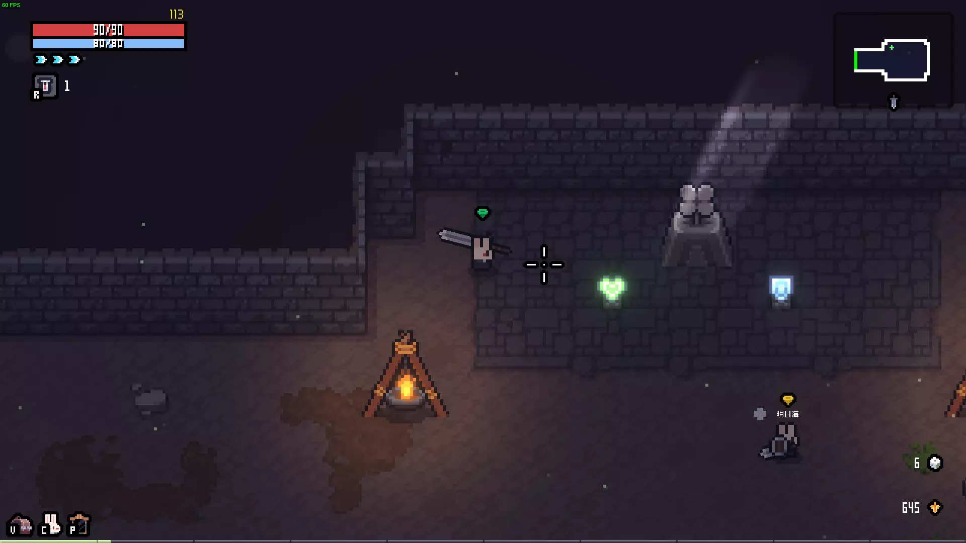 描述:会一点魔法的兔子。 效果:冰属性伤害+5,闪电属性伤害-5。 解锁:一次游戏中将冰属性伤害提升至50。 失去翅膀的蝙蝠 描述:没有获得阳光,反而失去了洞穴,正在寻找同族。 效果:HP偷取+4,冲刺次数固定为1次。 解锁:累计完成蝙蝠献血事件5次。 骷髅