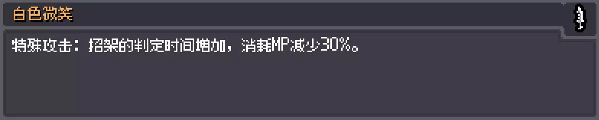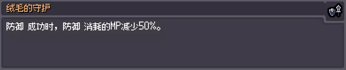 描述:等待与狼命运的相遇。 效果:MP再生+8,最大MP上限-20。 白兔