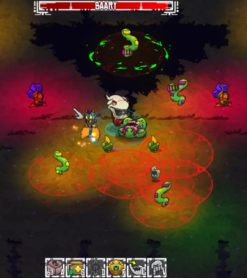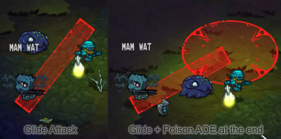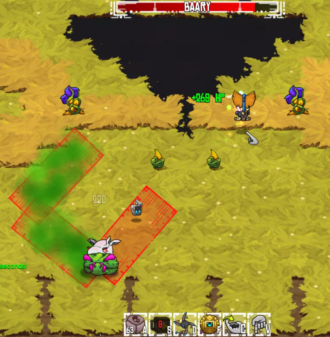 攻击:藤蔓生长+轰炸 当生命值降至约85%时,毒滑阶段开始。巴瑞会制造一条滑行路径(类似滑行章鱼),并在身后留下持续数秒的毒雾区域。在完成滑行后(通常为3-4次),他会短暂停留。这是进行攻击的最佳时机,你的宠物也可以全力输出。此轮攻击结束后,他通常会重新开始该攻击模式。