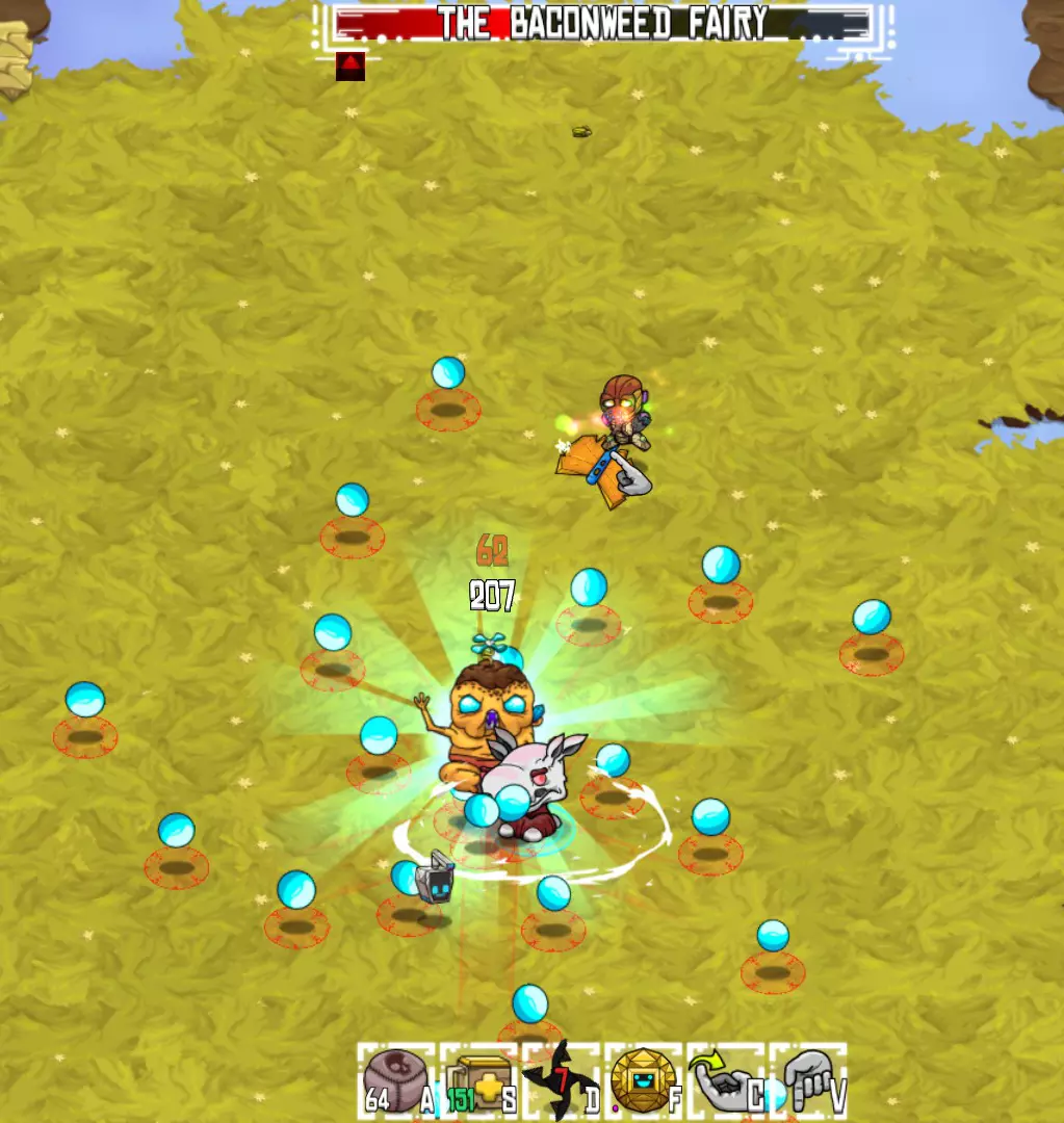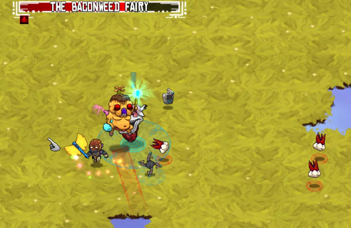 首领战技巧 通用技巧: 尽可能使用多种类型的药水。它们的效果包括减轻元素伤害、恢复生命值以及为自身攻击附加元素伤害。 储备大量炸弹。由于技能栏槽位有限,携带大量同类型炸弹比少量不同类型的炸弹更有用。 使用宠物食品提升宠物的每秒伤害(愤怒煎蛋是你的好帮手)。 装备对自己有利的饰品:例如提升宠物伤害、增加移动速度、提高元素抗性等类型的饰品。 在技能栏中放置:炸弹、生命药水、远程武器、可选物品(可以使用机器人提升生存能力,或使用激光项圈等)。 宠物是最轻松击杀首领的方式。你只需要注意躲避攻击即可。将你的宠物升级到最高等级:每次升级都会提升它的每秒伤害。 每次“对话”阶段结束后,**务必再次攻击 Boss**:这些间隔期间你的宠物会停止攻击。 Dbot 是你的伙伴,它会攻击 Boss 甚至小怪。利用它的无敌能力可以让你免疫一片红色圆圈区域的伤害。如果你中毒了,激活 Dbot 就能停止受到伤害。(此时可以喝一瓶治疗药水!) 别像电视里的反派那样!看到长长的红色路径时,**往旁边移动**,而不是跑到路径的尽头…… 有些支线任务的 Boss 战斗区域位于开放世界。**在开始战斗前,先清理战斗区域周围的小怪**,这样它们就不会增加额外的麻烦。(战斗外)打开物品栏(R键)或暂停游戏会暂停药水的冷却倒计时,并且药水在死亡后也不会消失。因此,如果你在 boss 战中失败,可以轻松通过睡觉恢复状态,然后直接回到竞技场,无需浪费另一组药水。 技术问题:如果你的屏幕因截图等操作而出现“卡顿”或延迟,只需按 Escape 键暂停游戏,让电脑“赶上进度”。恢复游戏后,帧率应恢复正常。 Boss:萨凡纳 注意:所有策略和装备配置均基于“疯狂”难度下的游戏体验。此外,为了获得所有饰品、 gadgets( gadgets)和药水,我在挑战 boss 前完成了所有支线任务。因此,所有 boss 战使用的装备配置相同。装备配置: 饰品:安全护目镜、比克勒、戴维灯、接地器 护甲/武器:黄昏级装备+蝴蝶 快捷栏:碎石炸弹、黄昏治疗药水、手指飞镖、D机器人 使用药水:抗毒药剂、毒液药剂、蜘蛛兽药剂、长寿药剂、挥砍药剂+愤怒煎蛋 宠物:3级旺皮特 培根草仙子是游戏中的首个 Boss,可通过支线任务挑战。(我是在完成草原区域流程的最后阶段去挑战这些 Boss 的,所以才使用了更高等级的护甲等装备。) 攻击方式: 主要攻击:发射大量导弹进行迫击炮轰炸。 次要攻击:培根仙子跳至空中,随后俯冲砸向地面。 回复:进行“培根小憩”,恢复部分生命值。 下一阶段(75%生命值时):发射多枚火箭弹,在屏幕内四处飞舞。下一阶段(25%生命值):发射螺旋状蓝色球体。 策略:(疯狂难度) 注意,培根草仙子在后续阶段会继续使用所有之前的攻击类型。 培根草仙子的主要攻击和次要攻击很容易躲避。确保使用指节镖或其他远程武器攻击,以保持你的宠物持续攻击。培根草仙子会定期进入“培根小憩”状态。此时要通过攻击来打断它!否则,培根草仙子会恢复一定量的生命值。