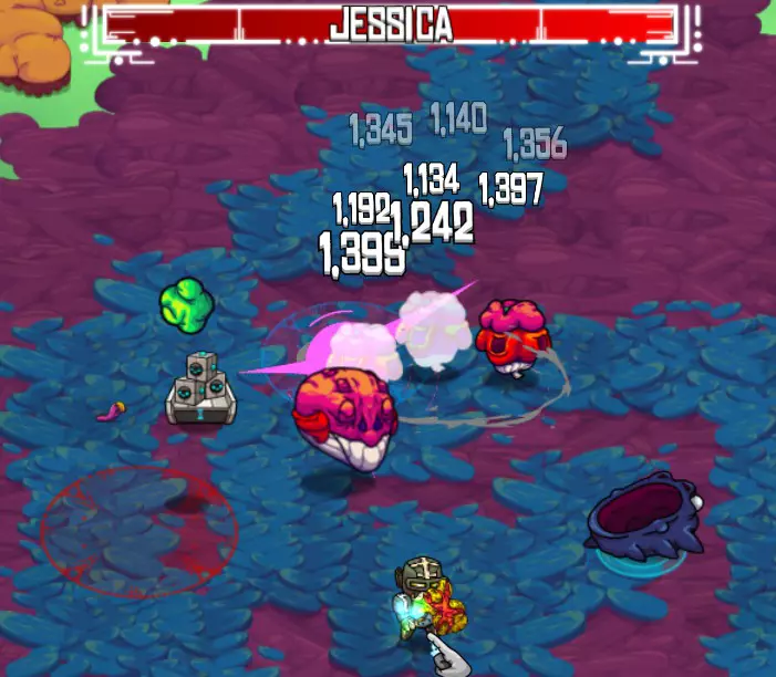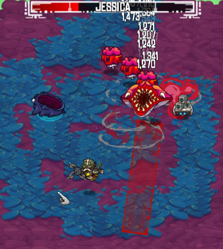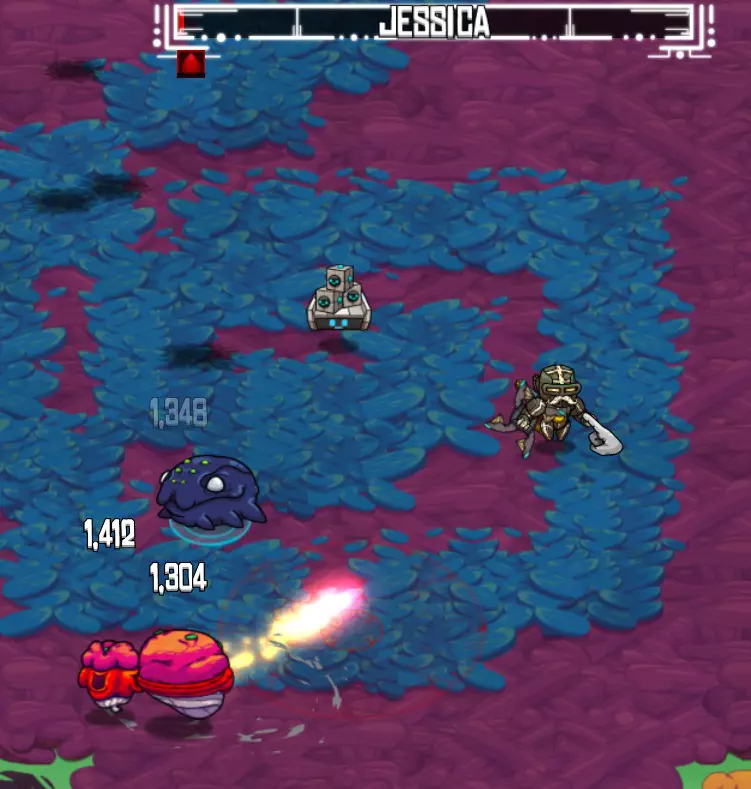 此时,仆从也会加入战斗。它们从地面上的橙色小蛋中出现,外形像扭曲的植物,会向你发射橙色粘液团。它们很快就会消失。 当生命值极低时,杰西卡的身体节段会减少。