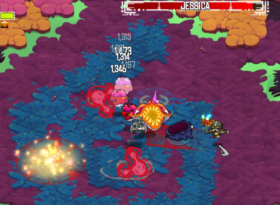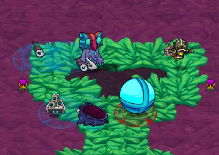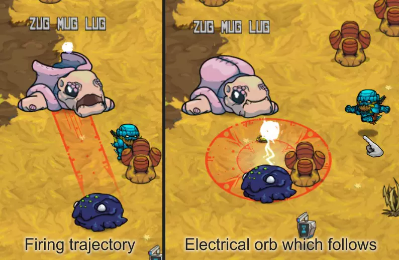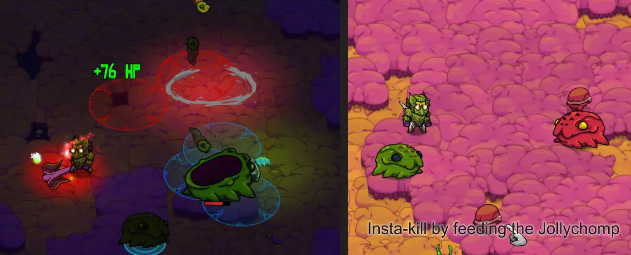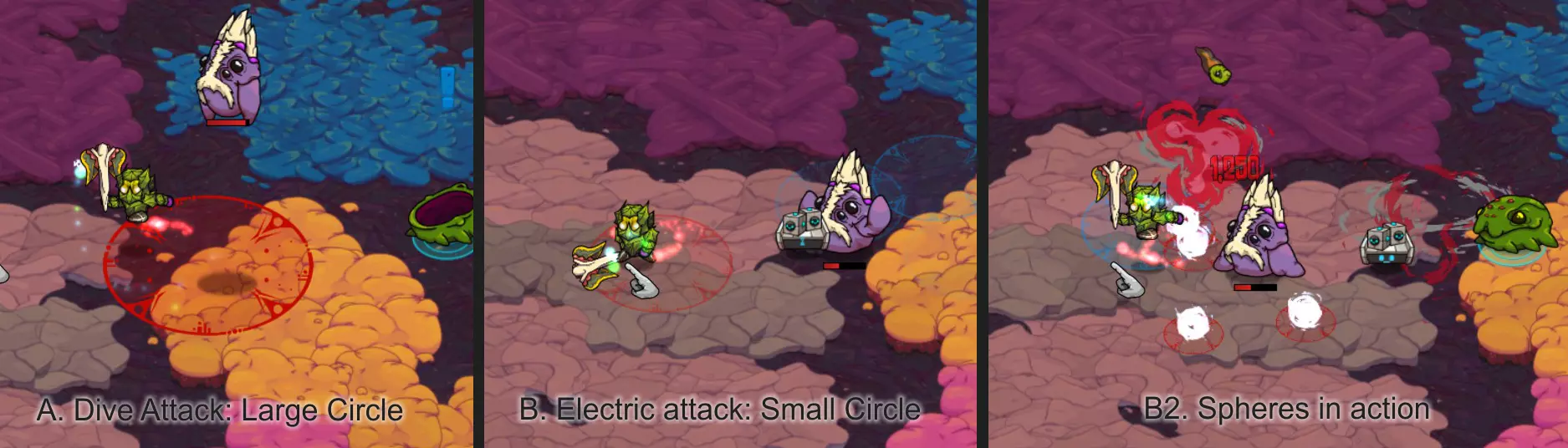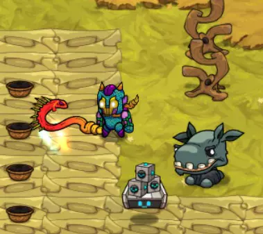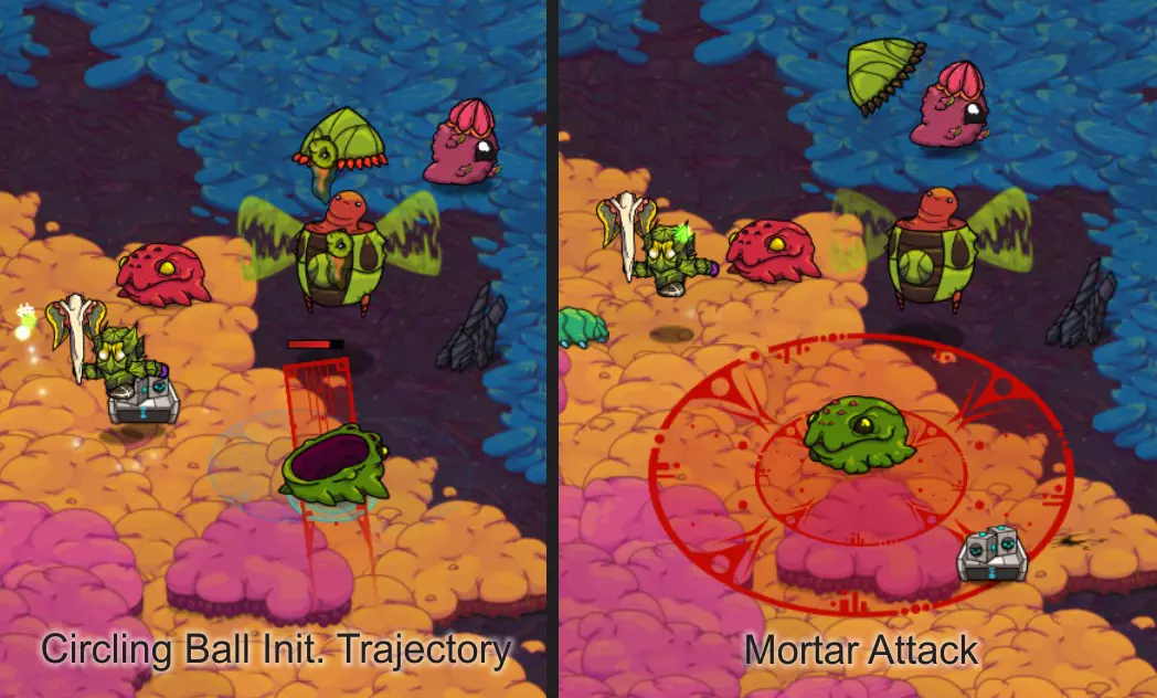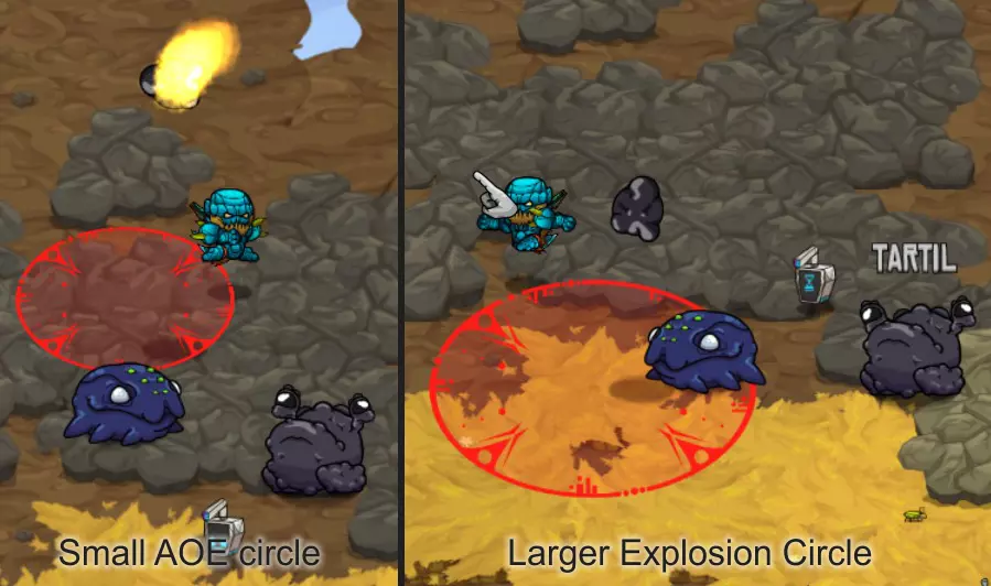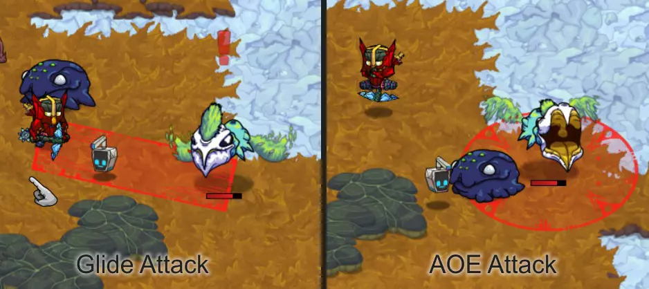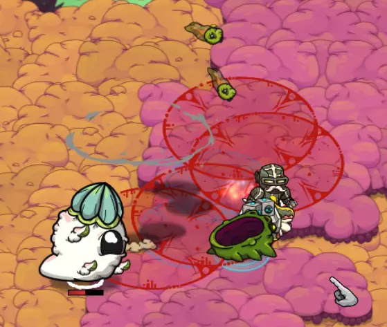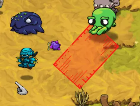 各种类型的炸弹同样使用范围伤害。部分炸弹带有元素属性,且所有炸弹都与你的整体每秒伤害相关。尽可能选择升级版本的炸弹。 初期或游玩较高难度时,坚持使用单一类型的炸弹,选择同一类型怪物的群体。若选择混合群体,将更难预测它们的攻击模式。 怪物群:热带草原 游戏初期……你将开启怎样的冒险! 初期你没有任何宠物可用,因此躲避攻击并抓住时机进行反击至关重要。 一般来说:敌人会显示出它们的攻击线路或区域。当它们发动攻击时,你要确保自己处于红色区域之外。 蹦跳怪:这些家伙是弹跳型的——它们会跳到空中,然后落在红色圆圈标记的位置。对于低等级怪物,你需要刚好站在攻击范围圈外,然后冲进去攻击一到两次,再退出来。 高等级怪物可能会进行多次跳跃——要小心别被压扁!多段跳跃前通常会有比正常情况稍短的蓄力动作。