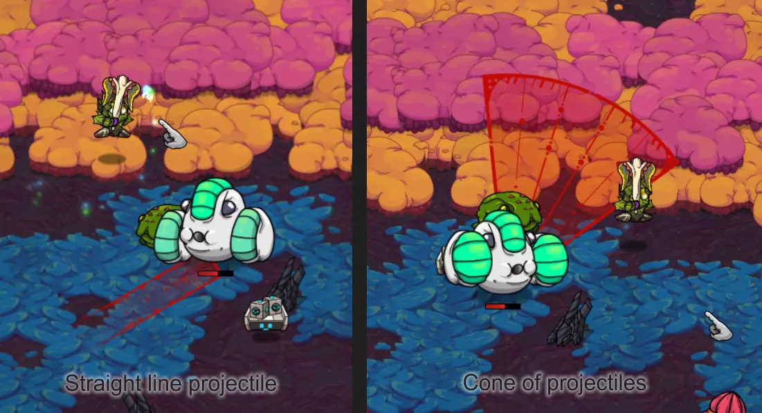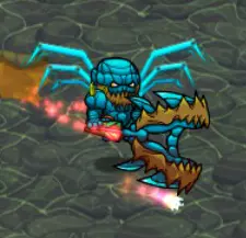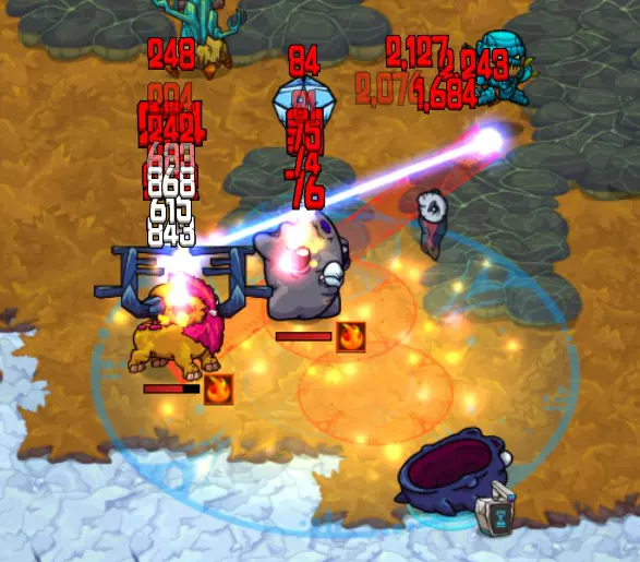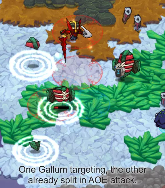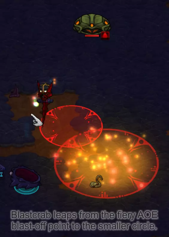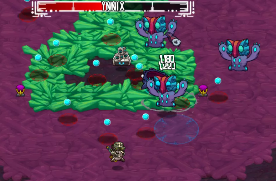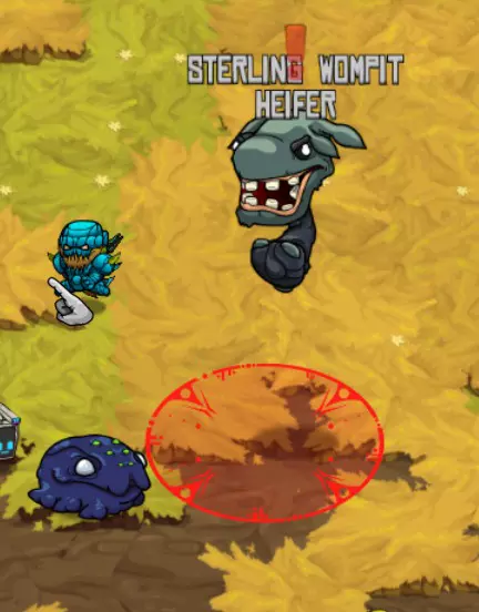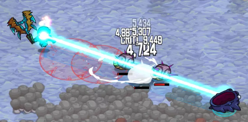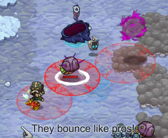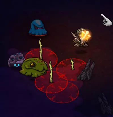 史莱布可以在一些冰封区域中心的淡红色/浅灰色岩石区域找到。史莱布的攻击模式是用红色圆圈锁定你,圆圈会随着你的移动而移动,然后在你逃离时最多再弹跳三次。我发现对付这些家伙最简单的方法是绕圈风筝它们,让你的宠物进行攻击(注意地面上的蓝色战斗范围)。当你到达那个位置时,可以使用激光项圈进行群体击杀,效果非常显著。 注意,史莱布的伤害还包括中毒减益效果,会对你造成持续伤害。