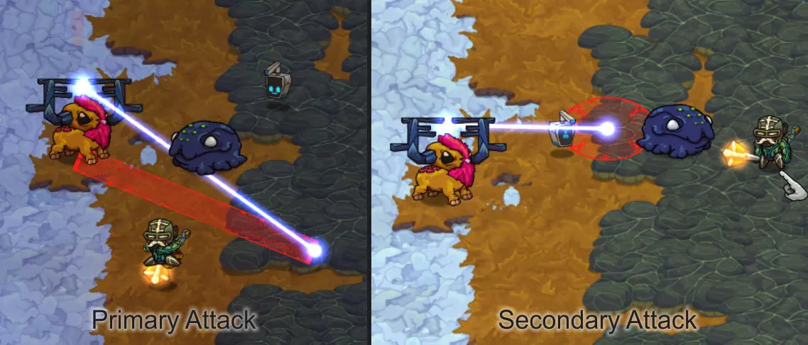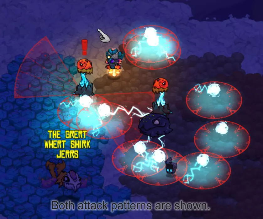 攻击:仆从 确保你的宠物持续攻击。当生命值降至25%时,它会新增一种攻击方式,这种攻击会为攻击模式增加另一个维度:它会在屏幕上跳跃数次。这带来的唯一挑战是它会改变攻击区域的中心。注意:它会跳向你的位置,所以不要离墙壁太近,否则它可能会重新定位到非常靠近墙壁的危险位置,当三激光再次启动时你将无法通过!