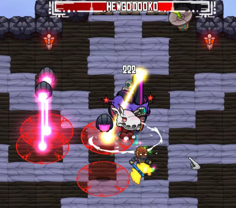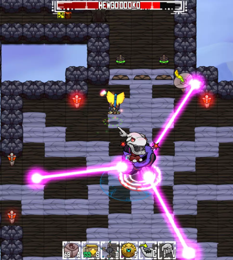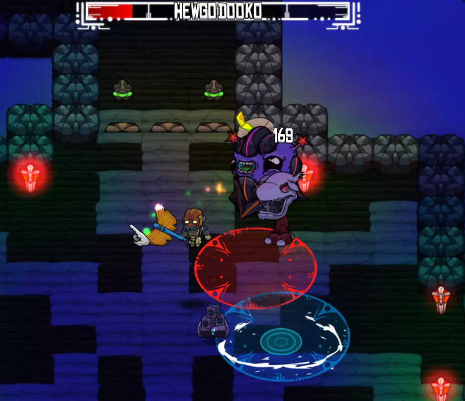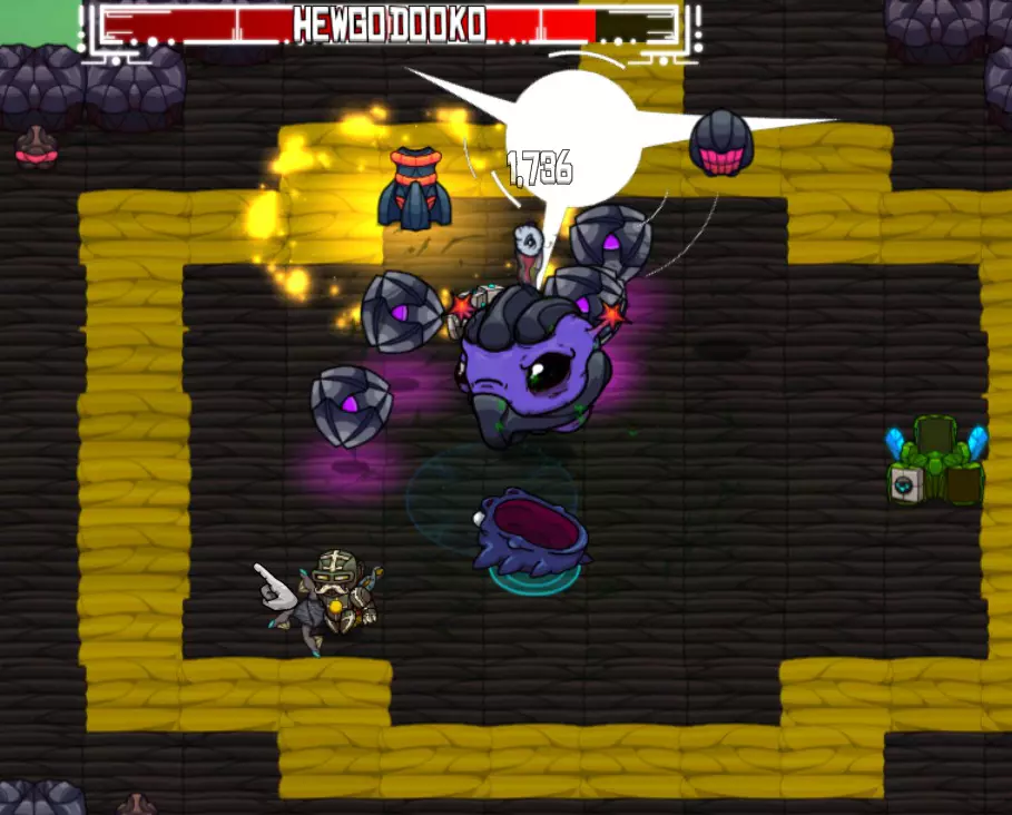 攻击:剧毒滑行 意外接触到毒物会附加一个大幅削减生命值的减益效果。快速使用Dbot可以让我在不受伤害的同时恢复至满血。 奖励:电击棒(饰品:10%几率造成电击伤害)、水银蝙蝠靴(饰品:+5%移动速度)、邪眼(家具)。 HewgodookoHewgodooko(简称Hewgo)是 biome 区域的关底 boss,你会在主线任务的末尾遇到它。必须击败它才能继续游戏进程。 攻击方式: 主要攻击:缓慢激光,会在地面上缓慢移动。 次要攻击:三束激光:从身体发射出三道光束,按顺时针或逆时针方向旋转。 下一阶段(75%生命值):小怪会在屏幕上移动,并向自身正下方发射激光。下一阶段(25%生命值):休戈在场地内跳跃。 策略: 主要攻击很容易躲避:激光移动非常缓慢且攻击范围小。次要攻击更致命——三道激光会随机顺时针或逆时针围绕休戈身体旋转。保持靠近中心位置,因为移动距离更短。你甚至可以在绕圈移动时用近战武器攻击休戈。确保你的宠物始终对他进行攻击!(使用远程武器或炸弹来保持宠物的攻击兴趣)。