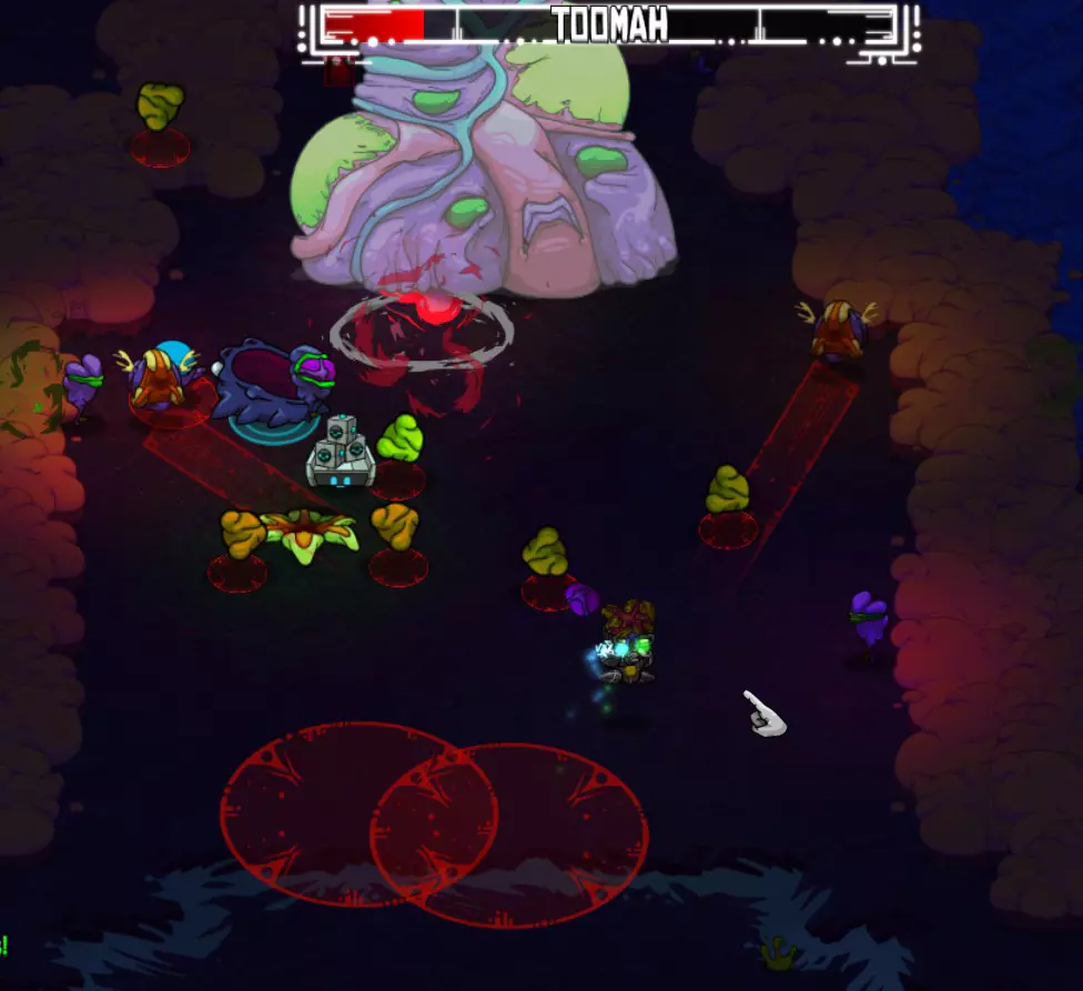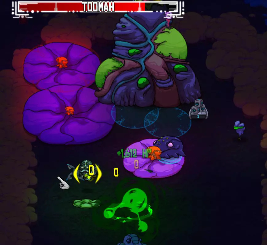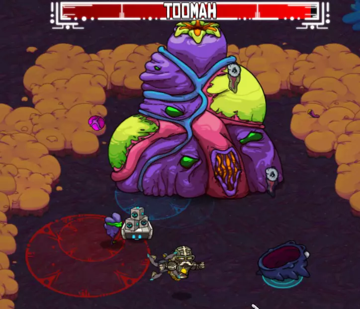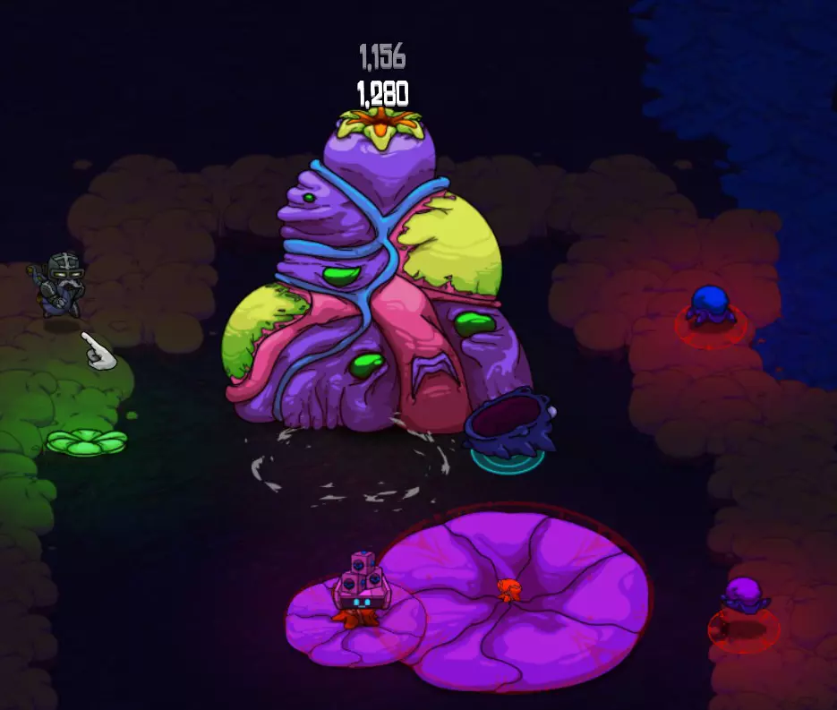 奖励:弱点探测器(饰品:增加25%暴击伤害)、交换视野(小工具:允许你与宠物交换位置)。 托马可通过杰克的一个支线任务到达,杰克是奶奶的助手(托马湾)。 攻击方式: 【主要攻击】迫击炮。 【主要攻击】巨型睡莲 - 种植后会变大。 【下一阶段(约50%生命值)】闪烁的虫子(蓝色和紫色)会追击玩家。 【下一阶段(约40%生命值)】会发射定向粘液的飞甲虫。 战斗策略: 战斗开始时看似简单,但很快就会变得混乱!托马会四处发射迫击炮,通常很容易躲避。然而,巨型睡莲开始生长,很快就会占据屏幕的很大一部分,有时甚至会有5-6个!确保你充分利用指虎和炸弹!