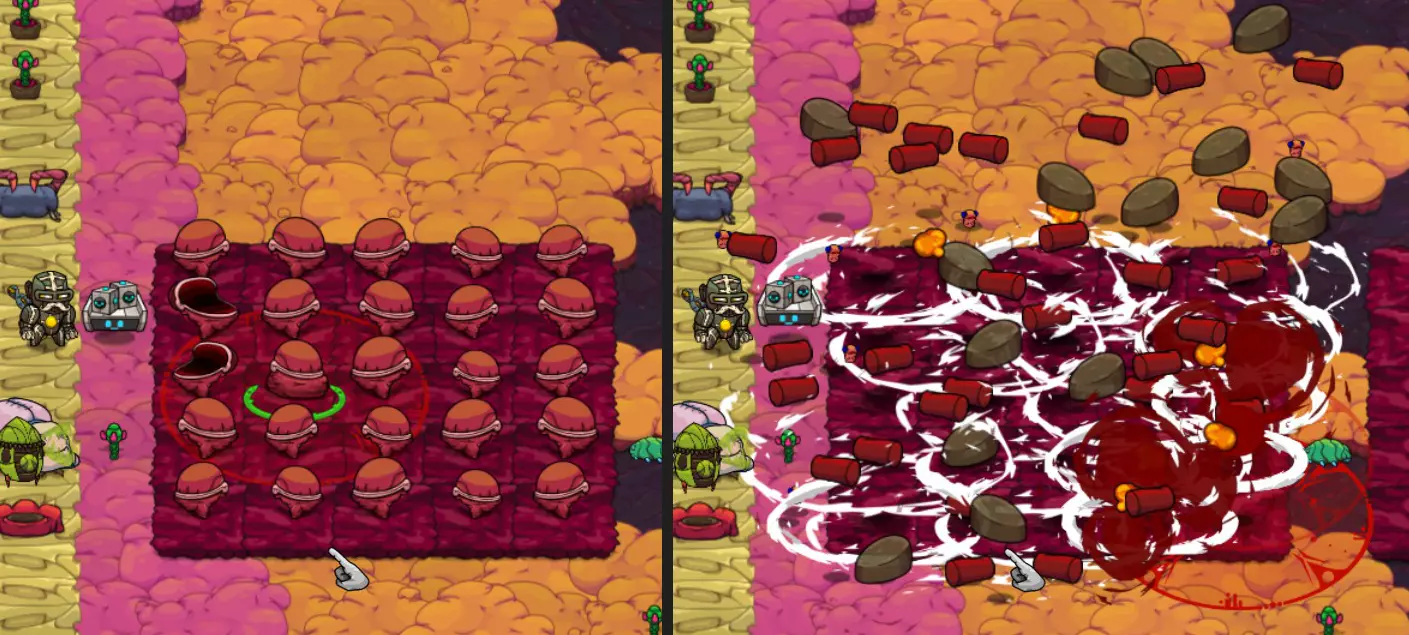 爆炸蟹 - 仅夜间出现 白天,你可以在金色草地/灰色岩石区域看到它们坚硬的外壳,但只有在夜间才能对其发起攻击。爆炸蟹拥有组合攻击:首先,你会看到以蟹身为中心的火焰范围攻击,将其自身向上弹起,随后螃蟹会猛冲向新的(更小的)红色圆圈区域。策略:站在小圆圈外侧,待其落地后进行1-2次攻击。 使用激光锁链可以非常轻松地击杀它们,你可以吸引多只爆炸蟹,它们会直线跟随你——这正是激光锁链光束的完美猎杀时机!