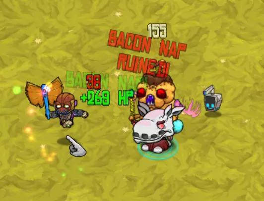 再生:培根小憩 当生命值达到75%时,他会向周围发射火箭弹,一次一枚,直至屏幕上出现约4-5枚火箭弹环绕。这些火箭弹无法被攻击,你必须等待它们自行消散。尽可能躲避。单次甚至两次命中仍有可能通过治疗恢复……但如果有更多火箭弹朝你袭来,使用你的Dbot获得无敌状态。