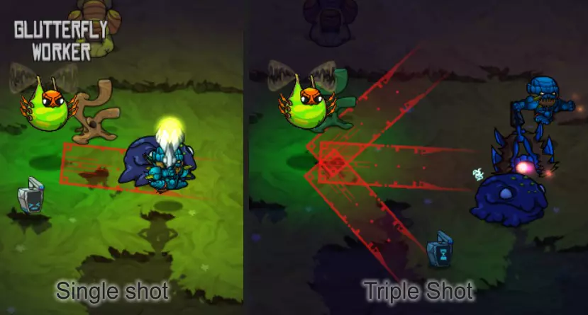 Glutterfly - 仅夜间出没 Glutterfly有两种不同的攻击方式:一种是发射单个直线飞行的投射物,另一种是呈扇形发射三个投射物。 注意:这些投射物是毒球,会使你获得中毒减益效果(在减益效果消失前,你将持续损失生命值)。 对抗这种怪物的最佳方法是在它发动攻击时从背后攻击它。
