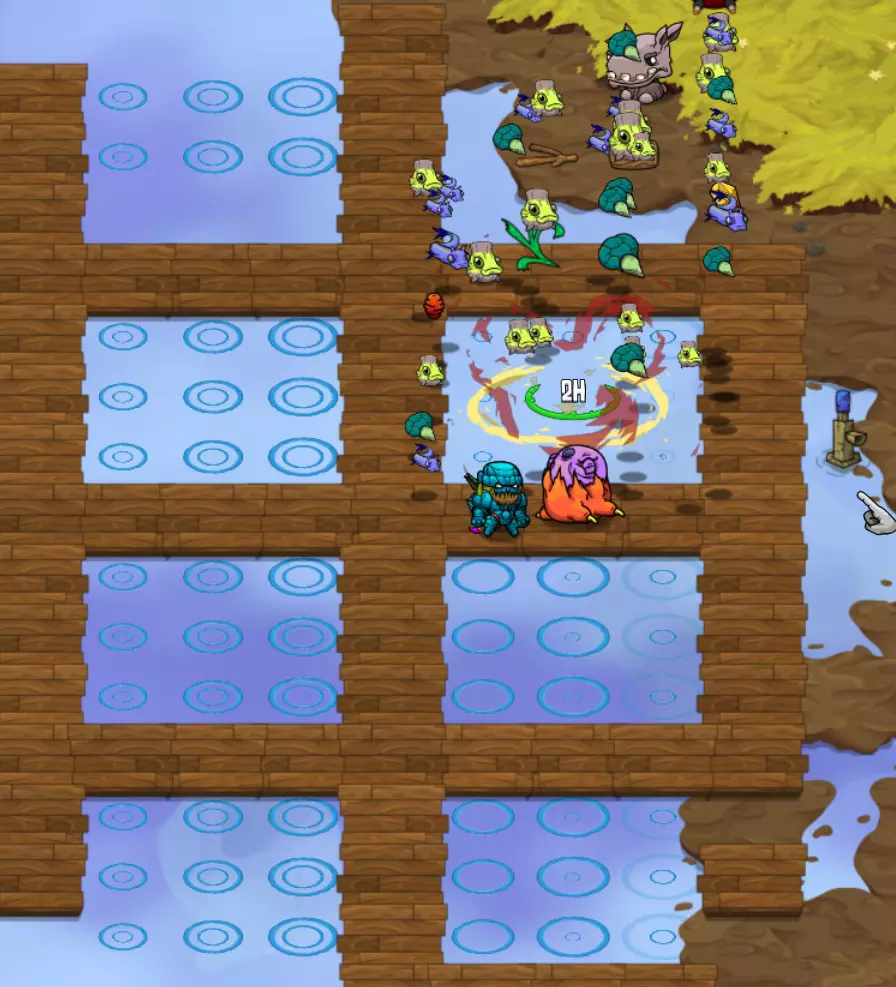 右侧有闪烁的虫子。 下一阶段会出现飞甲虫。它们【不可被选中】,所以集中精力躲避它们。这场战斗最困难的地方在于躲避所有飞行碎片和地面上的巨大睡莲垫……同时还要时不时攻击图玛,以保持你的宠物持续攻击。