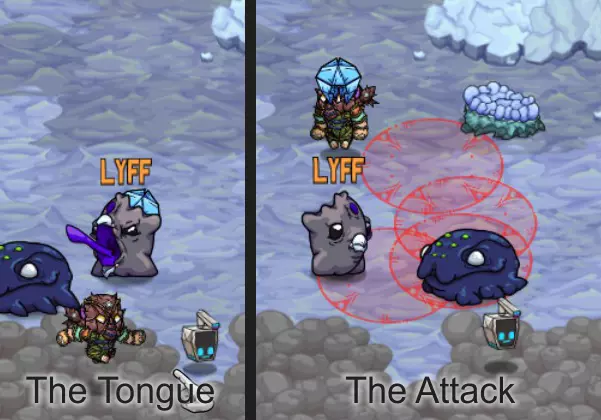 Lyff生活在间歇泉和Flailtree刷新点附近的冰封区域。这些生物的攻击方式与Vomma非常相似,会一次生成多个投射物。它们在地面上生成新的危险区域前会大喊并扭动舌头,向同一区域发射2-4个投射物。最简单的攻击方法是站在危险区域范围外,在投射物落地后,也就是Lyff大喊的时候,悄悄上前攻击!(注意:如果被投射物击中,会获得移动减速的减益效果。)