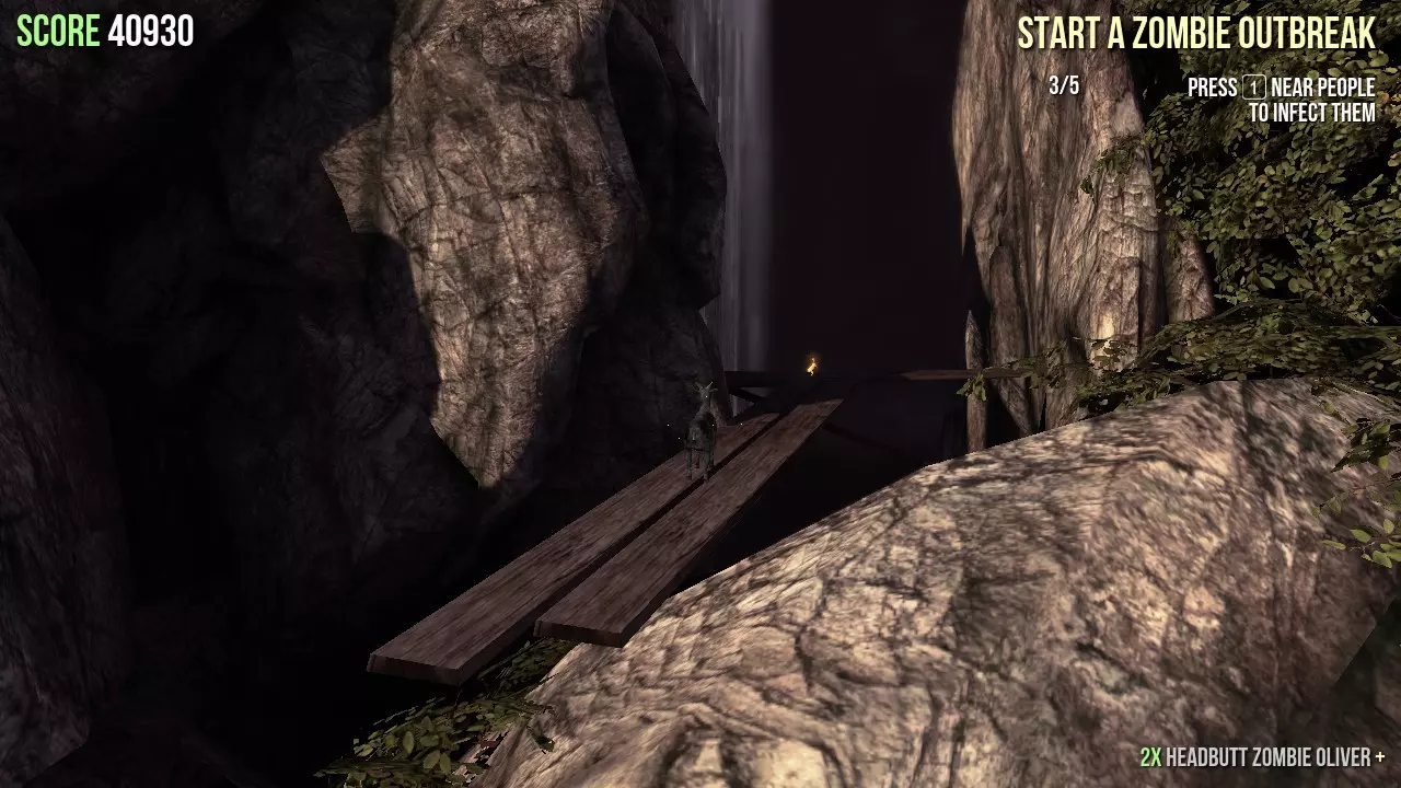 18. 穿过墓地右侧的小路(普通模式下的出生点),沿着小路向上走到桥边,然后从桥下跳到瀑布旁的木板上。