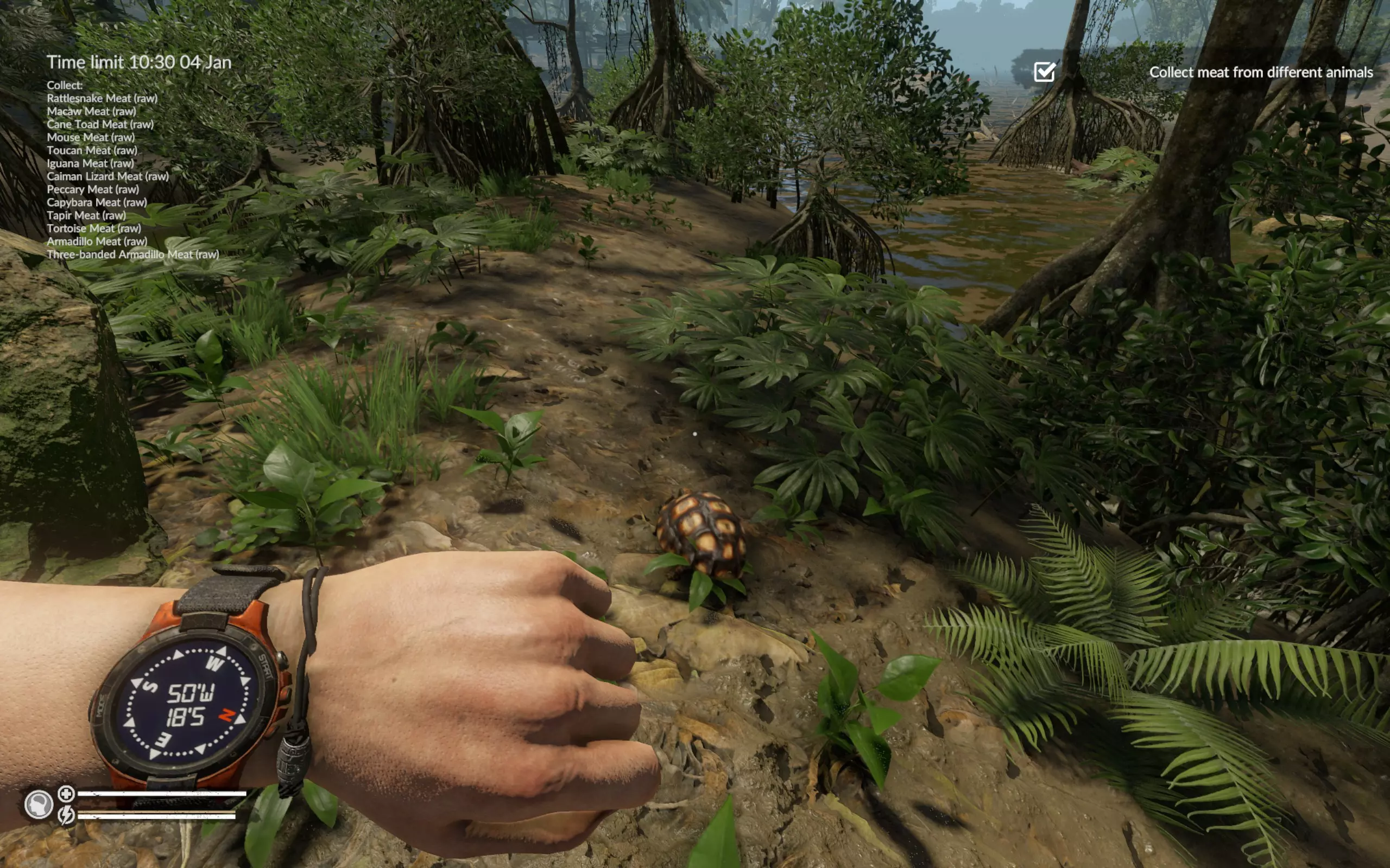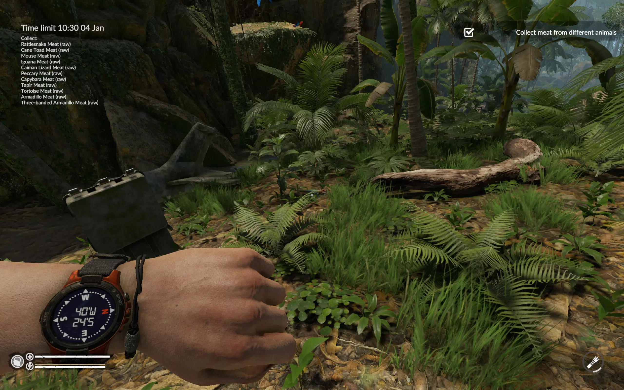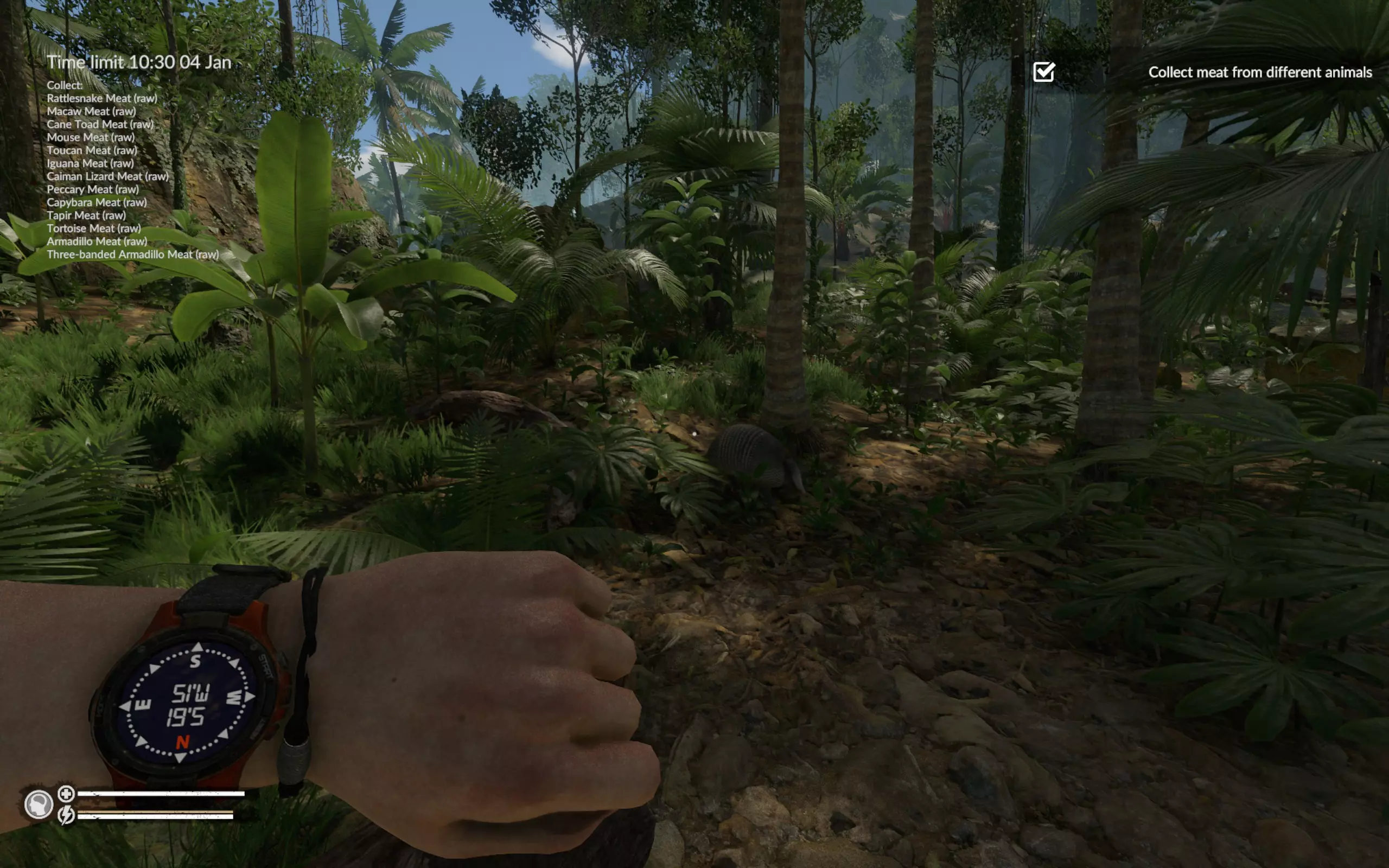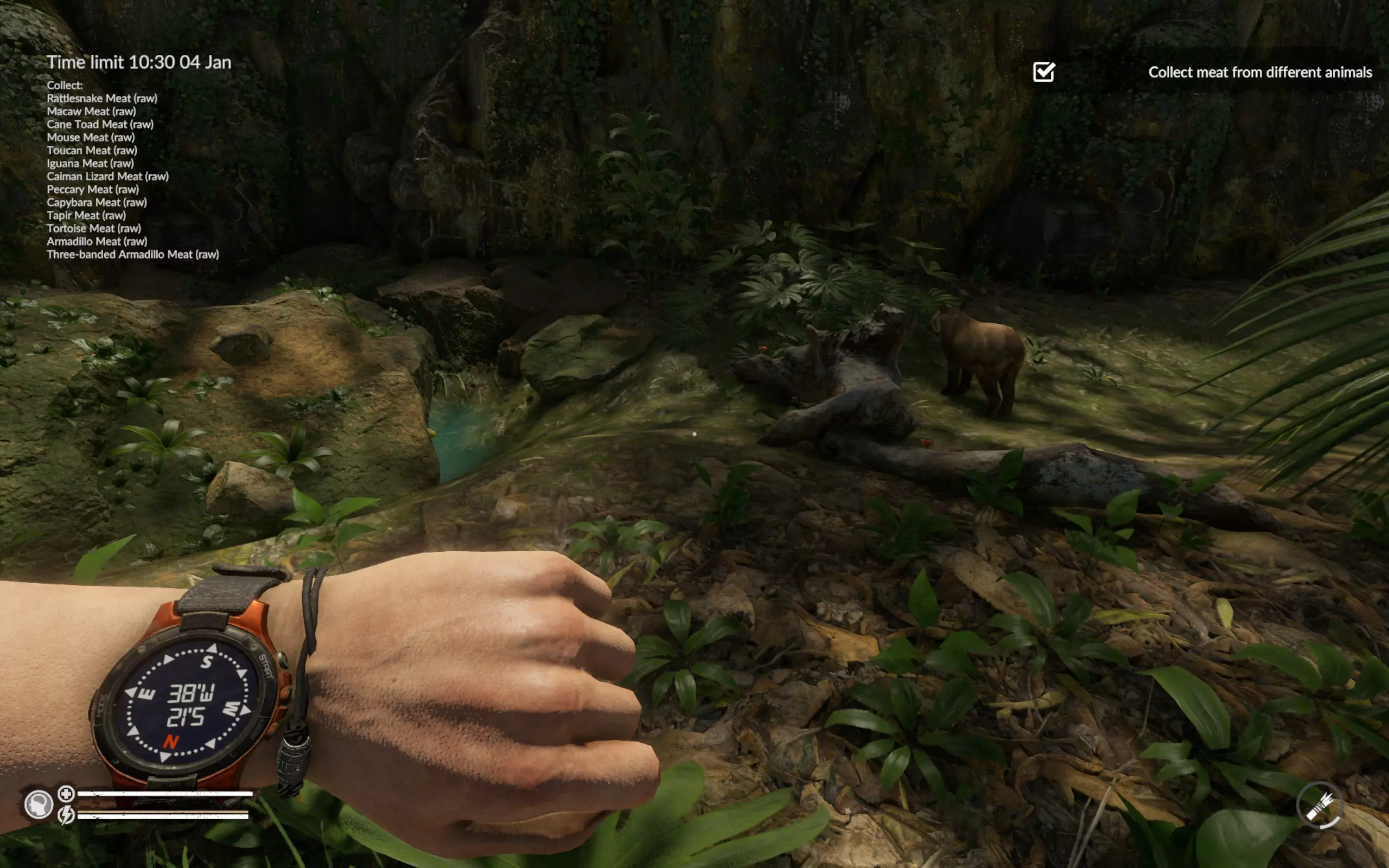 三带装甲车的其他位置:坐标47°W 19°S(从飞机到码头的路上)、50°W 16°S(浅滩附近)、48°W 15°S(凯门鳄所在的洞穴附近)。 海龟的其他位置:坐标50°W 16°S(浅滩附近)和52°W 18°S(码头对岸)。 此时蛇已经主动找到我们,我们也找到了火鸡的尸体。如果没找到火鸡尸体,就直接在周围区域搜寻。在游戏中玩了近200小时,我只见过两次飞行的巨嘴鸟。一次是在废弃村庄(坐标46`W 25`S),另一次是在第二或第三张地图的某个地方。我从未见过静止不动的巨嘴鸟。所以整个活动归结为一件事——找到巨嘴鸟的尸体。 结论:我已经尝试过好几次这个任务,如果出现问题,建议在重试前重启游戏。我曾两次在第一天就收集到了所有动物,但之后花了两天时间寻找巨嘴鸟的尸体,却一无所获。我感觉游戏中某个变量决定了生成的尸体数量,而且在重复游玩时不会重置。不过,如果巨嘴鸟的尸体正好出现在必经之路上,那这个任务就没什么难度了。这是我的成果,耗时刚过8小时,甚至比《营火传说》还快。