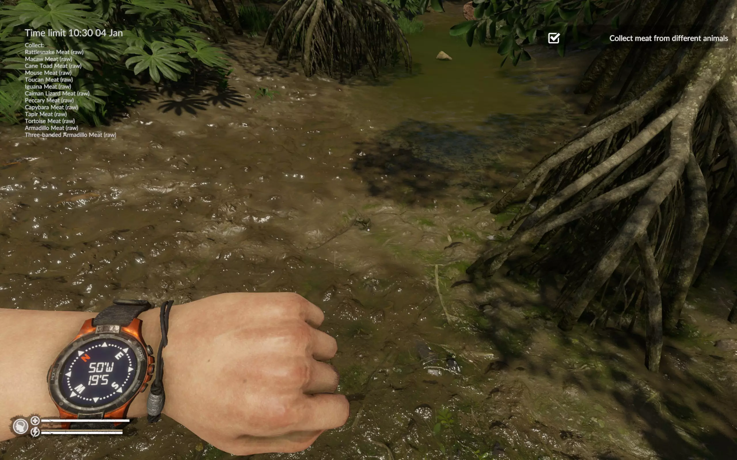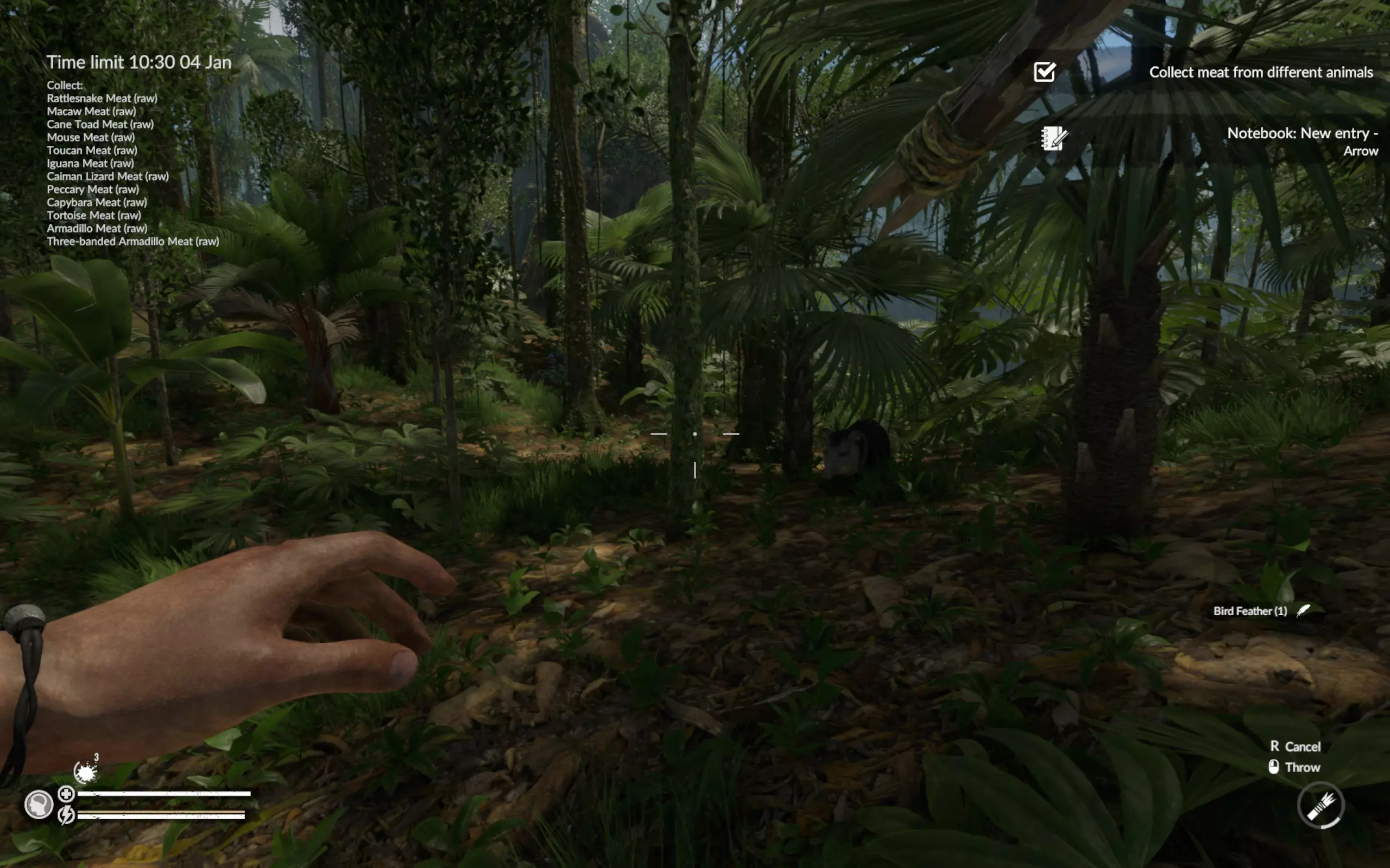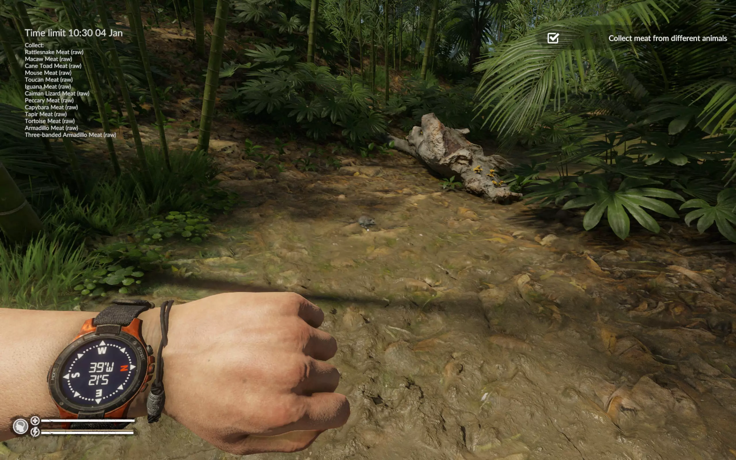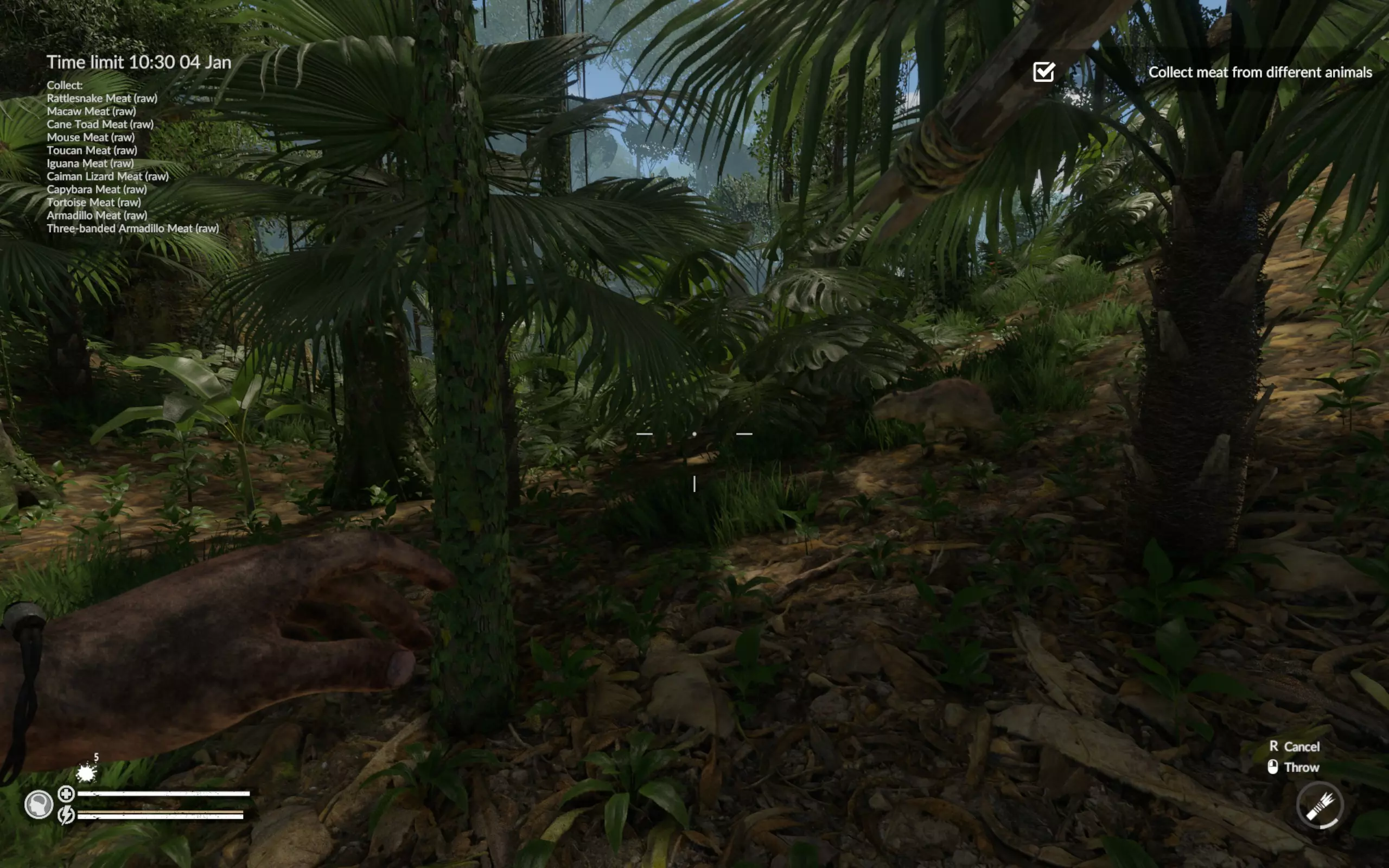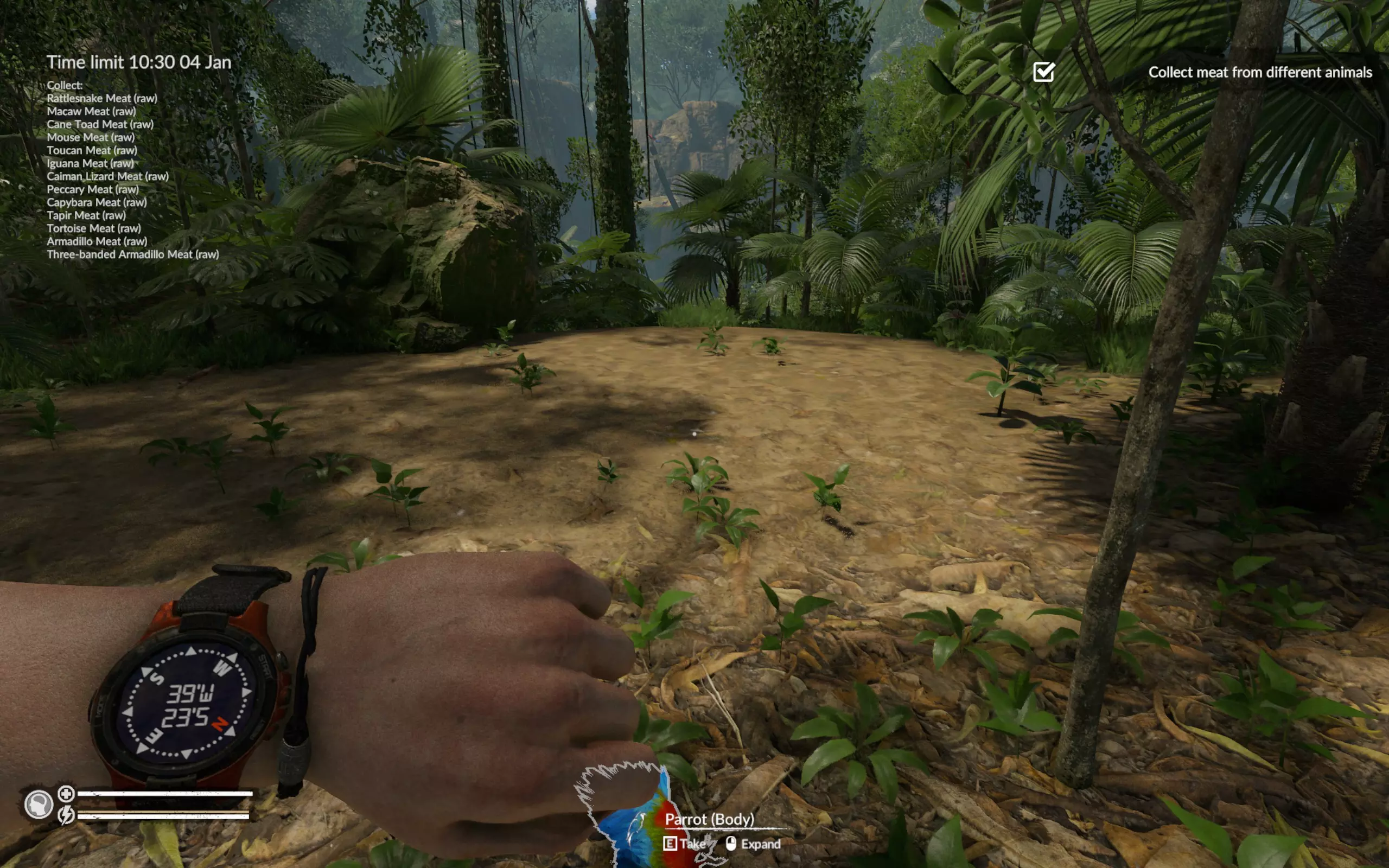三带装甲车的其他位置:坐标47°W 19°S(从飞机到码头的路上)、50°W 16°S(浅滩附近)、48°W 15°S(凯门鳄所在的洞穴附近)。 海龟的其他位置:坐标50°W 16°S(浅滩附近)和52°W 18°S(码头对岸)。 此时蛇已经主动找到我们,我们也找到了火鸡的尸体。如果没找到火鸡尸体,就直接在周围区域搜寻。在游戏中玩了近200小时,我只见过两次飞行的巨嘴鸟。一次是在废弃村庄(坐标46`W 25`S),另一次是在第二或第三张地图的某个地方。我从未见过静止不动的巨嘴鸟。所以整个活动归结为一件事——找到巨嘴鸟的尸体。 结论:我已经尝试过好几次这个任务,如果出现问题,建议在重试前重启游戏。我曾两次在第一天就收集到了所有动物,但之后花了两天时间寻找巨嘴鸟的尸体,却一无所获。我感觉游戏中某个变量决定了生成的尸体数量,而且在重复游玩时不会重置。不过,如果巨嘴鸟的尸体正好出现在必经之路上,那这个任务就没什么难度了。这是我的成果,耗时刚过8小时,甚至比《营火传说》还快。