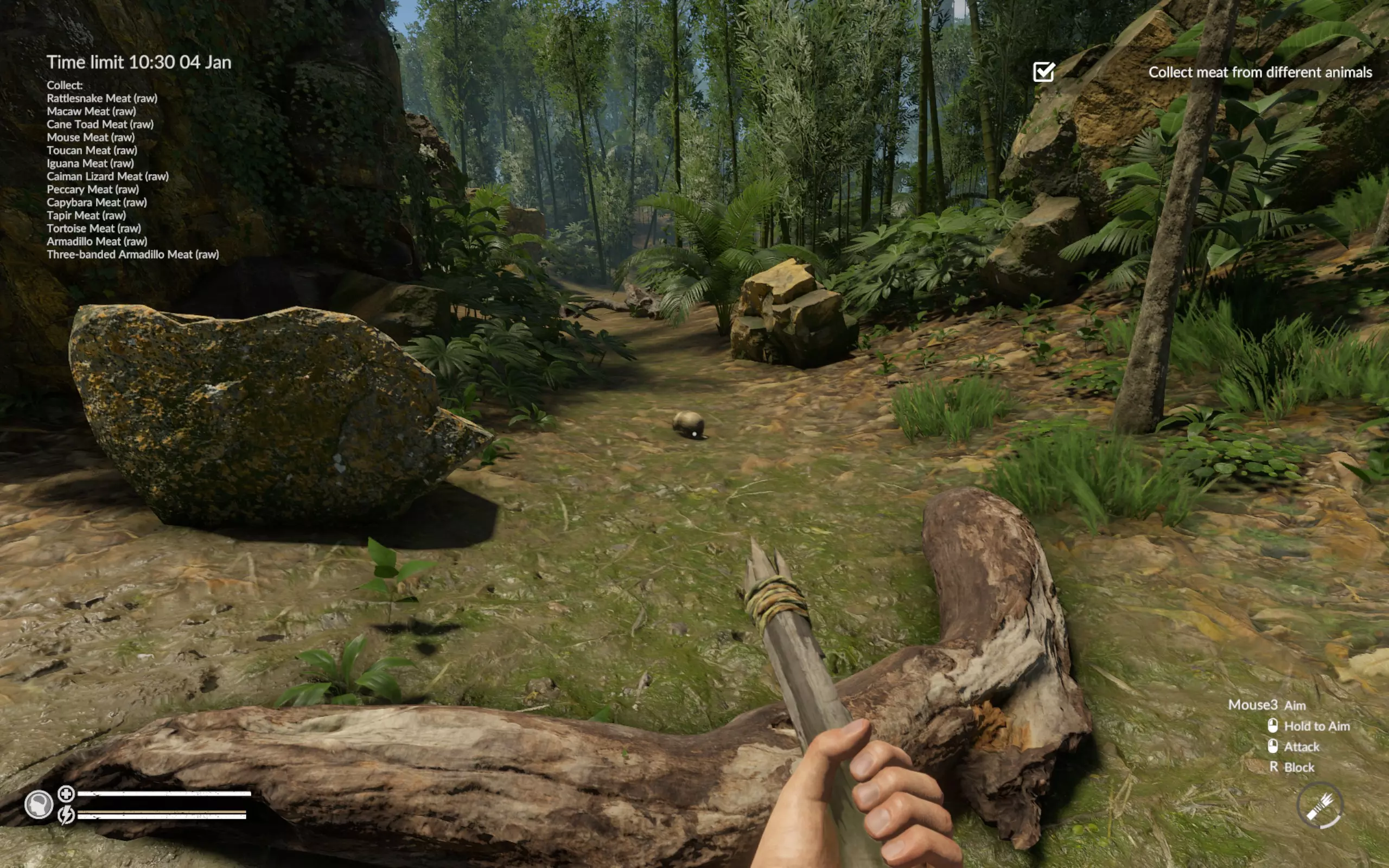 总之,我们可以在出生点直接捕获前三种动物。捕获后,把背包里所有的骨头和肉都扔掉——我们根本不需要它们,然后向南出发。路上,在一块大石头附近长着亚麻。亚麻旁边,它的左边或右边有宿主。强烈建议带上它们并制作绷带。我四分之三的游戏进程都被蛇咬过 :) 石头后面有一个小湖,湖附近住着貘。