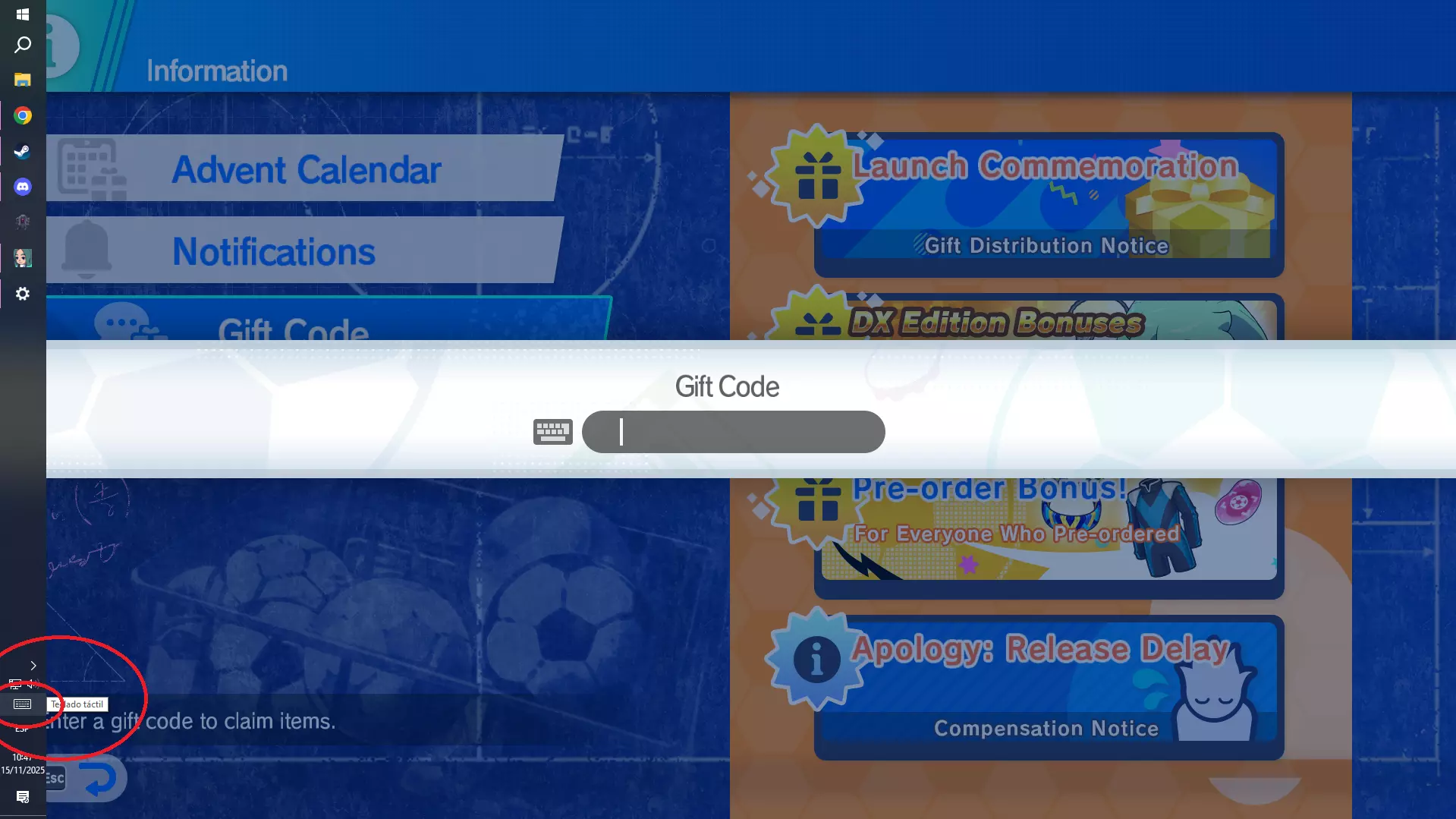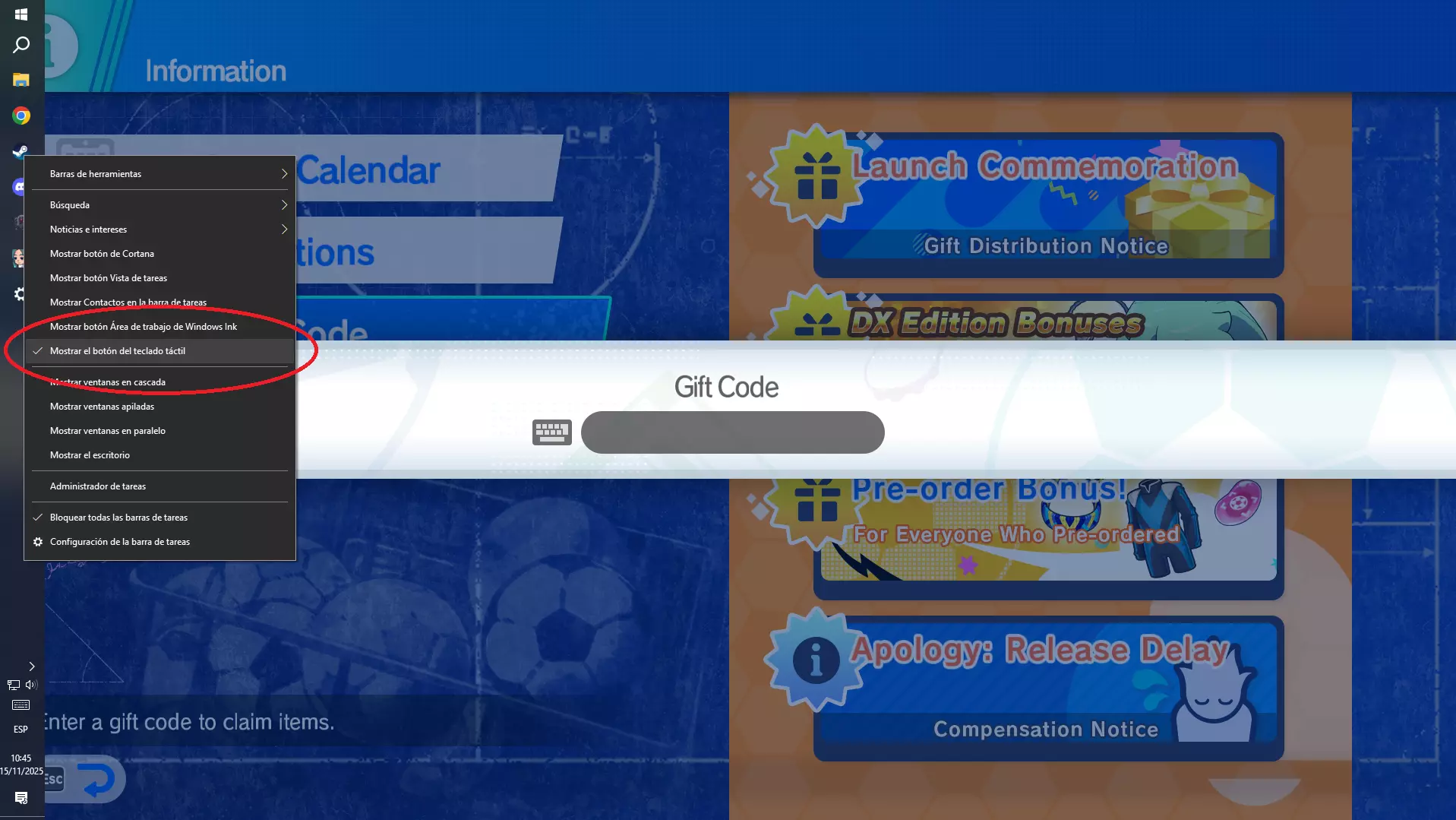 在里面,你会立即看到【礼品码】选项,选择它,点击文本框并使用Alt + Caps Lock切换到片假名。为了确认操作正确,我们来测试一下。 以下是3个密码: kahawahikotsuinomomeosa カハワヒコツイノモメオサ motonetayaikantorikino モトネタヤイカントリキノ yahonniyomeishintoawa ヤホンイヨメイシントアワ 左侧是我们要输入的内容,右侧是预期显示的结果。如果输入的内容不同,可能是Windows默认启用了平假名选项,这时需要再次尝试使用Alt + Caps Lock切换到片假名。这实际上最多只会失败3次(因为日语字母有3种文字),所以如果你仍然遇到问题,我们可以尝试另一种方法。 首先,我们将启用Windows虚拟触摸板,方法是右键点击Windows任务栏,然后点击【显示虚拟触摸板按钮】。
