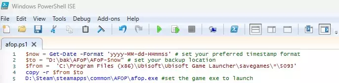$now = Get-Date -Format 'yyyy-MM-dd-HHmmss' # 设置你偏好的时间戳格式 $to = "D: bak AFoP AFoP-$now" # 设置你的备份位置 $from = 'C: Program Files (x86) Ubisoft Ubisoft Game Launcher savegames * 5093' copy -r $from $to D: Steam steamapps common AFOP afop.exe # 设置要启动的游戏可执行文件 你可以将上述代码复制并保存为ps1文件。然后可以编辑该文件(检查你的文件夹路径!)并使用ISE进行测试,或者右键直接运行脚本。请注意,你可能需要调整执行策略才能运行来自文件的 shell 脚本。如果你希望保持严格的策略,仍然可以从ISE运行代码,不过这似乎不太方便。 如果你想用老式的批处理脚本来做同样的事情,情况可能会稍微复杂一些。