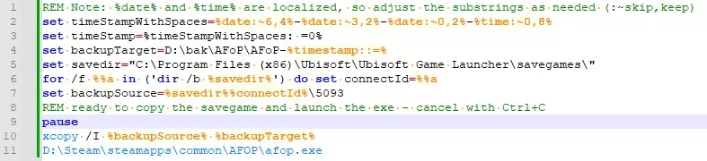 REM 注意:%date% 和 %time% 已本地化,因此需根据需要调整子字符串(:~跳过,保留) set timeStampWithSpaces=%date:~6,4%-%date:~3,2%-%date:~0,2%-%time:~0,8% set timeStamp=%timeStampWithSpaces: =0% set backupTarget=D: bak AFoP AFoP-%timestamp::=% set savedir="C: Program Files (x86) Ubisoft Ubisoft Game Launcher savegames " for /f %%a in ('dir /b %savedir%') do set connectId=%%a set backupSource=%savedir%%connectId% 5093 REM 准备复制存档并启动可执行文件 - 按Ctrl+C取消 pause xcopy /I %backupSource% %backupTarget% D: Steam steamapps common AFOP afop.exe 当你将上述代码保存为bat文件后,双击即可运行。这种方式便于通过快捷方式和热键启动脚本及游戏。不过,来源或用途不明的批处理文件可能存在危险,尤其是当你以管理员权限运行它们时。因此,处理此类脚本时要格外小心,务必先确认它们的具体功能。 结束语 目前就介绍这些内容。我希望这能帮助到一些玩家,因为我还没有看到任何关于恢复存档备份的指南。如果你有任何问题,可以留言,毕竟最后一部分的内容技术性稍强一些。希望这些信息能有所帮助。