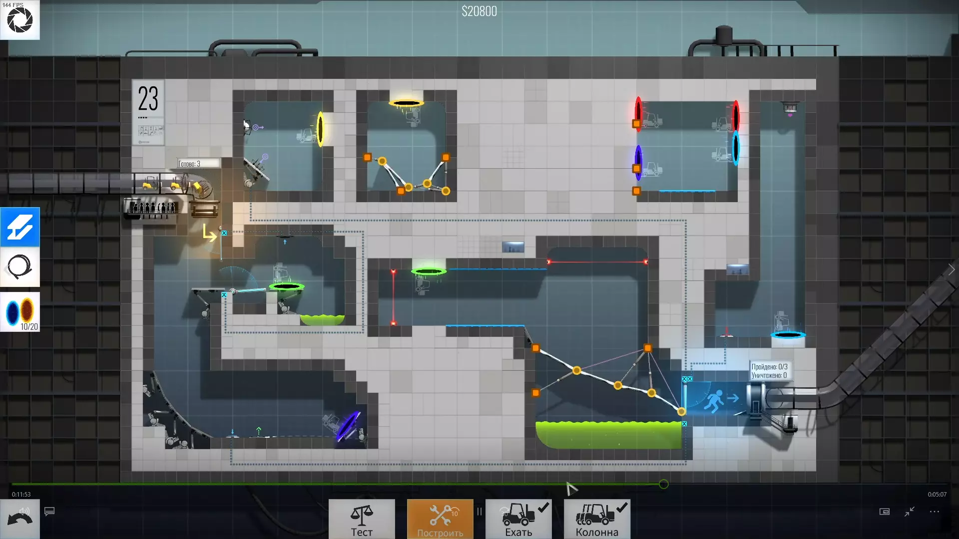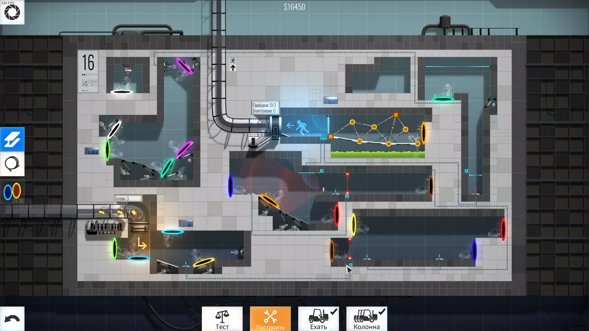 第19关 难度:极难 这可能是我在整个游戏中遇到的最难关卡了。也许是因为我的通关方法不对,但重要的是最终我还是过关了。它们总是互相碰撞、妨碍彼此,还会掉下去,即使是最终方案里,它们还是会碰撞,但至少能到达终点。唉,和其他关卡相比,我在这关花了太多时间。