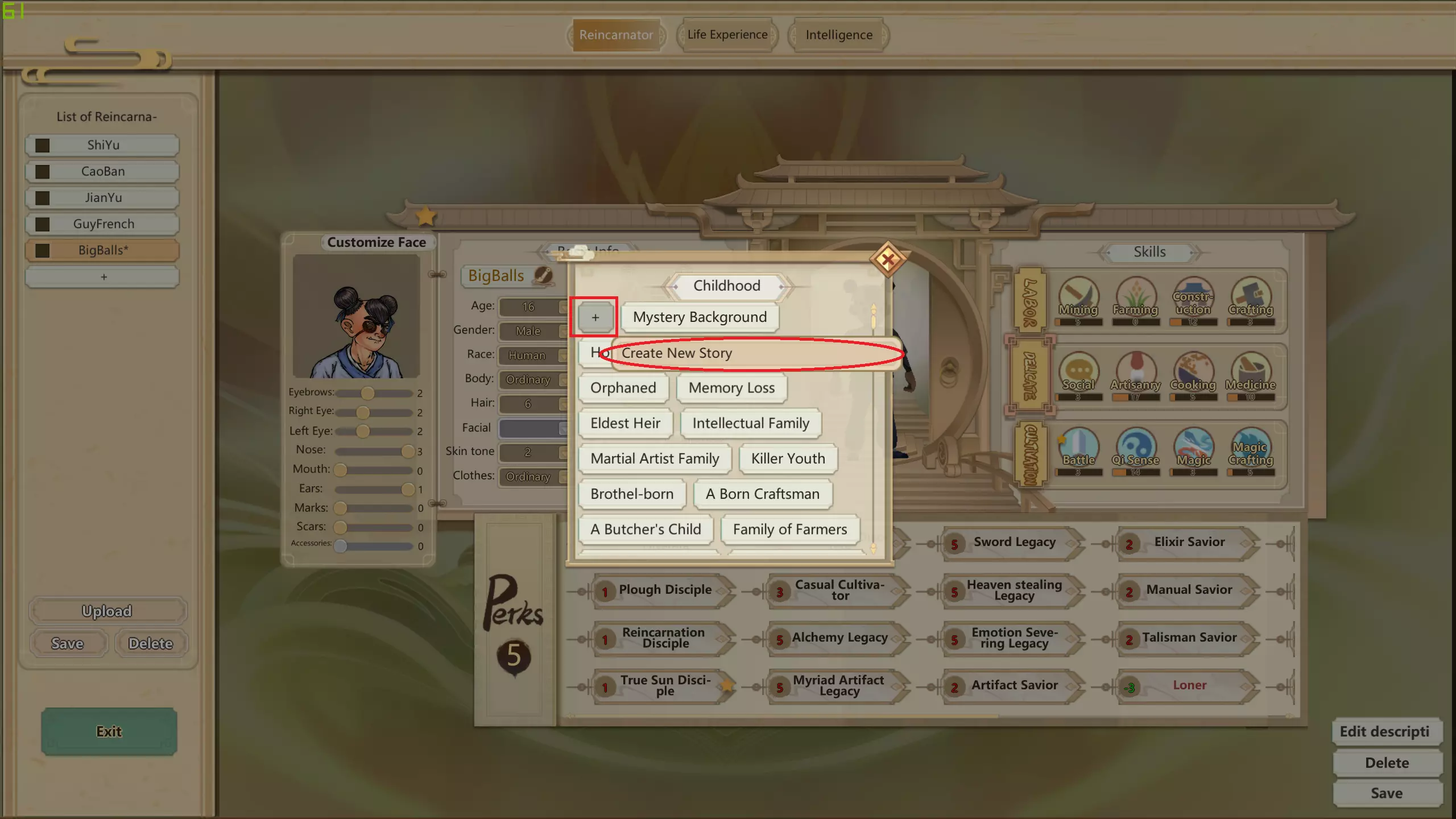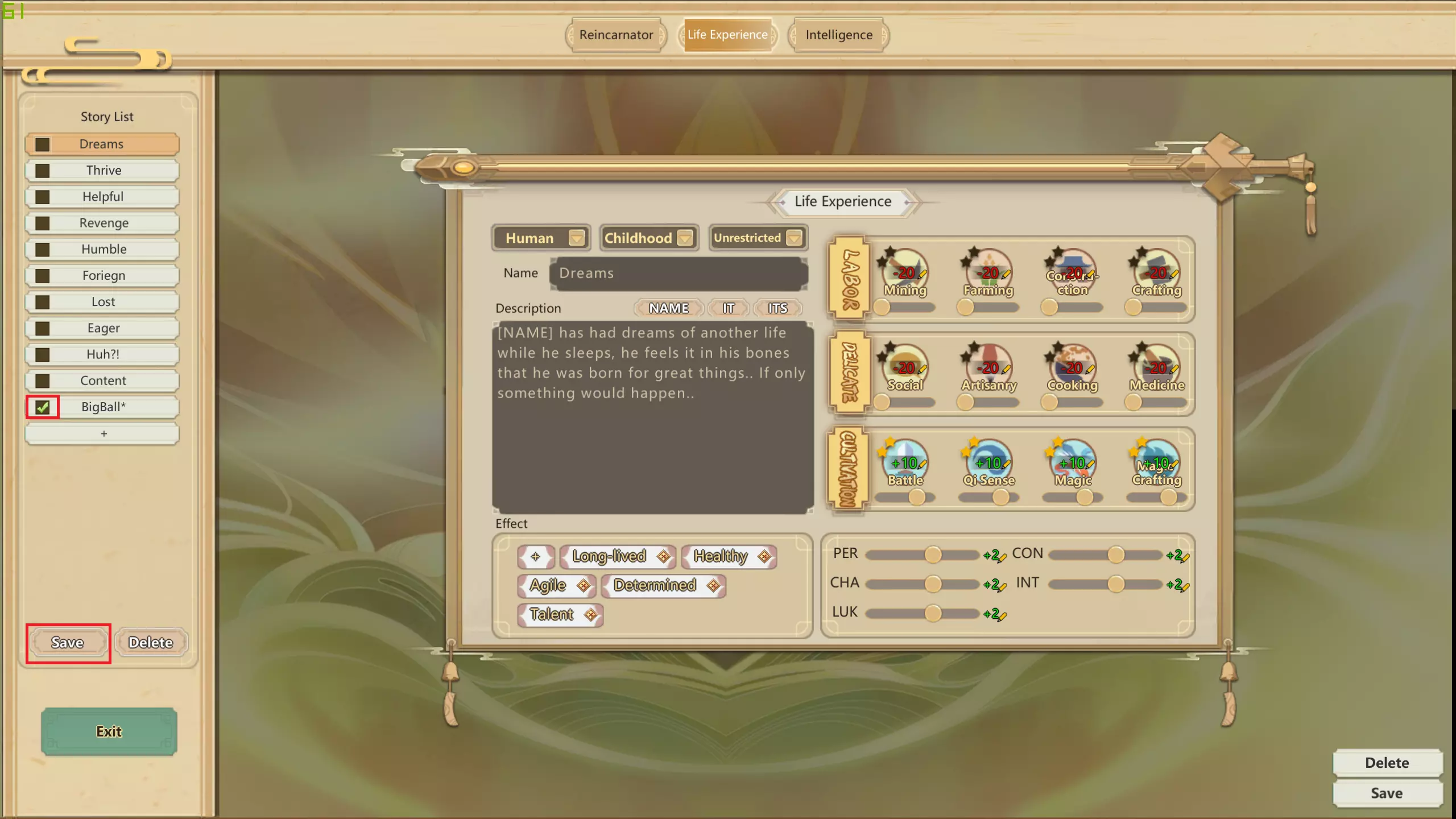 1. 可选择成年或童年时期,以及后续随机生成角色时仅男性或女性可获得的经历,同时撰写精彩的背景故事文本,使其融入游戏并符合世界观设定! 2. 点击加号将获得特定特质,例如让角色行走速度加快、更具魅力,甚至比其他人更长寿! 3. 点击星星可提升角色学习该技能的效率 4. 调整滑块可增加或减少属性 保存并使用这些经历! 完成后即可!