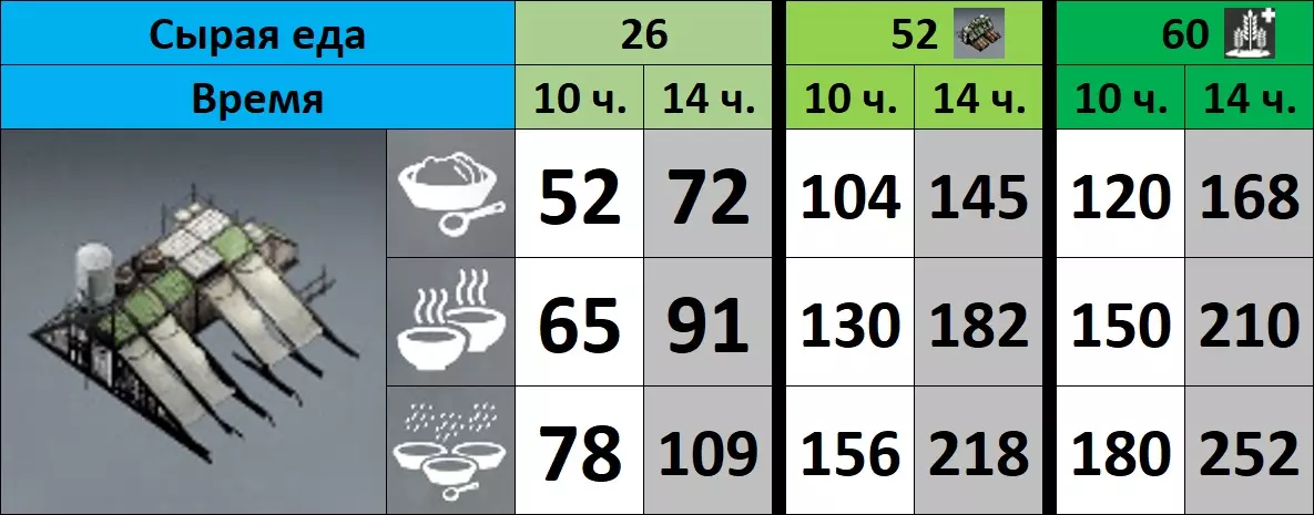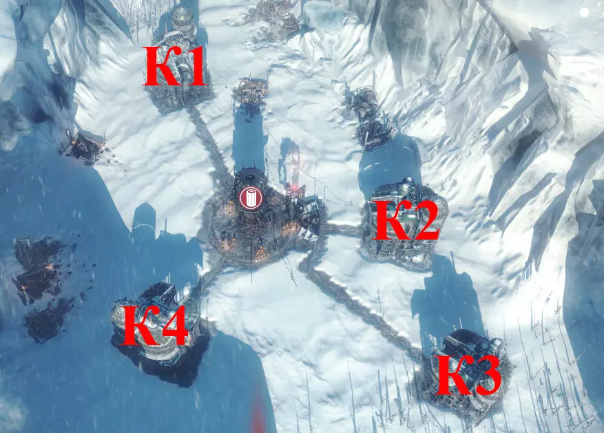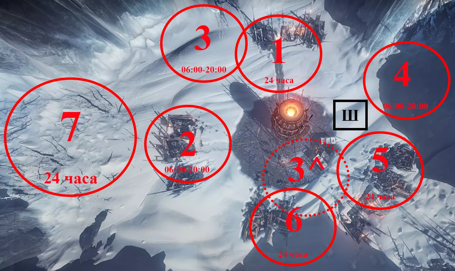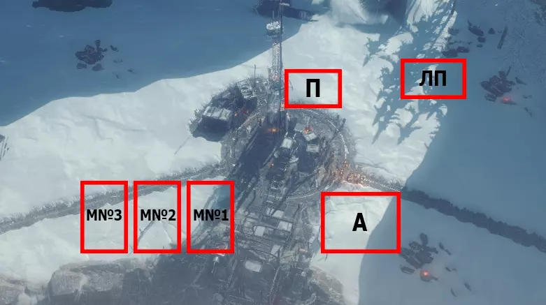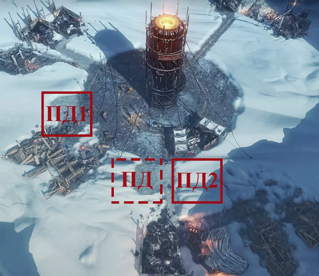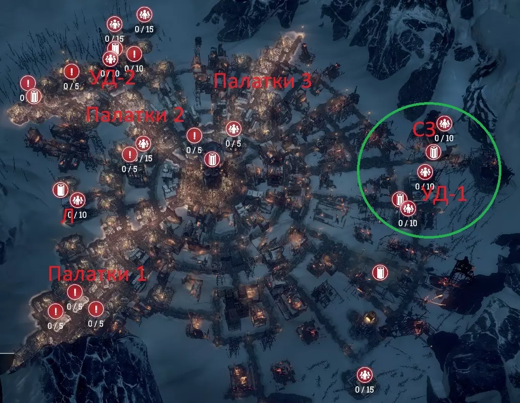 - 蒸汽中心。 M1、M2、M3、M4 – 工坊。 К – 厨房。 УД – 采煤机。 ПД – 采集站。 ДУ – 儿童避难所。 ДО – 孤儿院。 П – 可放置帐篷区域。 Ш – 灯塔(热区外)。 研究