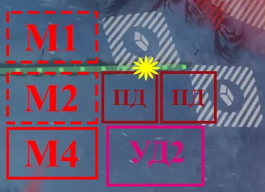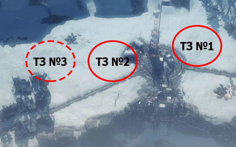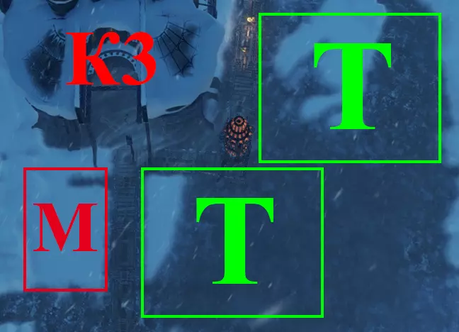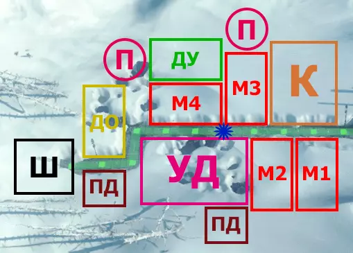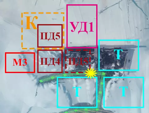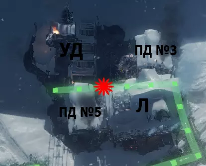 - 蒸汽中心2号。 PD4 - 4号采矿站。紧邻煤堆放置(届时将不再有煤炭)。 PD5 - 5号采矿站。虚线标记为PD5的重建位置。 M3 - 3号工坊。 УД - 1号采煤机。 Т - 温室。 К - 厨房。由TZ1号改建而成。 供暖区3号(TZ3号)布局图: