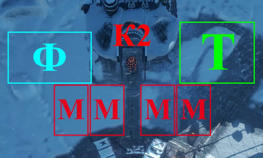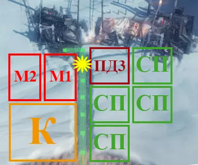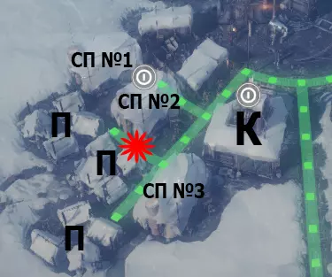 空闲位置上放置帐篷。游戏过程中所有指定建筑都将被拆除并转移到其他热力区。 - 蒸汽中心1号 M1 - 工坊1号 M2 - 工坊2号 СП - 卫生站 К - 厨房 热力区2号(TZ 2)布局图:
