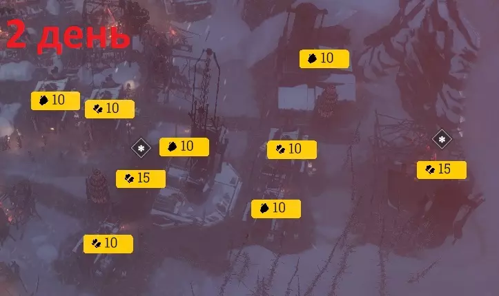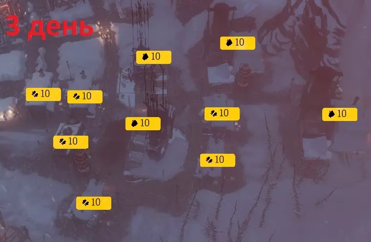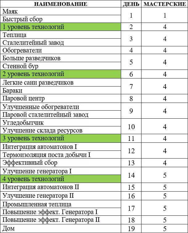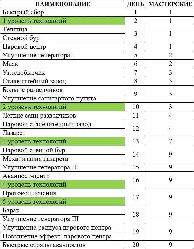 М№1, М№2, М№3 – Мастерские. П – Паб. А – Администрация. ЛП – Лесопилка, располагаем так, чтобы срубить все деревья. Прохождение 1-15 дни 1 ДЕНЬ1) Рабочие: 15 - Стальные обломки, 50 – Ящики древесины. 2) Строим: Мастерская №1 и №2, Пост добычи №1 и №2, Санитарный пункт №1. 3) Исследуем: Лесопилка. 4) Событие «Нет крыши над головой»: Обеспечим часть. 2 ДЕНЬБудет немного не хватать древесины, поэтому сносим лишние улицы. Если заболело 2 Инженера, то одного заболевшего ставим в Санитарный пункт. В Мастерской должно работать минимум 9 Инженеров. 1) Инженеры: 5 - Санитарный пункт, 10 - Мастерские. 2) Рабочие: 11 - Стальные обломки (должны заканчиваться), 15 - Ящики древесины, 10 - Пост добычи №1, Оставшиеся - Пост добычи №2. 3) Формируем отряд Разведчиков №1. Снаряжаем заболевших. Отправляем в «Разрушенное здание» --- «Каменная стена» --- Возвращаем в город. 4) Исследуем: Обогреватели. 5) Строим: Лесопилка, Кухня, Санитарный пункт №2, Палатки – 4 шт., Пост добычи №3. 3 ДЕНЬНа Кухню ставим рабочих по мере поступления еды. Мастерская должна работать на 100%. Во внерабочее время, полностью укомплектовываем Санитарный пункт №3. Первым делом нужно построить все, что требуется для сообщения с Нью-Лондоном, чтобы в этот же день отправить запрос + получить дополнительную сырую еду. 1) Инженеры: 10 - Санитарные пункты, 5 - Мастерская. 2) Рабочие: 10 - Лесопилка, 10 - Пост добычи №1, 10 - Пост добычи №2, 1 – Кухня, Остальные – Пост добычи №3. 3) Строим: Санитарный Пункт №3, Палатки – 5 шт., Администрацию, Транспортное депо. 4) Событие «Нет крыши над головой»: Обеспечим всех. 5) Запрос «Нью-Лондон: Сырая еда. 4 ДЕНЬКогда прибудут дети, распределяем инженеров между всеми Санитарными пунктами, так, чтобы в каждом работало минимум 3 человека. 1) Инженеры: 10 - Санитарные пункты, 5 - Мастерская. 2) Рабочие: 10 - Лесопилка, 10 - Пост добычи №1 (должен истощаться), 10 - Пост добычи №2, Оставшиеся – Пост добычи №3. 3) Разведчики №1: «Обломки здания» --- «Заброшенная тоня» --- «Руины обсерватории» --- Возвращаем в город. 4) Исследуем: Деревянные опоры. Включаем 24 часа. 5) Строим: Пост добычи №4, прокладываем дорогу к Армейскому складу. 6) Сносим: Пост добычи №1. 5 ДЕНЬВключаем Обогреватель на Армейском складе. Начиная с этого дня, ежедневно используем в Армейском складе Деревянные опоры. У Нью-Лондона просим помочь с ростом недовольства. Будет принят закон «Паб» или «Бойцовская арена». 1) Инженеры: 10 - Санитарные пункты, 5 - Мастерская. 2) Рабочие: 20 - Армейский склад, 10 - Лесопилка, 10 - Пост добычи №2, Оставшиеся - Пост добычи №4. 3) Армейский склад: Сталь. 4) Исследуем: Тачки. 5) Исследуем: Печи. 6) Строим: Паб или Бойцовская арена. 6 ДЕНЬПоявятся тяжелобольные. Сразу запрашиваем помощь у Нью-Лондона по лечению тяжело заболевших. Будет принят закон «Радикальное лечение» или «Поддержание жизни». Также по сюжету будет принят закон «Продленная смена», включаем везде. 1) Инженеры: 10 - Санитарные пункты, 5 - Мастерская. 2) Рабочие: 20 - Армейский склад, 10 - Лесопилка, Оставшиеся – Пост добычи №2. 3) Армейский склад: Ядра. Как будет добыто 2 Ядра, переставляем на Сталь. 4) Исследуем: 1 уровень технологий. 5) Строим: Печь №1 и №2. 7 ДЕНЬСнова укомплектовываем Санитарные пункты в обычном режиме, 2 пункта по 5 инженеров. Начинаем по максимуму поддерживать в зданиях температуру на уровне «Приемлемо». Для экономии угля, следим в дальнейшем за температурой и отключаем Печь №2. Когда в г