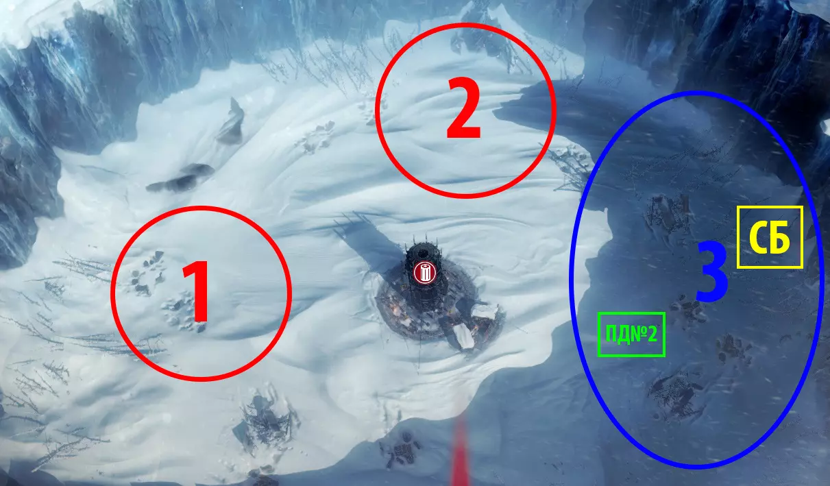 1 - 热区1(以下简称TZ1)。主要建设区域,详细布局如下。位于煤堆附近,我们将通过采集站和自动机械进行煤炭开采。当煤炭耗尽时,建造采煤机。 2 - 热区2(以下简称TZ2)。其位置规划用于未来为钢铁厂供暖。此处将建造工厂和医务室。3 – 非供暖区域,在此建造猎人小屋、仓库及其他无需供暖的建筑。 【SB】– 墙式钻床 【PD№2】– 开采站2号 供暖区域1号布局图(无扩大半径):
