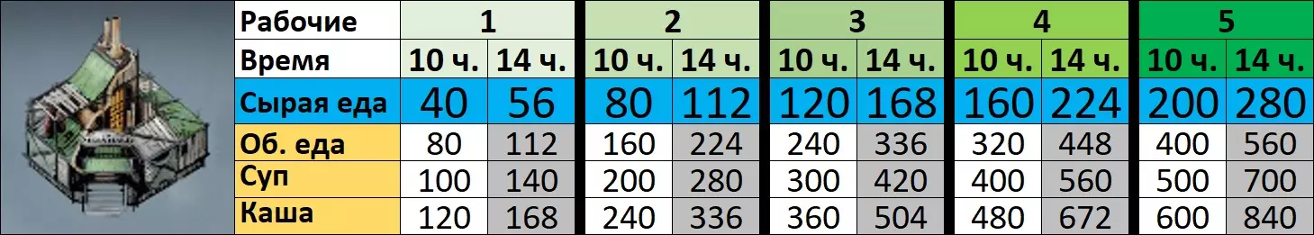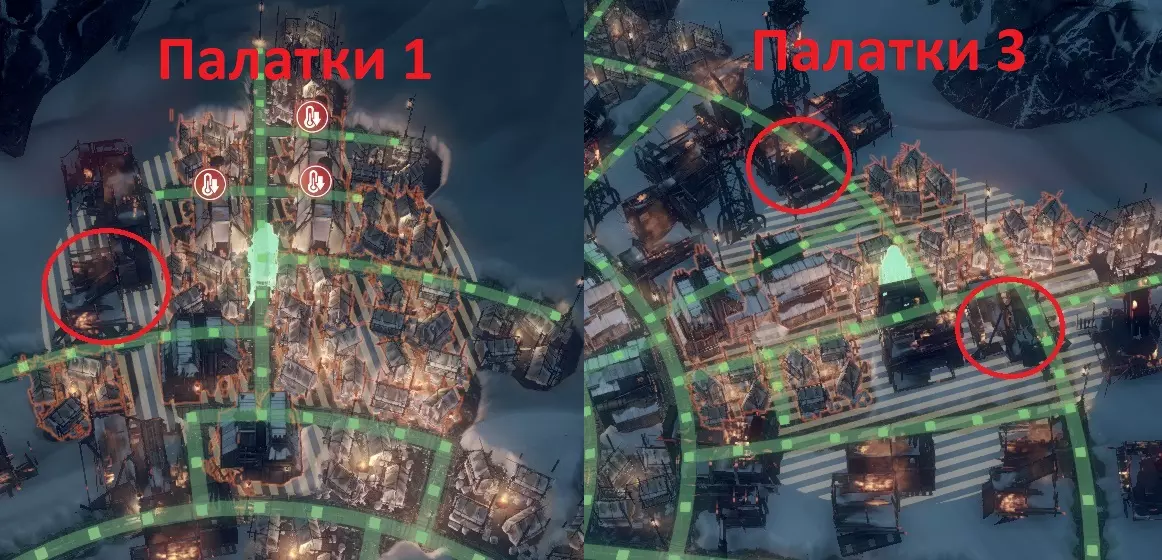 绿色部分为生产区域。 帐篷1、2、3:需要通过蒸汽中心供暖的帐篷组。 УД-1:1号采煤机。位于生产区域。 УД-2:2号采煤机。位于帐篷内,因此未来为了建造2个额外的采集站,我们将拆除帐篷。 СЗ:钢铁厂。 Л:锯木厂。 废墟开发: