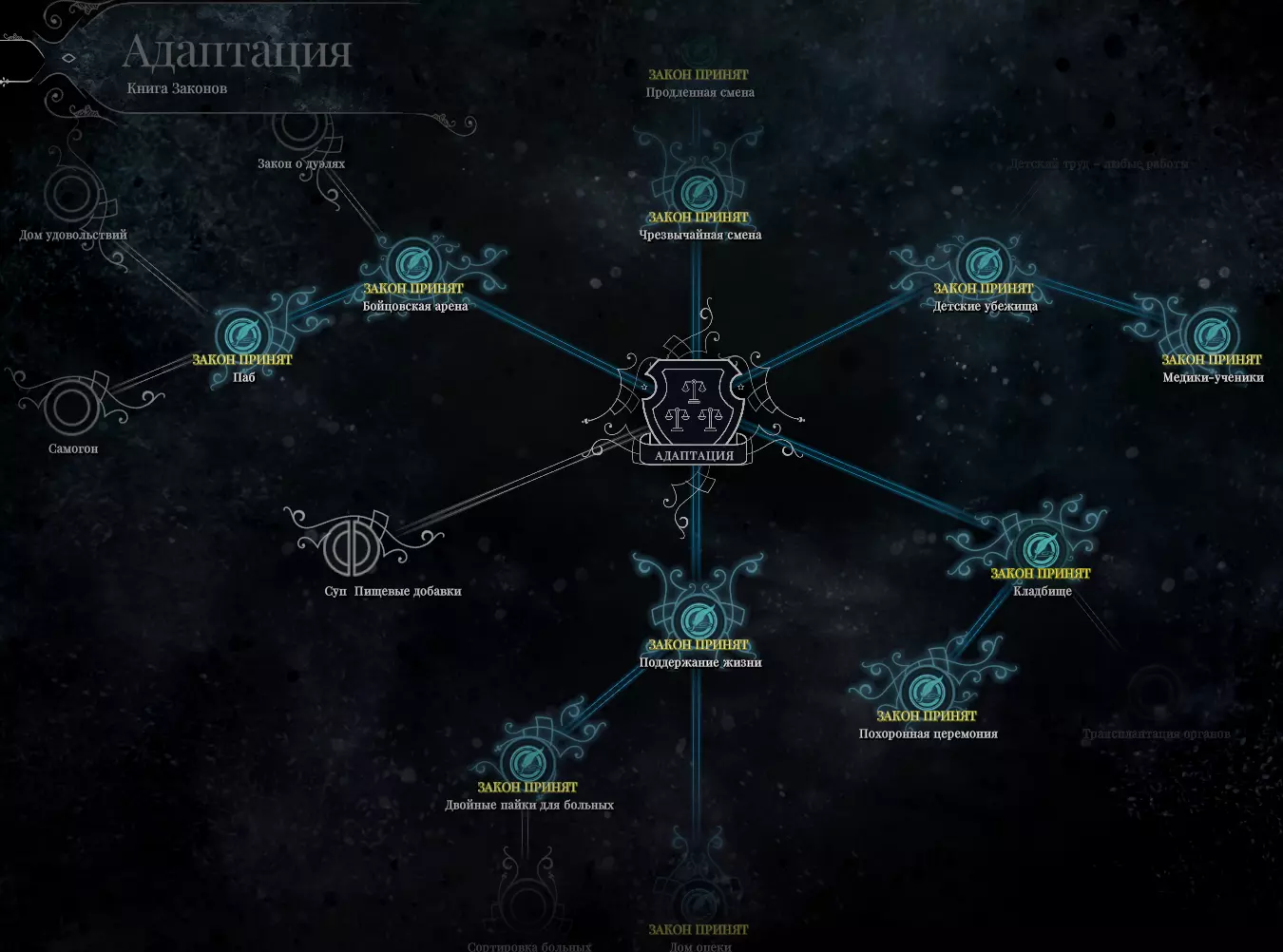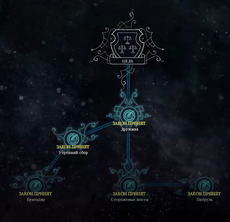 黄金之路 完成“新家”剧情,不颁布严苛法律且不使用暴力手段。我花了很多时间来找出为了解锁这个成就可以颁布的最多法律数量。 重要!可以研究“紧急状态法”,但不能应用(已测试)。“汤”法案对获取该成就没有影响。