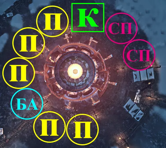 П – 帐篷。 СП – 医疗站。 К – 厨房。 БА – 格斗竞技场。 建筑布局 - 方舟2号(K2):