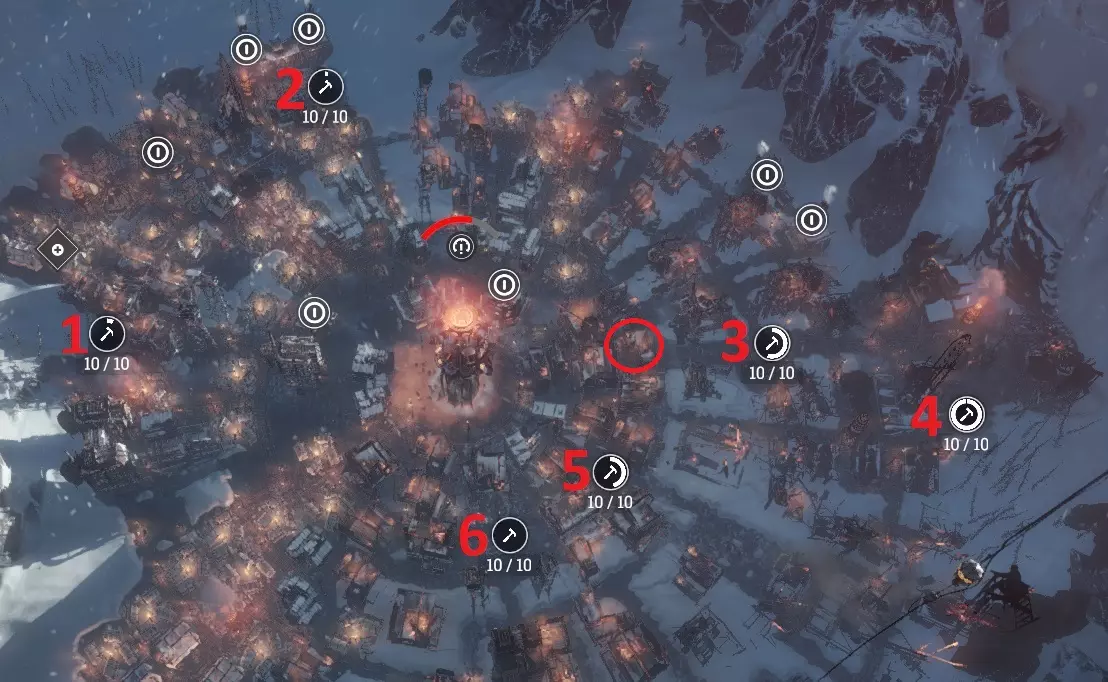 【红色标记的是需要开发的废墟】。未来将在这些废墟的位置建造采集站。 在生产区域,将工人安排到所有位于蒸汽中心热辐射范围内的废墟上。 其余工人分配到发电机附近的废墟。 首批6个采集站的建造方案: