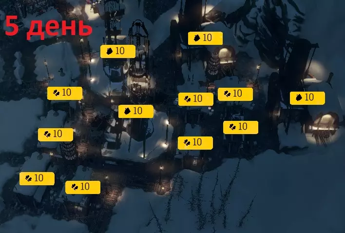 Прохождение (Выживание) Данное руководство написано для идеального прохождения сценария: вся Карта исследована, все Каюты построены, спасено 500 человек. 1 ДЕНЬПервым делом сносим лишние улицы и быстро расстраиваемся. Переключаем режим работы двух Паровых центров, греющих производственные здания, с 08:00-18:00. Паровой центр, который распространяется только на Руины сносим, как и Арену возле Генератора. Как только построится Снежная яма, сносим яму рядом с Генератором (освобождает рабочих). 1) Создаем отряд Разведчиков и отправляем в Метеостанцию. 2) Закон: Радикальное лечение. 3) Исследуем: Быстрый сбор. 4) Строим (сразу): 4 Санитарных пункта, 2 Паровых центра (Палатки 1 и 3), 2 Мастерских (сверху Лесопилки), Снежная яма (за тепловой зоной). 5) Работники (детей на тяжелые работы не ставим): •На 100% должны работать 1 Кухня, Лесопилка, 2 Угледобытчика, все Посты добычи, Сталелитейный завод. •В Паб ставим 1 рабочего. •15 рабочих ставим на Кучи угля образованных Угледобытчиком №1. •Остальных рабочих распределяем по Руинам в Тепловых зонах (подробнее смотри выше в разделе «Строительство») 6) Строим (днем): 2 Охотничьих хижины. 7) Исследуем: Воздушные охотники. 8) Строим (вечер): Склад (Уголь), Стенной бур, Паровой центр (Палатки 2), 2 Санитарных пункта, 6 Постов добычи, 2 Мастерских, 7 Палаток. 9) Сносим: 5 Палаток (вне Тепловых зон). 10) Перестраиваем: Паровой центр у Сталелитейного завода переносим так, чтобы отапливалось место под 2 завод. 10) Закон: Трансплантация органов. 2 ДЕНЬПо мере разработки Руин строим новые Посты добычи. По Постам добычи раскидываем детей, рабочие понадобятся для добычи еды. Обязательно ставим разрабатывать Кучи угля, которые скопилось возле Угледобытчиков + ставим рабочих на Руины, закрывающие место для 2-го Сталелитейного завода. 1) Строим (днем): 3 Охотничьих хижины,4 Охотничьих Ангара. 2) Исследуем: Повышение эффект. генератора I. 3) Перестраиваем: оставшиеся Палатки в Тепловые зоны. 4) Строим: Склад (дерево). 3 ДЕНЬВ течении дня перестраиваем 4 Охотничьи хижины в Охотничьи ангары (кроме Хижин, что находятся в Тепловых зонах). 1) Закон: Дружина. 2) Строим (днем): Сталелитейный завод №2. 3) Исследуем: Паровой сталелитейный завод. 4) Строим (вечер): Угледобытчик №3 + Пост добычи, 2 Дозорные башни, Склад,3 дополнительных Поста добычи. 4 ДЕНЬ1) Исследуем: Паровой угледобытчик. 2) Перестраиваем: 3 Охотничьи хижины в Охотничьи ангары. 3) Строим: Паровой сталелитейный завод №1 и №2, 4 Мастерских, 3 Палатки, Склад. 4) Закон: Утренний сбор. 5) Сносим: Лесопилка. 5 ДЕНЬНа этом дне болезнь отступает и освободившихся Инженеров переставляем в Мастерские. Далее строим Склады по мере накопления ресурсов. 1) Исследуем: Термоизоляция поста добычи. 3) Строим: 6 Мастерских, Охотничий ангар. 4) Закон: Бригадир. 5) Разведчики: Дредноут. 6) Перестраиваем: 3 Угледобытчика в Паровые угледобытчики + добавляем к ним Посты добычи (5 шт.), 2 Палатки. 6 ДЕНЬПостоянно используем Бригадира на Сталелитейных заводах, Стенном буре, Лесопилках, Мастерских, Фабрики. 1) Исследуем: Эффективный сбор. 2) После того, как в город придет отряд с Аванпоста, перестраиваем его на добычу стали. 3) Закон: Сторожевые посты. 4) Исследуем: 4 уровень технологий. 5) Сносим: Охотничью хижину возле Генератора. 6) Строим: 2 Сторожевых поста, Охотничий ангар, 2 Мастерских. 7 ДЕНЬ1) Исследуем: Быстрые отряды аванпостов (НЕ НУЖНО!) 2) Исследуем: Фабрика. 3)