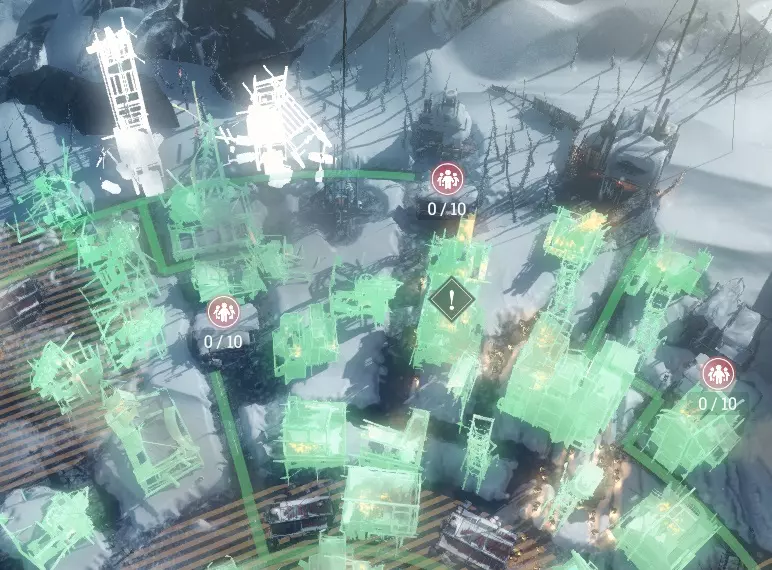 第三阶段的主要问题是发电机故障及其异常情况: 1. 第13天01:00发生故障 - 无异常 2. 第16天01:00发生故障 - 热区半径减小至90% 3. 第20天01:00发生故障 - 热区半径减小至80% + 所有热区温度降低1级 4. 第23天01:00发生故障 - 热区半径减小至70% + 所有热区温度降低2级 第一和第二阶段需立即执行在完成第三阶段的第一阶段后,会出现一个选择:告诉人们真相还是撒谎。原则上两条路线都可以走,差异不是很大,但选择真相的话,建筑物的生产效率会降低10%,而且市民离开城市的随机事件会多很多,所以选择撒谎的路线更有利。要满足所有勒索者的要求。 建造好疏散中心后,不要急于派遣工程师。16日之前,安心探索所有必要内容。修复发电机的第二次故障后,派遣25名工程师前往【无畏舰】。 提供100份木材以改善厨房运作。将所有人派往【无畏舰】。从17日开始,派遣满编的 evacuation groups,包括资源和人员。如果没有把握,最好优先给【无畏舰】补充燃料,以便在危急情况下直接完成任务。在第20天,为了避免谎言被揭穿,要杀死4名工程师。如果不这样做,我们可能无法重建所有甲板,因为由于随机事件,城里的所有工程师都可能离开。在这种情况下,我认为这样做是合适的,不可能拯救所有人,那些留在城里的人反正也会死去。建造 尽管废墟众多,但建造过程非常简单。为了避免出现问题,首先需要仔细勘察地形,以便轻松确定方位。