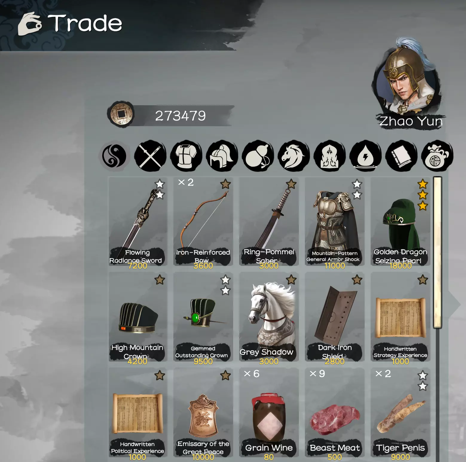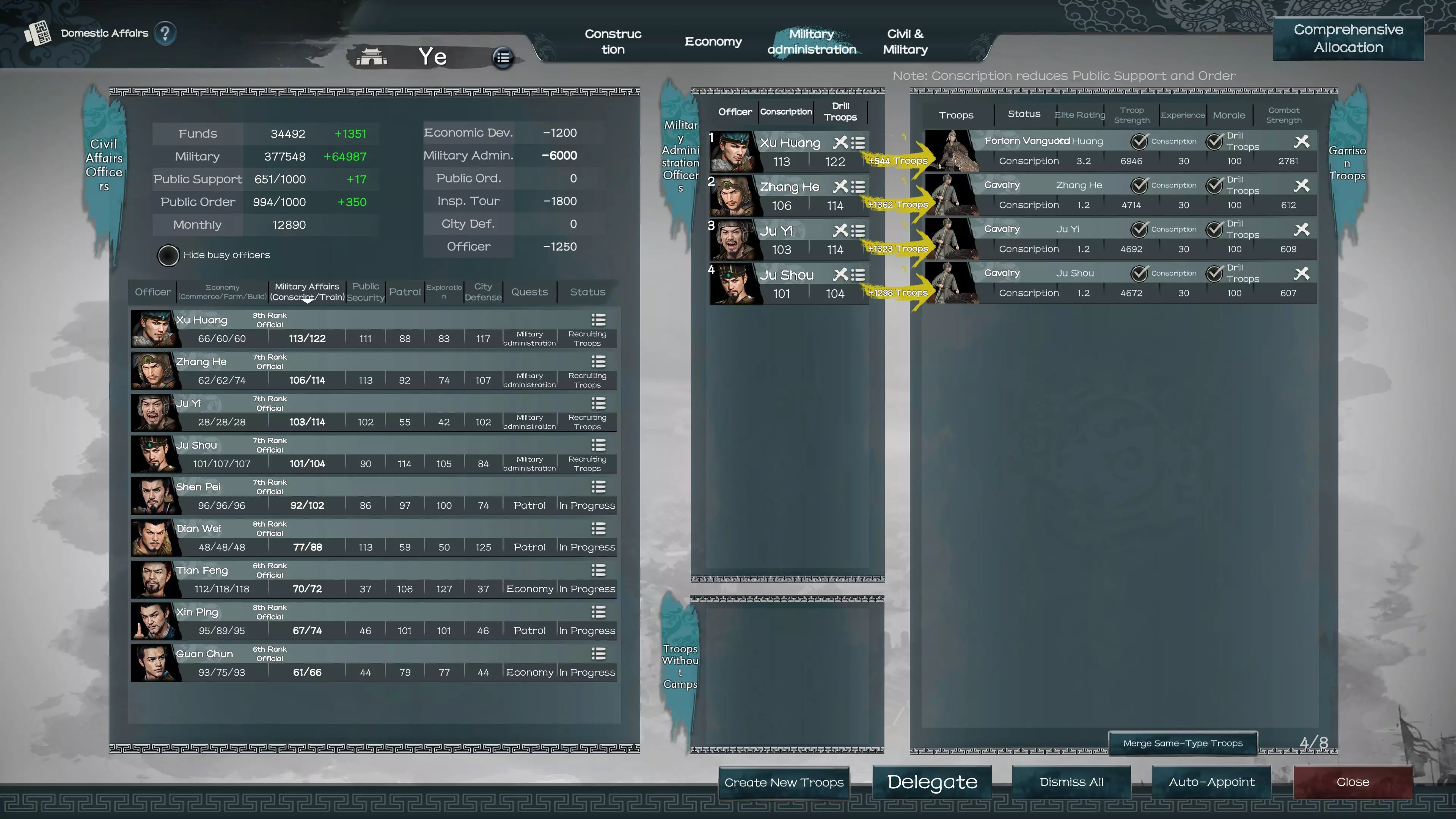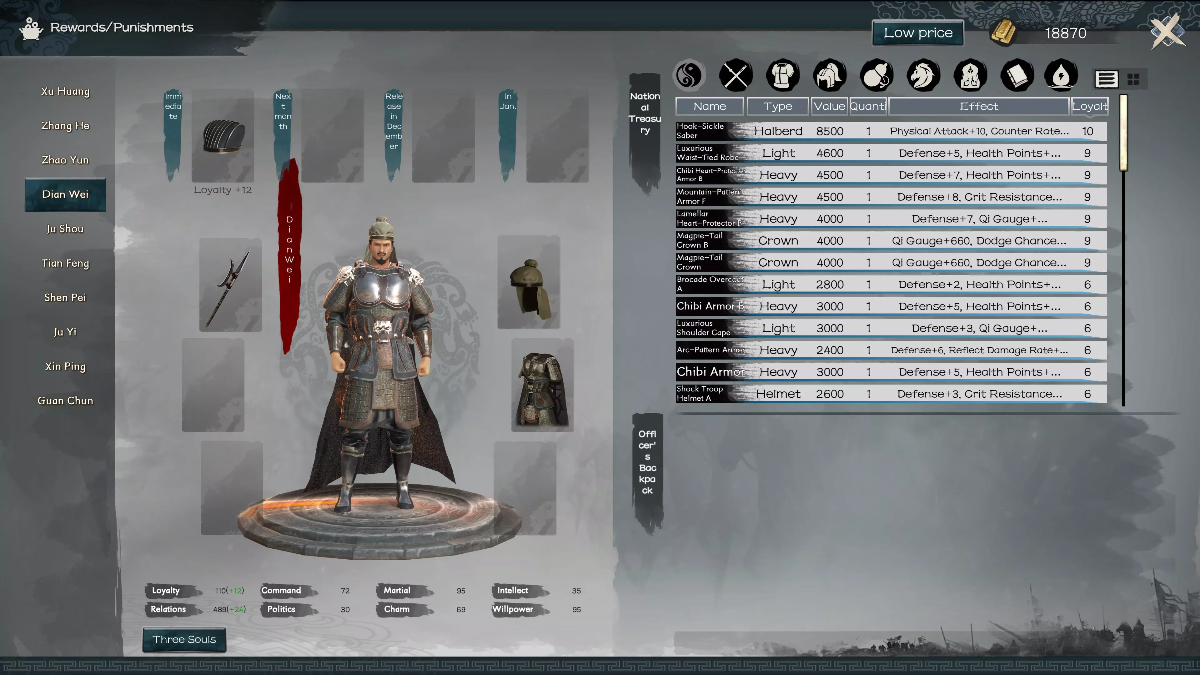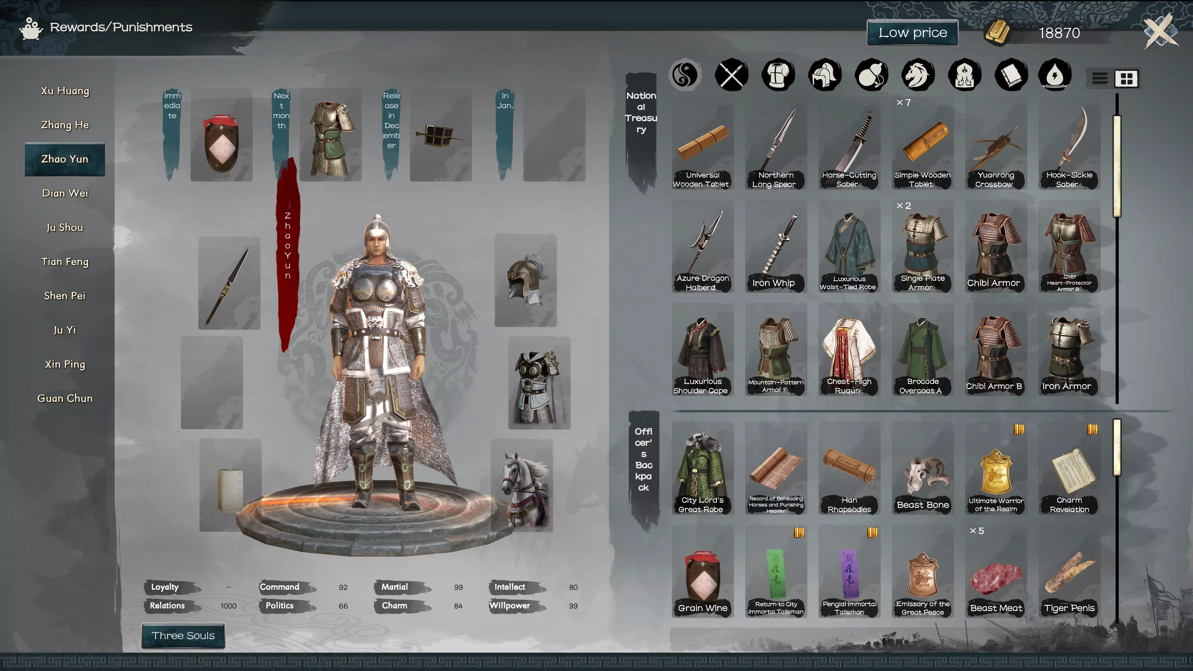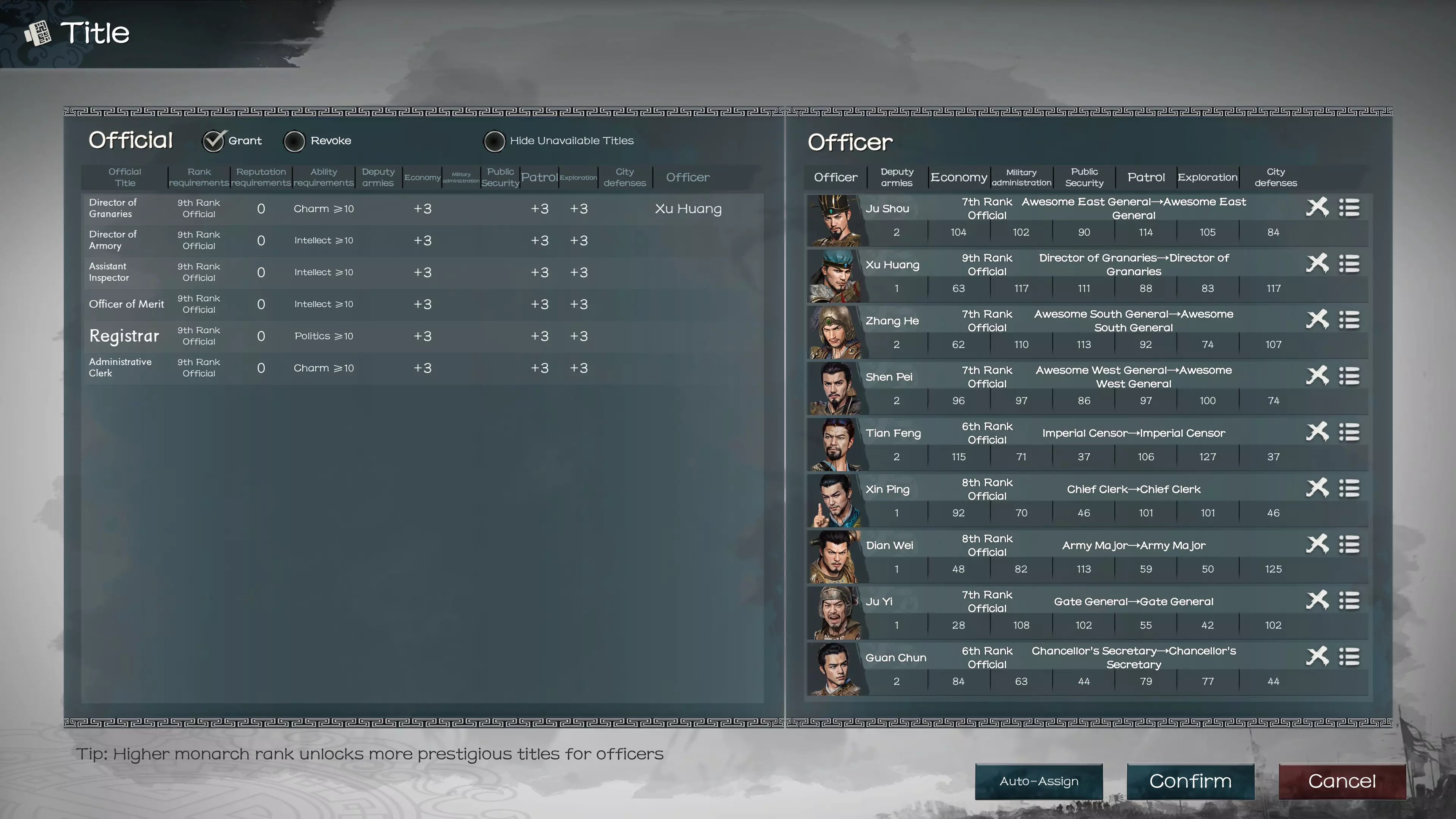 随着你的等级提升以及主角获得更高的朝廷官阶,你将在列表中看到更多可授予或撤销麾下武将的头衔。强烈建议你在开始时使用自动分配功能。 调整三魂:在这里你可以更换战斗卡牌和战斗风格类型。 叛乱:除非你一开始就采用这种策略,否则你可能不会这么做。 禅让:如果你招募到了更想作为主角的武将,可以进行禅让。要求:与该武将的关系达到+5。 处决与流放:你可以处决或流放囚犯以及自己的武将。 编辑监察区域:必须拥有官阶2级的武将才能任命其管理帝国的区域。 任命太守:必须拥有官阶5级或更低官阶的武将才能任命其治理一座城市。奖惩机制:【此处为你的国家宝藏所在位置】