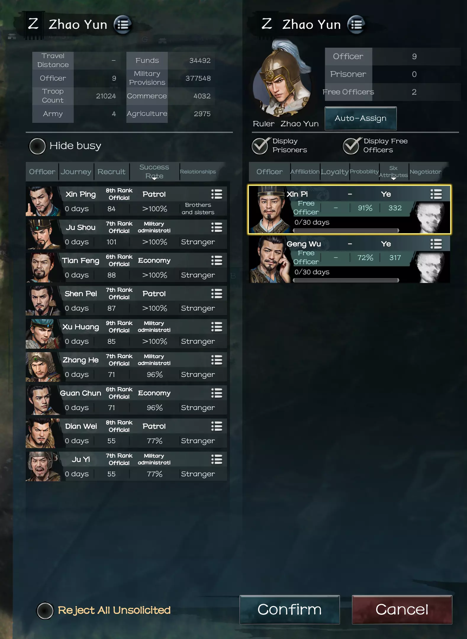 这是招募界面。需要注意的几点是成功率数值,这是一个总体的百分比概率。两名角色之间的关系会影响该数值。左侧的辛评是我的武将,他是右侧辛毗的兄弟。如果你更改右侧的选择,左侧的数值也会随之变化。 另外我喜欢用这个面板直接进入特定武将的页面。假设我的某个武将的角色信息有需要查看的内容,我可以在这个界面点击三行公告图标,直接进入该角色的页面,无需经过任何对话菜单。