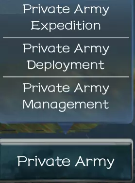 私人军队远征: 在此处可在世界地图上部署你的私人军队。 私人军队部署: 在此处可更改你的私人军队驻扎的城市。 私人军队管理: 在此处可对私人军队进行调整。 提示