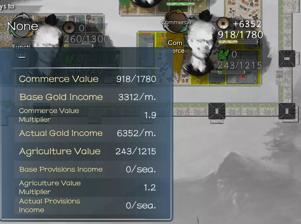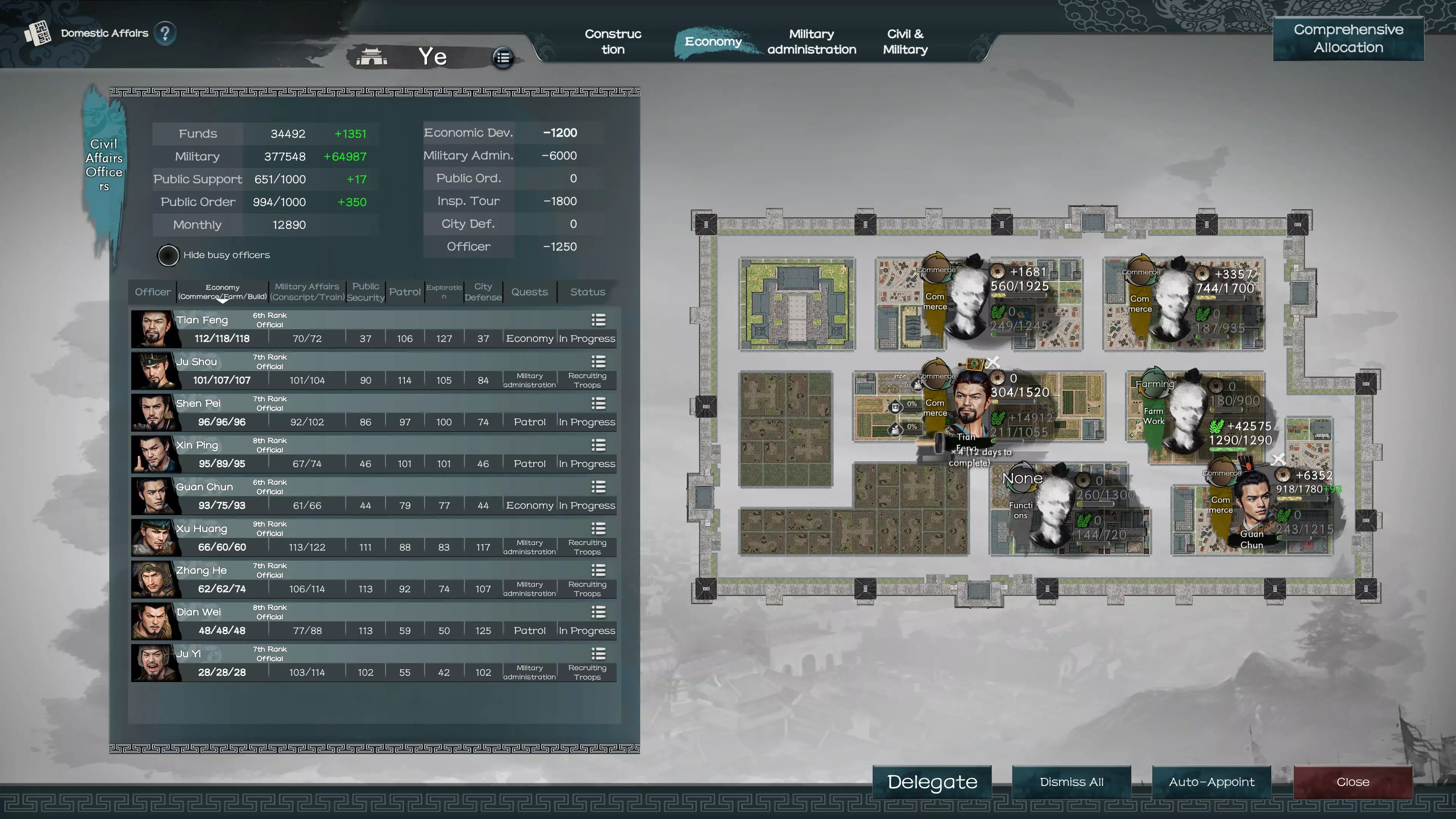 这是内政区域的经济界面标签页。在此区域中,你需要为商业/农业/建设选择分配官员。显示的三个数字分别对应这三个领域。如果我任命像田丰这样高商业属性的官员,他将提供112金币加成,并使该区域的任何建设速度提升118。