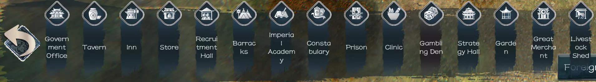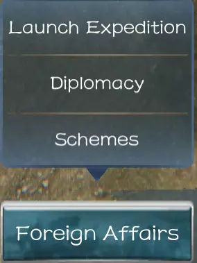 启动远征:在此处可与你的武将和军队组建世界地图队伍。 外交:在此处可查看各势力间的关系。 计谋:在此处可执行以下操作: 秘密谈判 救援 暗杀 内政